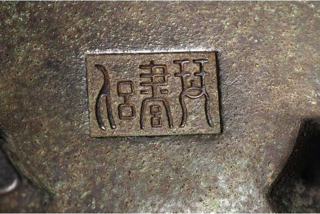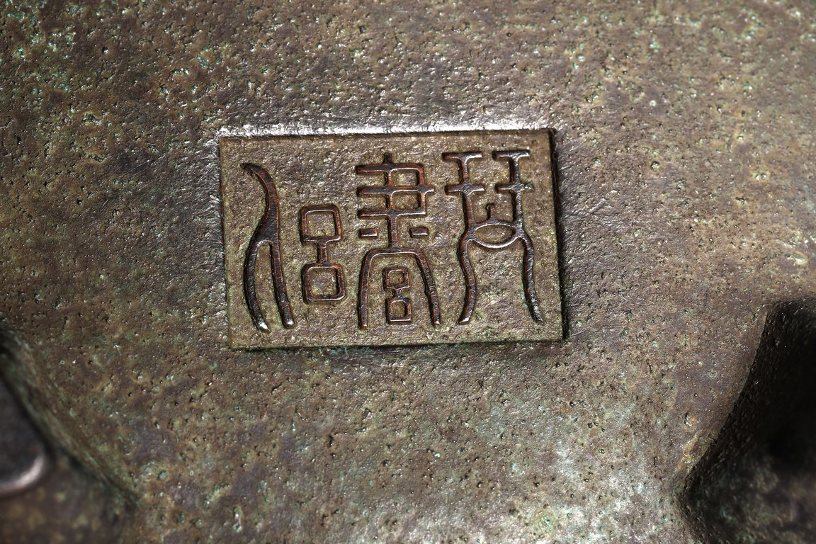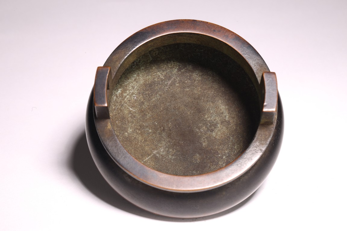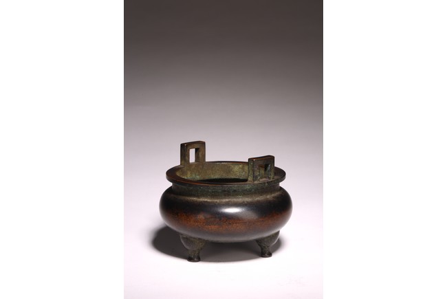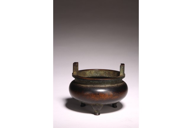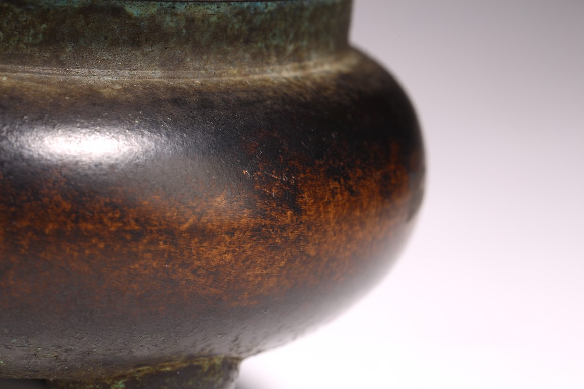 形體飽滿,雙耳峻峭,耳孔爲長方形,雙衝天耳,束頸鼓腹,下承三足,足 端外撇。皮色呈黑漆色,寶光溢彩,底部書“ 琴書侶”款識,筆力遒勁,其銅 質細膩精煉,入手沈墜,陳設于室可賞其形,品香論道可取其神,堪稱神形兼備。