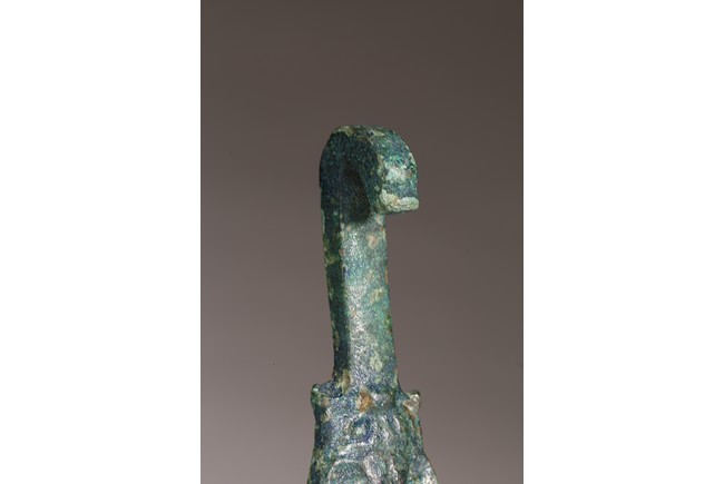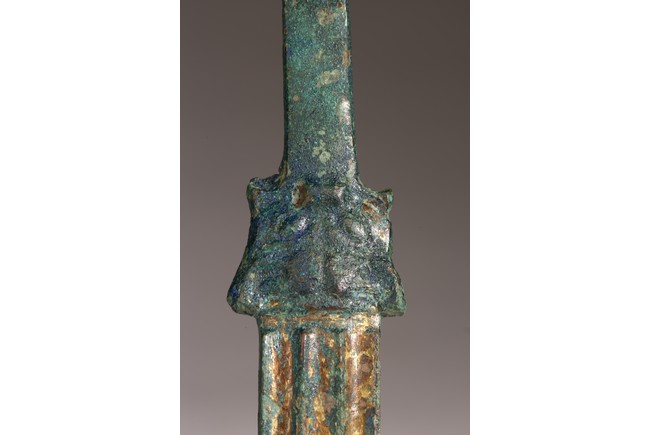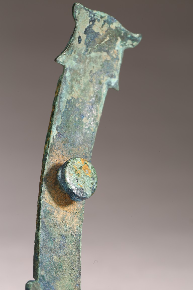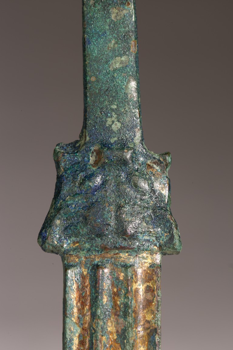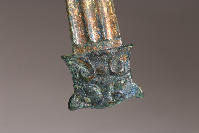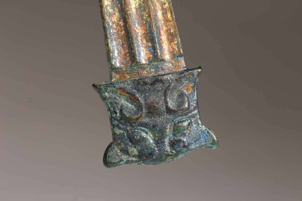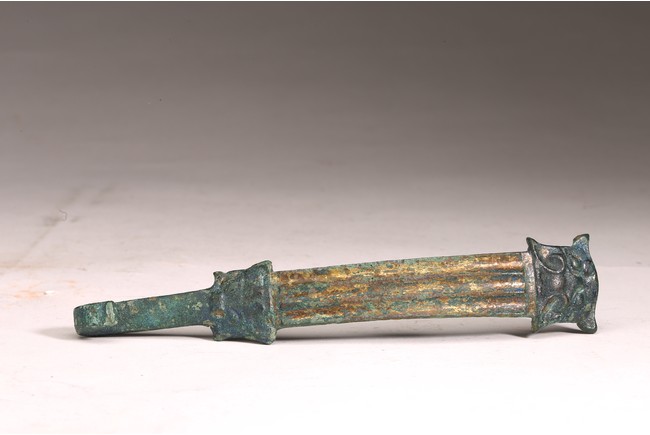 Han Dynasty period. Cast with a fluted shaft set with a taotie mask at each end.