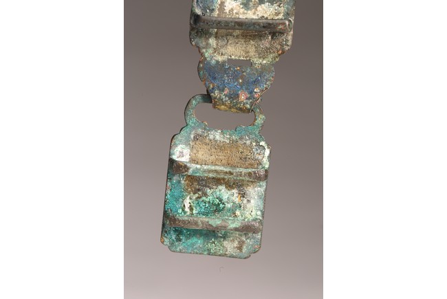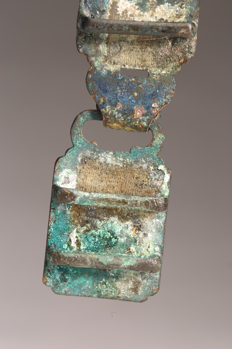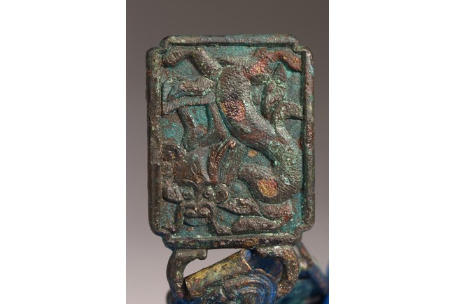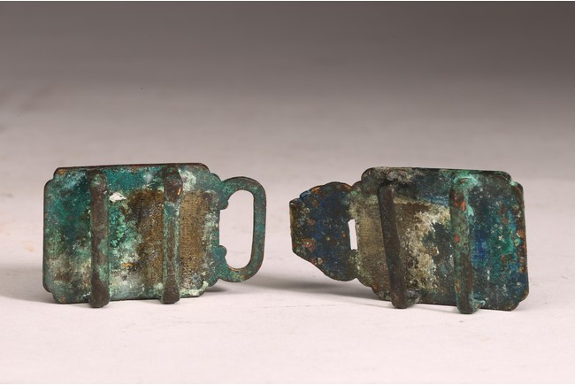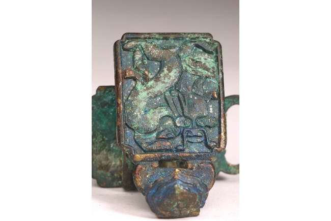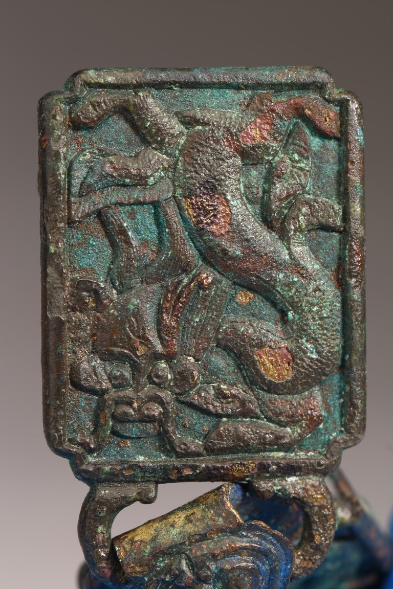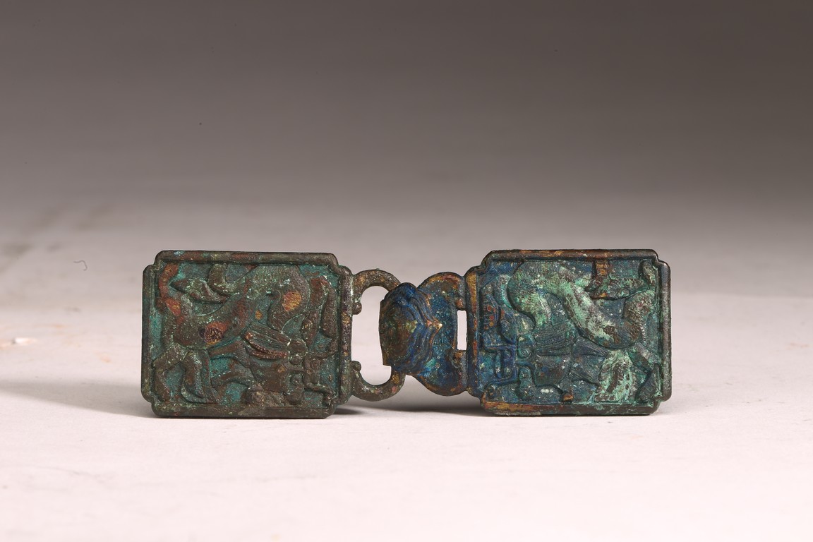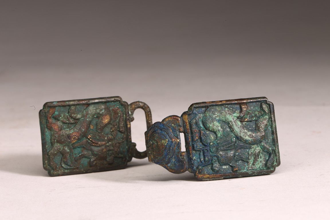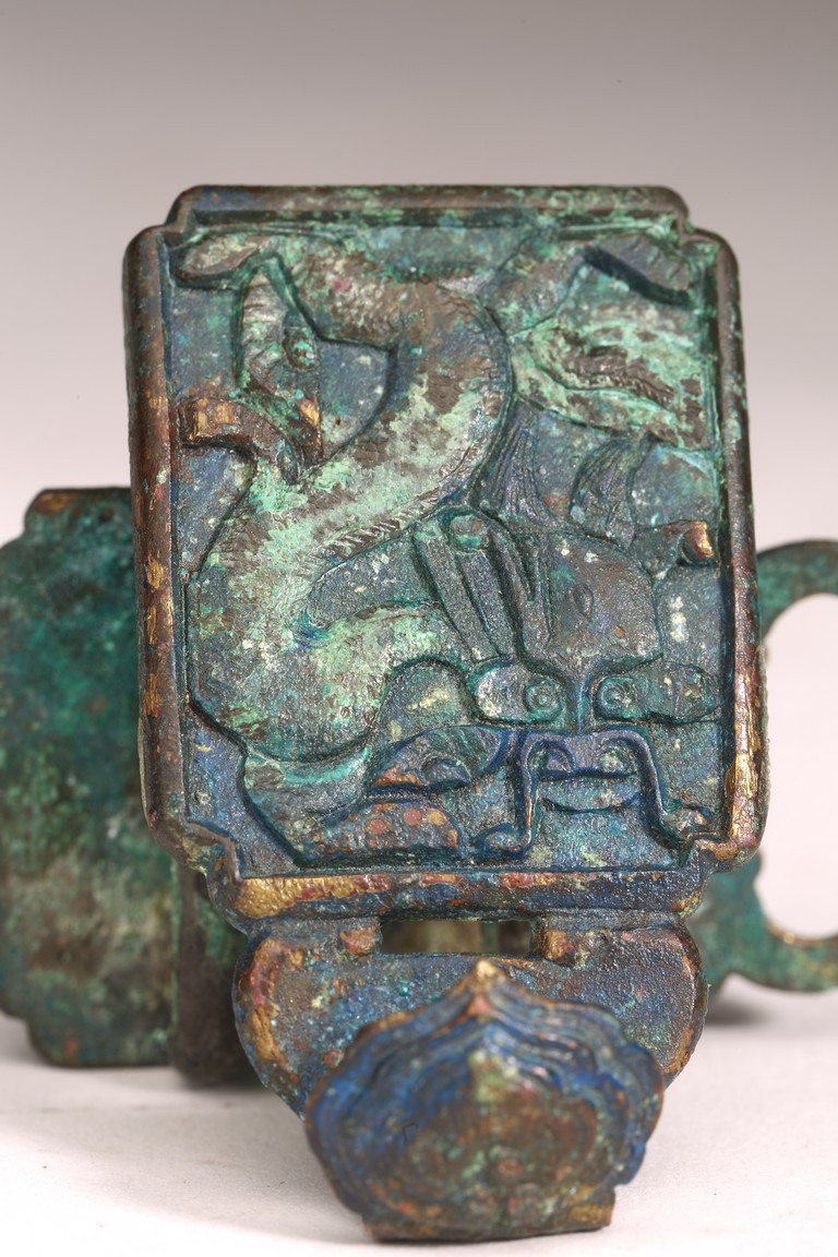 Liao Dynasty period. Comprising of two pieces cast in relief with mythical beasts, with aga appropriate green patina.