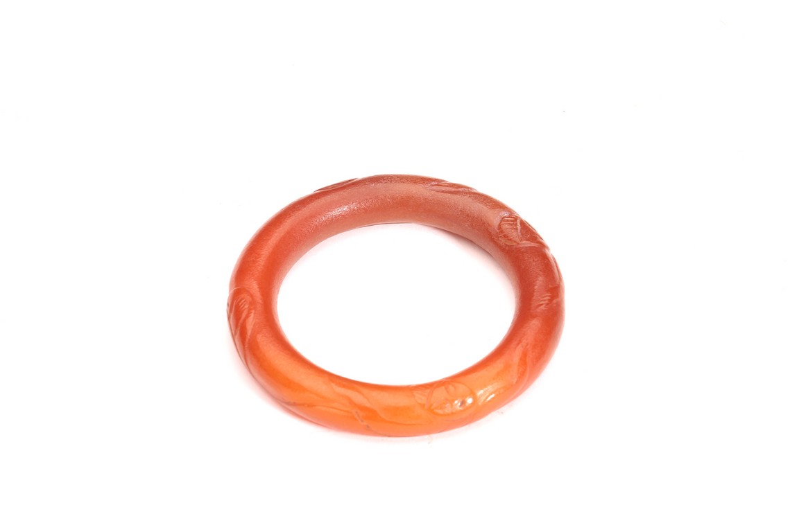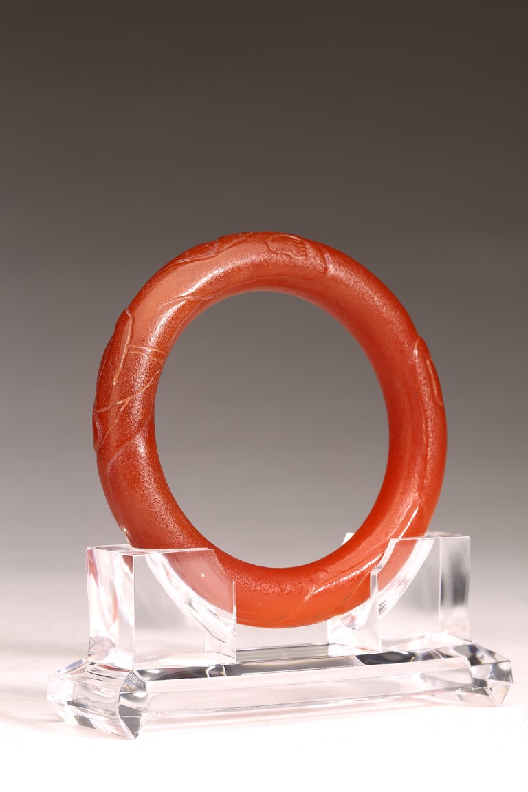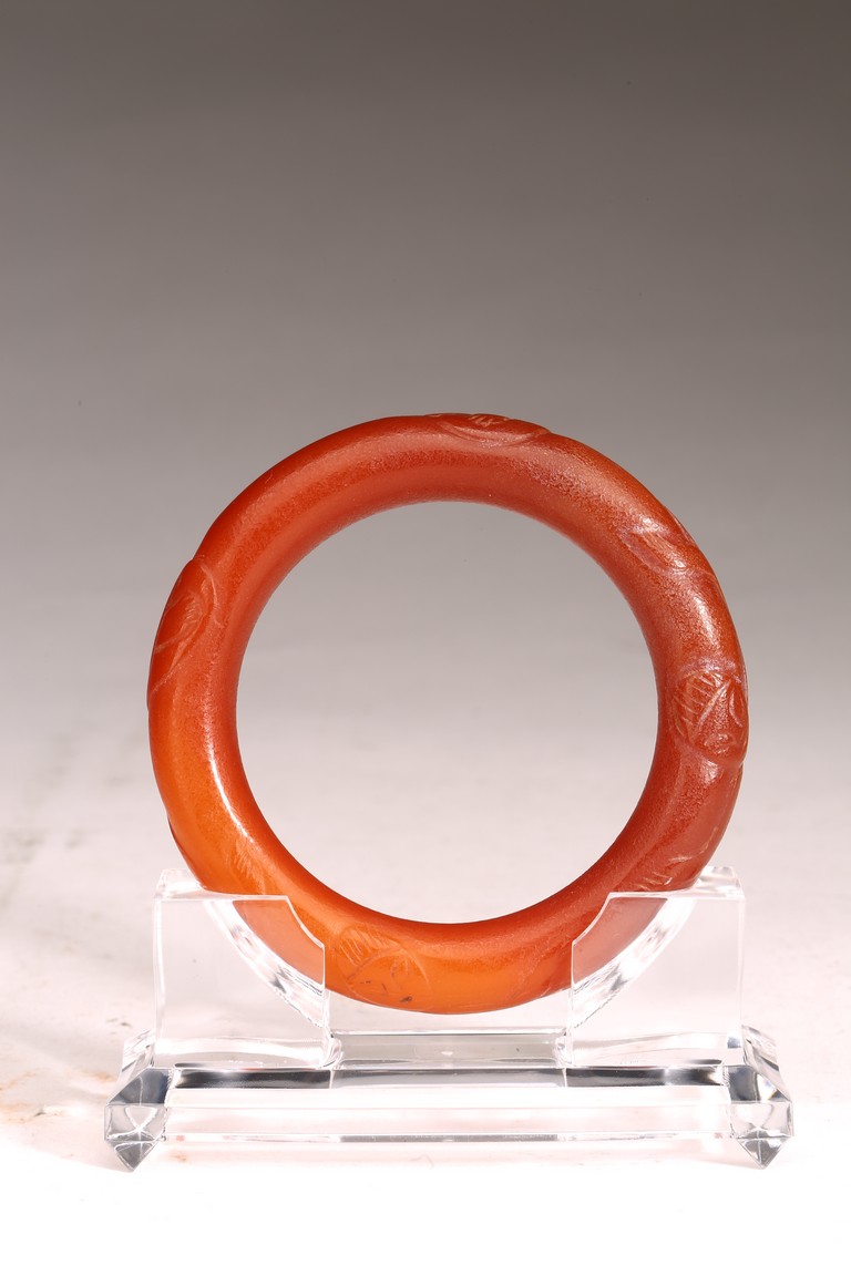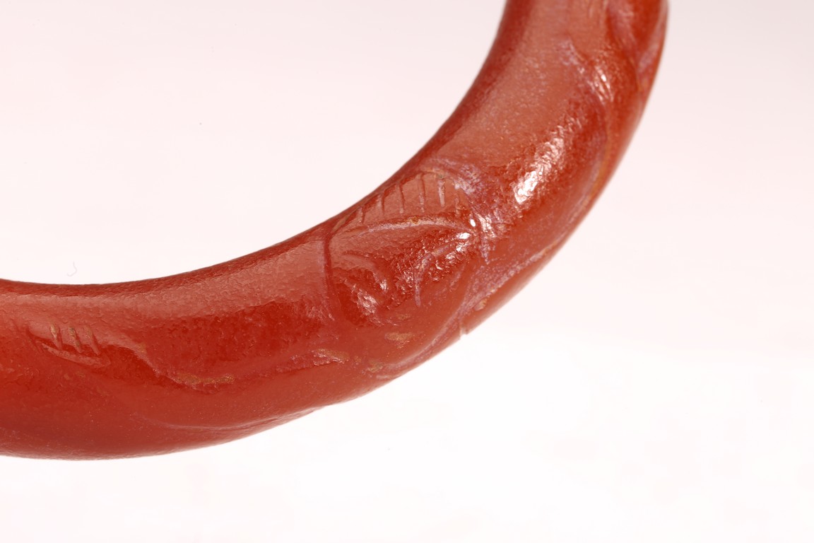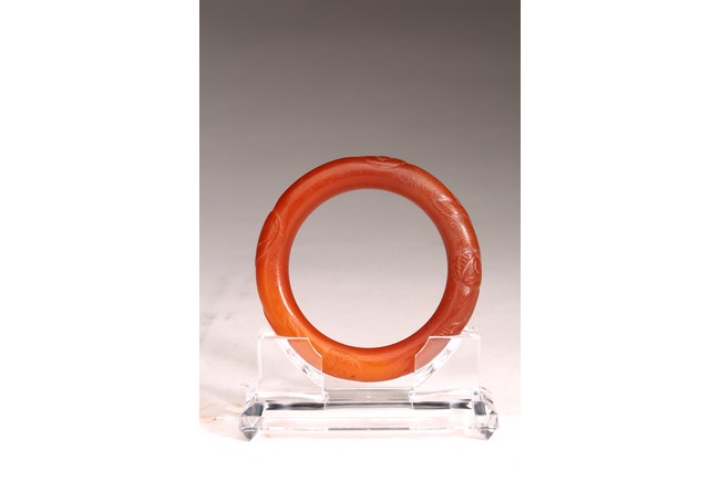 Qing Dynasty period. The bangle carved with raised decorations, the stone is of opaque red tone.