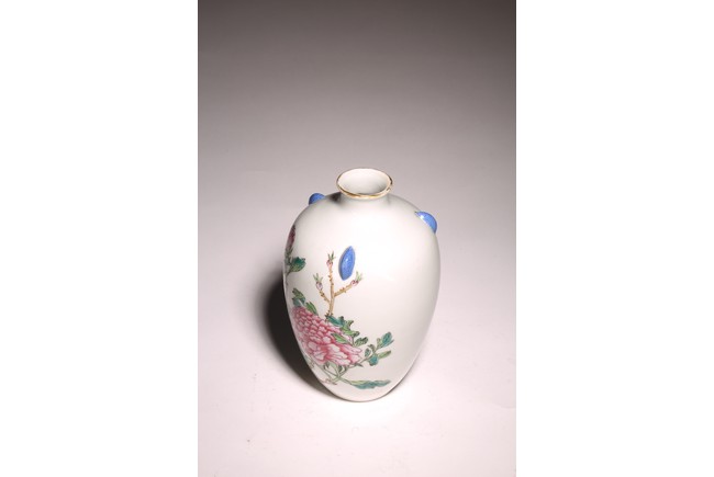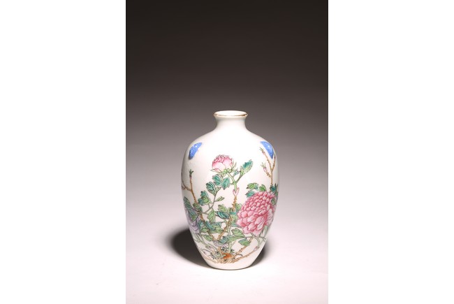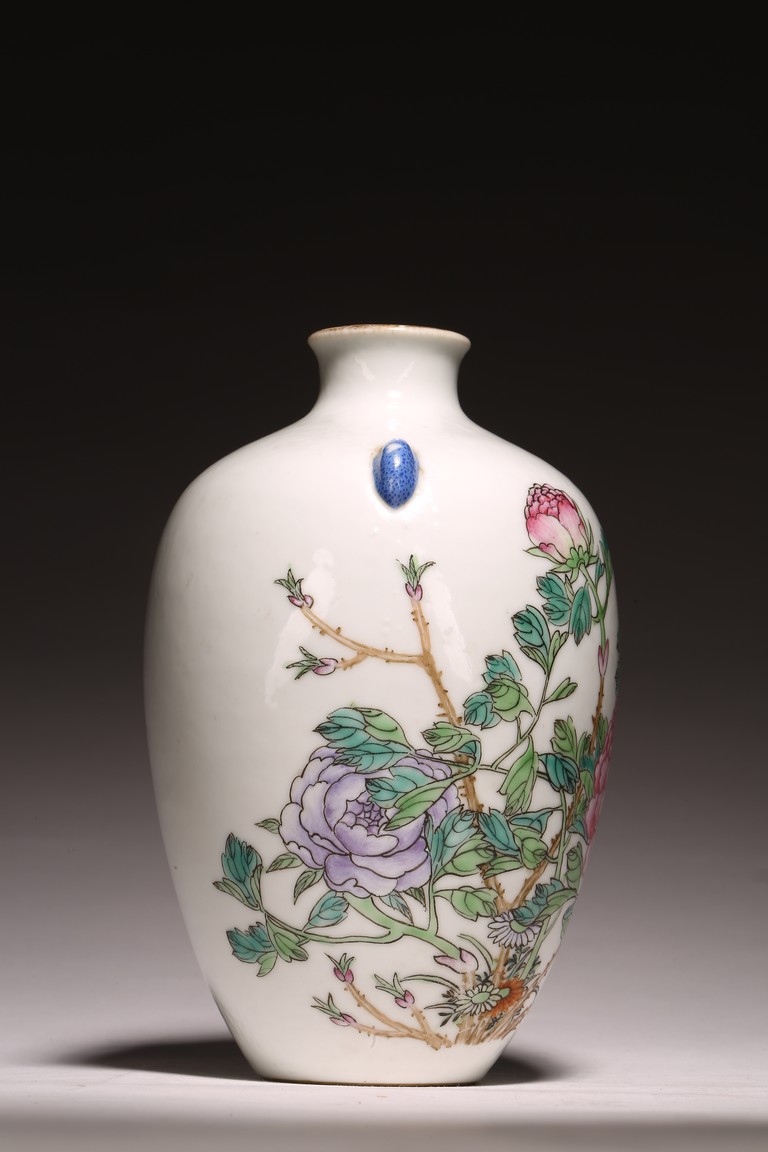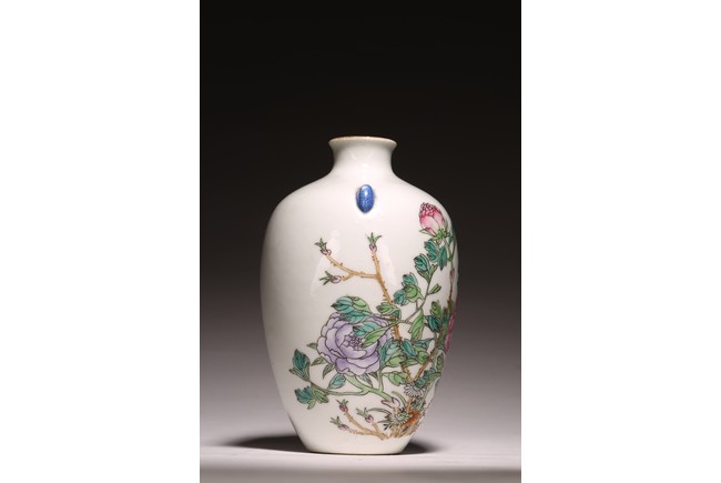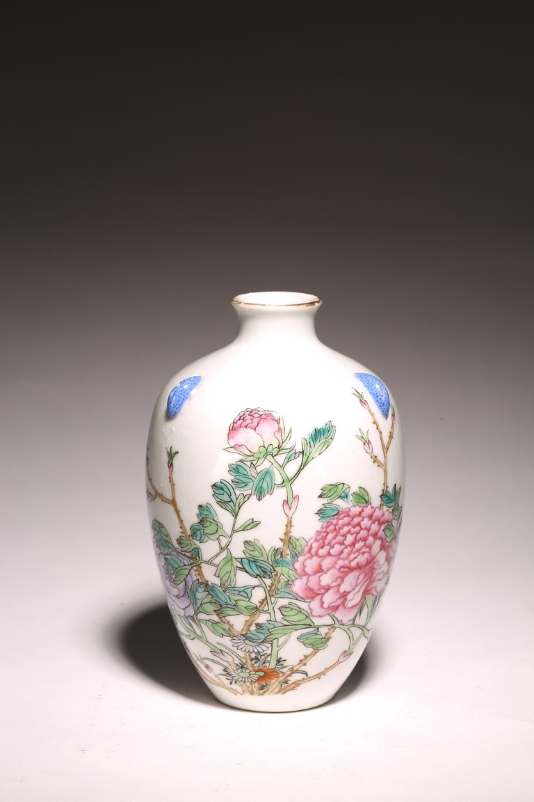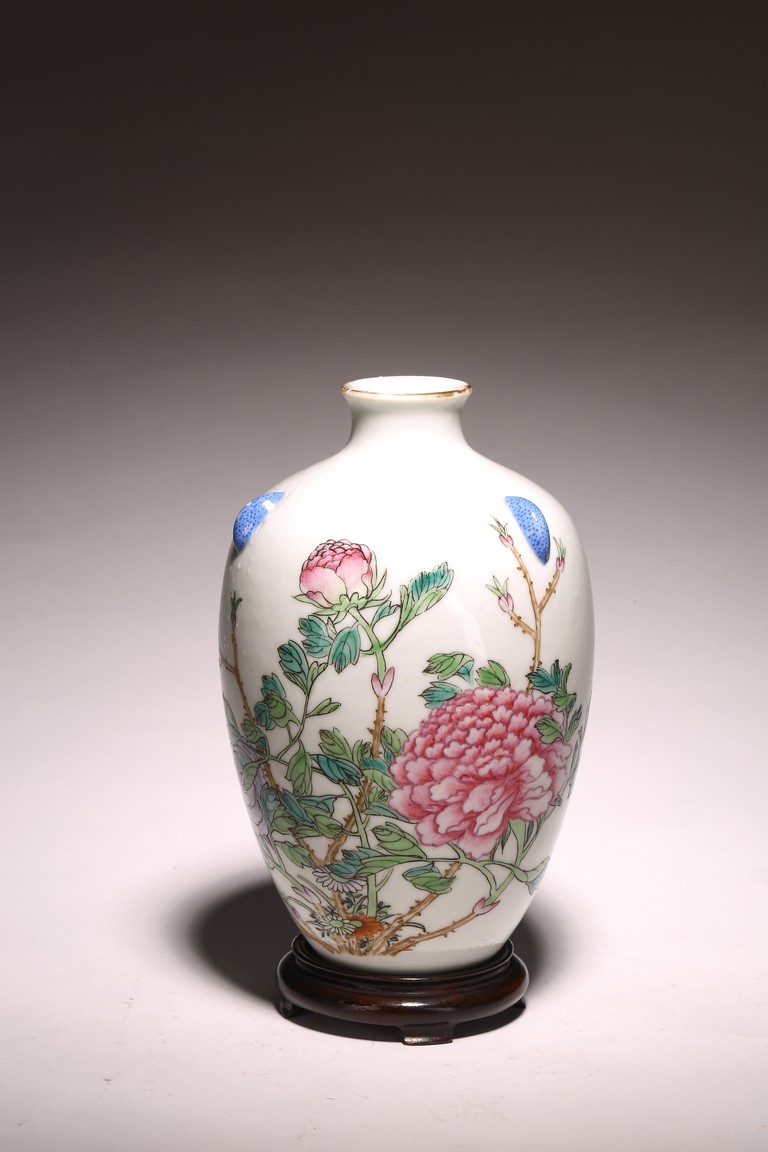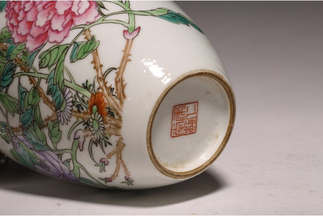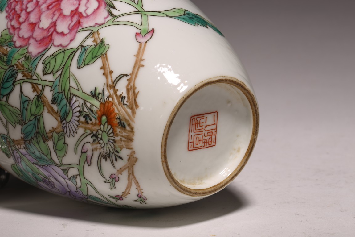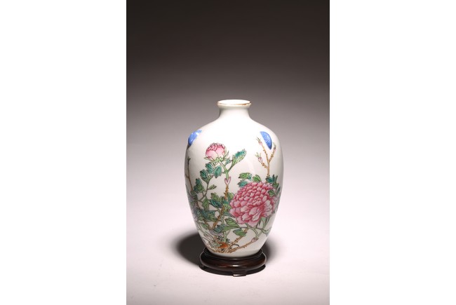 小口,微敞口,束頸,鼓腹漸下收,圈足。口沿描金,器身粉 彩繪“花卉紋”,描繪細膩,填色准確,層次分明,用色極爲豐富, 色澤豔麗,重叠交錯。“居仁堂制”款識。帶木座(“居仁堂”原名海宴樓,爲慈禧太後所建。袁世凱稱帝後,將該殿作爲寓所,並 改名爲“居仁堂”。“居仁堂制”款瓷,爲正宗“洪憲”瓷。)