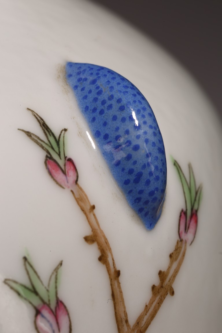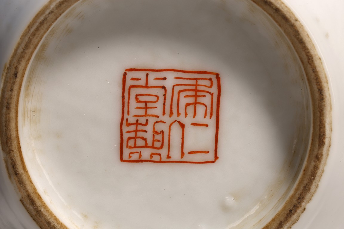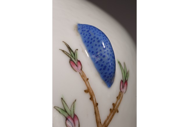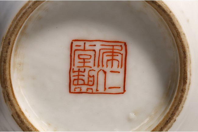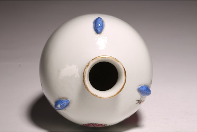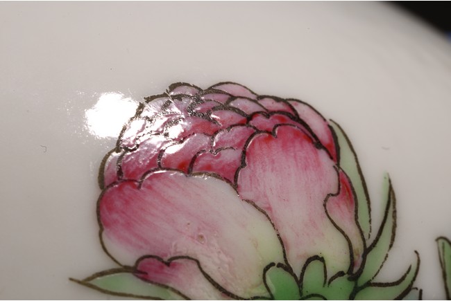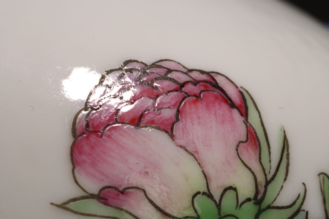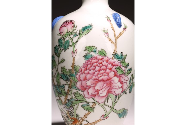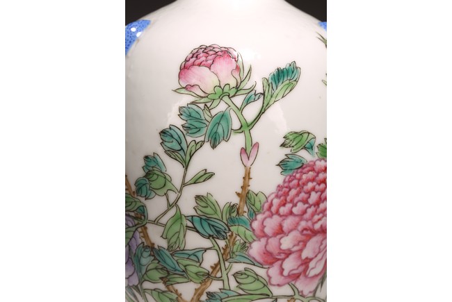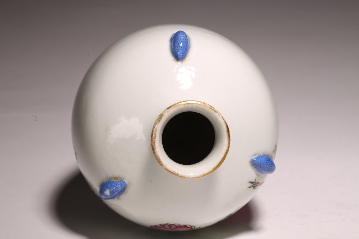 小口,微敞口,束頸,鼓腹漸下收,圈足。口沿描金,器身粉 彩繪“花卉紋”,描繪細膩,填色准確,層次分明,用色極爲豐富, 色澤豔麗,重叠交錯。“居仁堂制”款識。帶木座(“居仁堂”原名海宴樓,爲慈禧太後所建。袁世凱稱帝後,將該殿作爲寓所,並 改名爲“居仁堂”。“居仁堂制”款瓷,爲正宗“洪憲”瓷。)