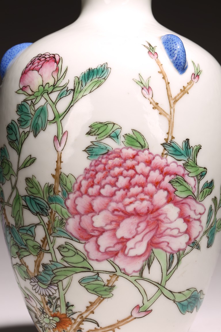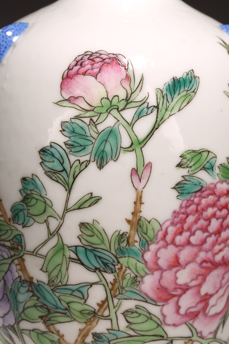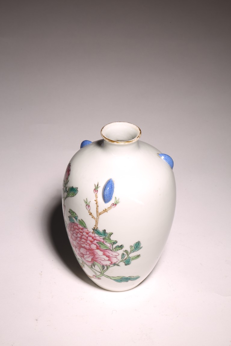 Late Qing Dynasty/Republic Period. Of elegant ovoid form with a flared mouth and short foot, the body finely enamelled in famille rose palette to depict flowering branches of peony extending upward, the neck with three protruding handles, the mouth rim painted in gilt, the base bears a three character 'Ju Reng Tang' mark.