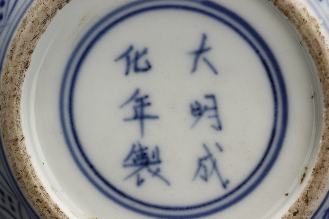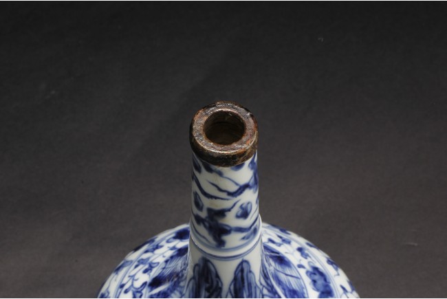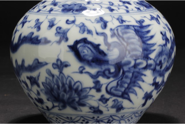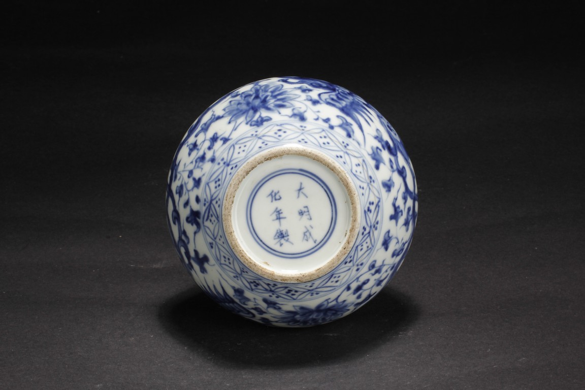 Of globular form, the exterior depicts flying phoenix and dragon amidst flowers and vines, between lappet patterns on shoulder and flower petal patterns at base, the straight long neck leads to a metal rim on top. Bottom bears six characters 'CHENGHUA' mark.