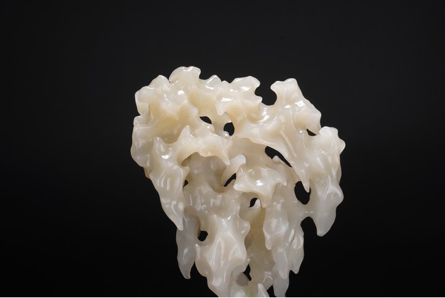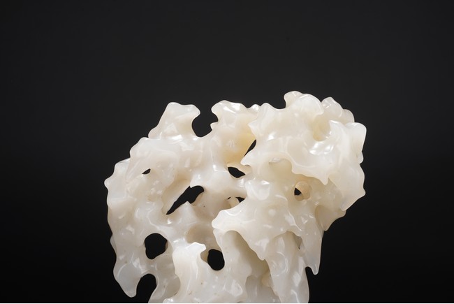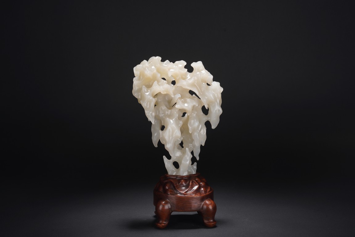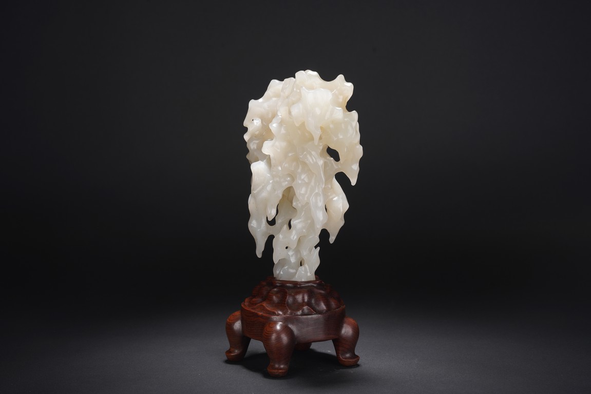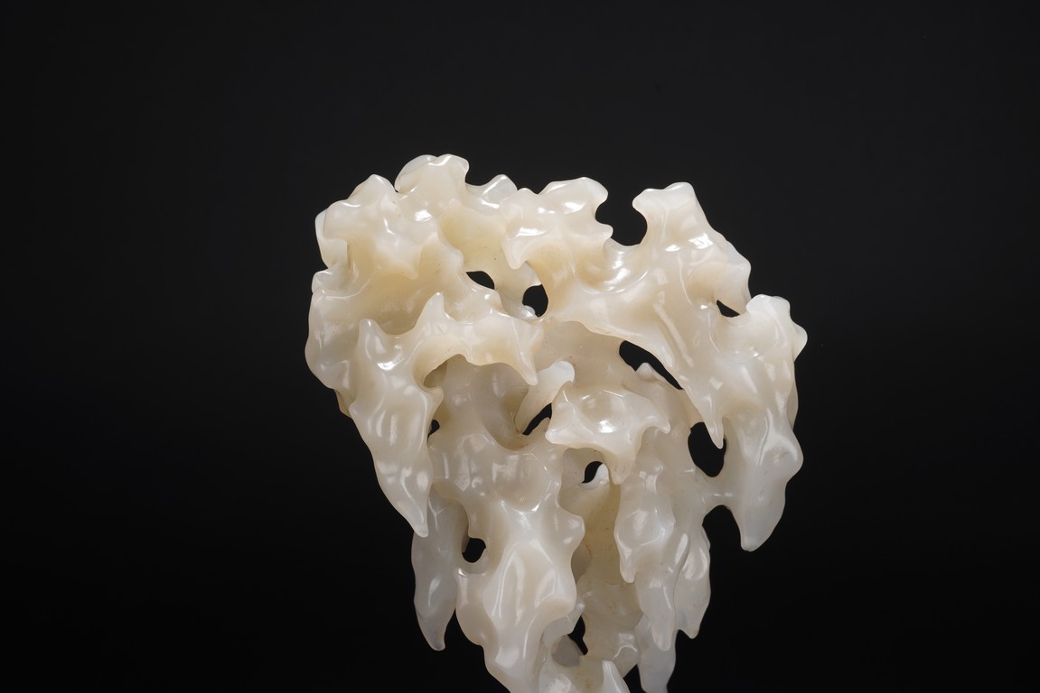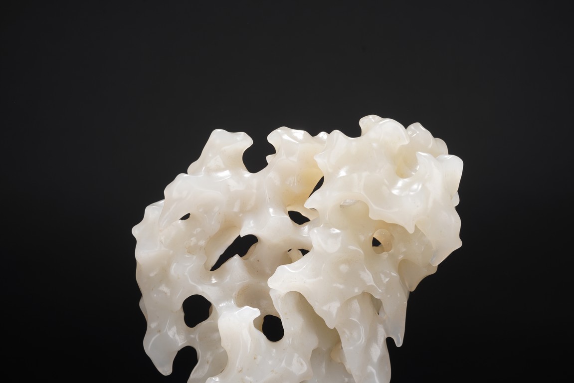 山子以和田玉仿作太湖石形,似太湖靈璧瘦皺通透,整體修長文氣,獨具特色。其質白潤,其形峻峭,妙地用和田玉來表現太湖石“瘦、皺、漏、透”的審美特征。 來源:奧勒岡州華盛頓縣私人藏家提供 Provenance: Property from a private collection, Washington County, Oregon