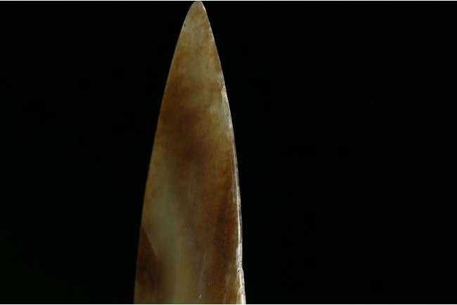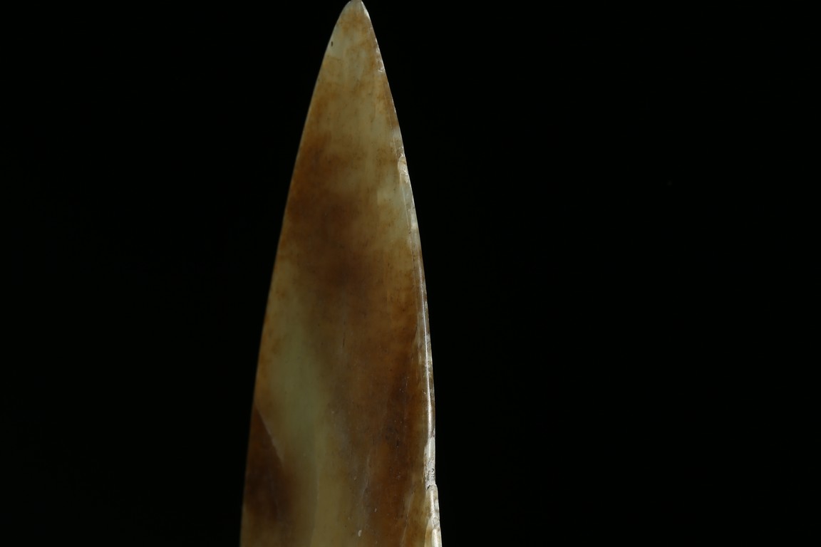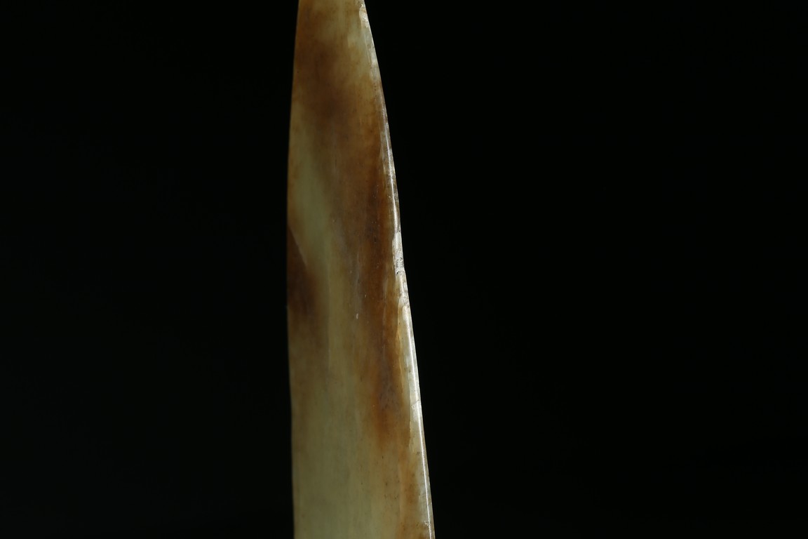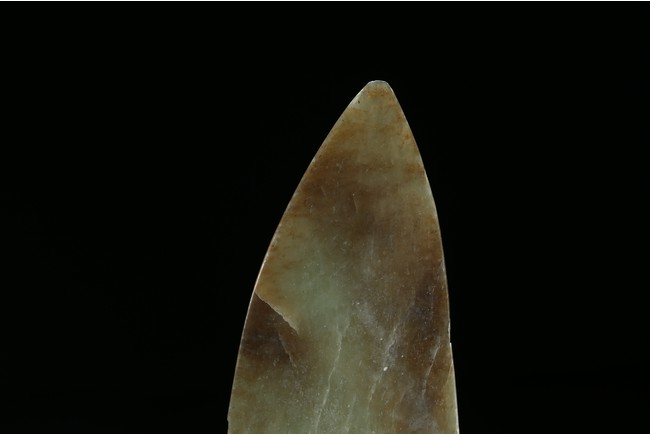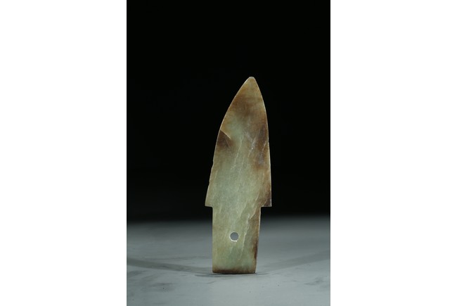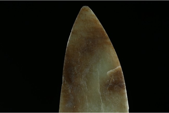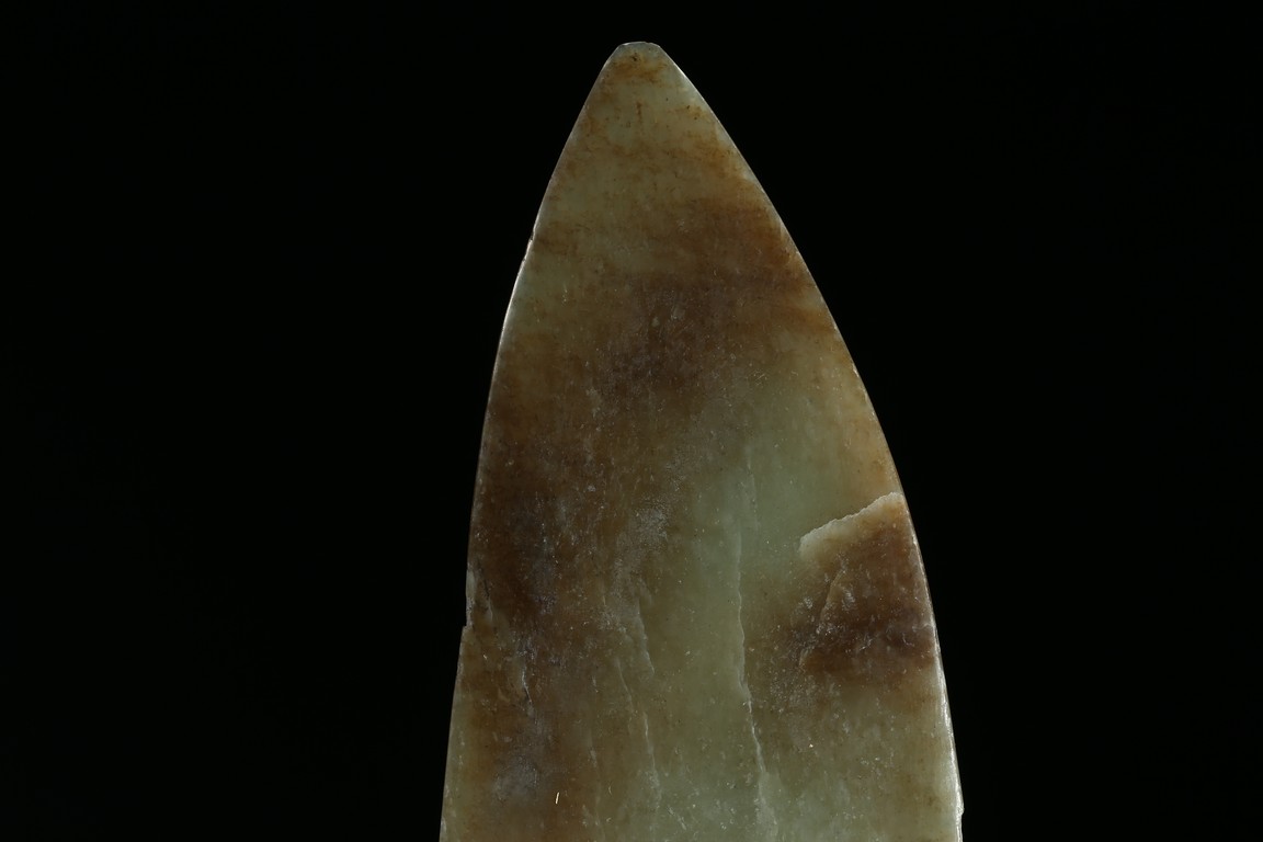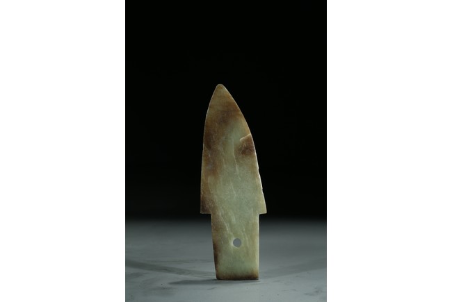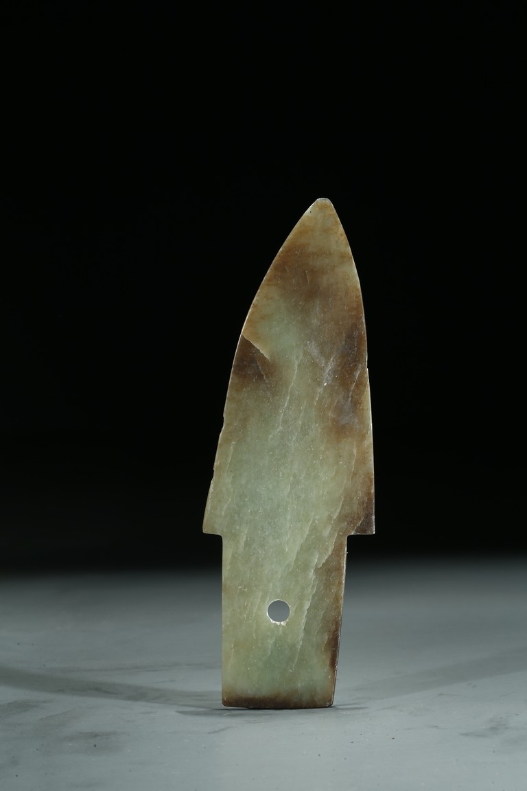 玉戈流行於商周時期,造型源自實戰兵器。本品通體受沁呈棕黃色,微透,鋒呈三角形,刃較鈍厚。援本部有一圓形穿孔,除此之外通體無紋飾,形制威嚴古拙,為商中晚期王侯級別之重器。