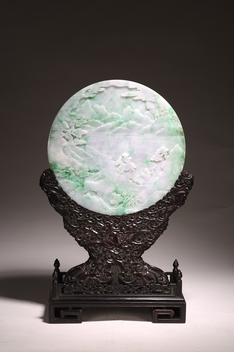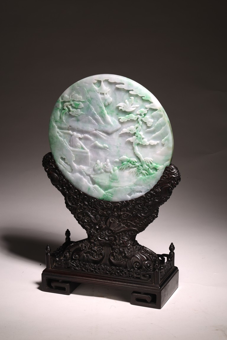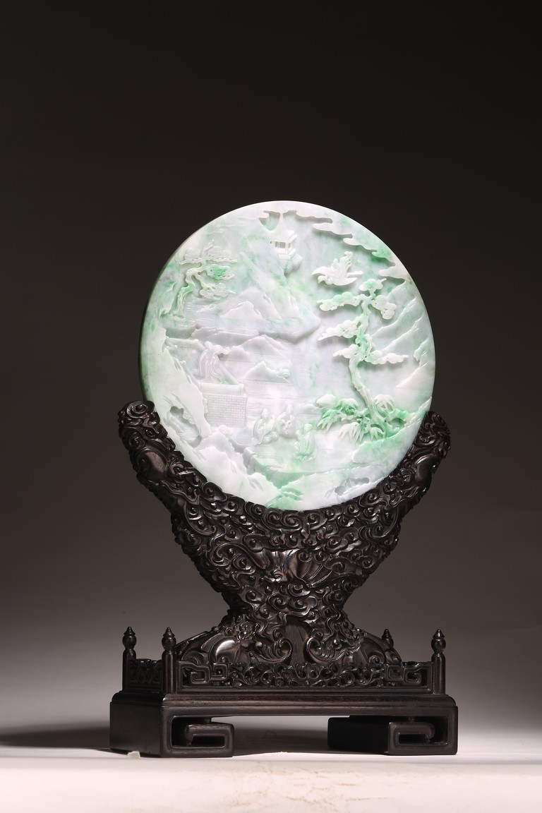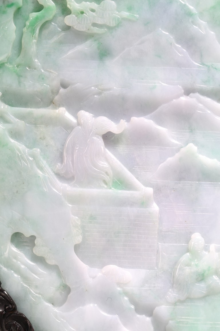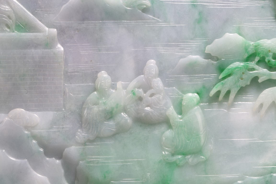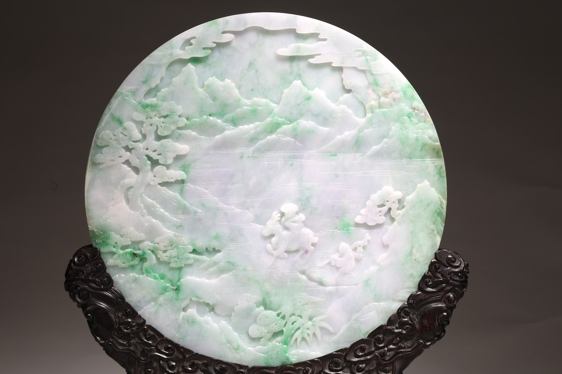 Qing Dynasty period. The jadeite panel carved to one side with three scholars gathering and sitting under a large pine tree growing from rocky outcrop, with pavilions and mountains to the near and far background; the reverse carved with a elderly man riding on deer followed by a young attendant, the stone is of mottled apple green and white tone, all supported on a delicately carved zitan stand.