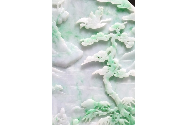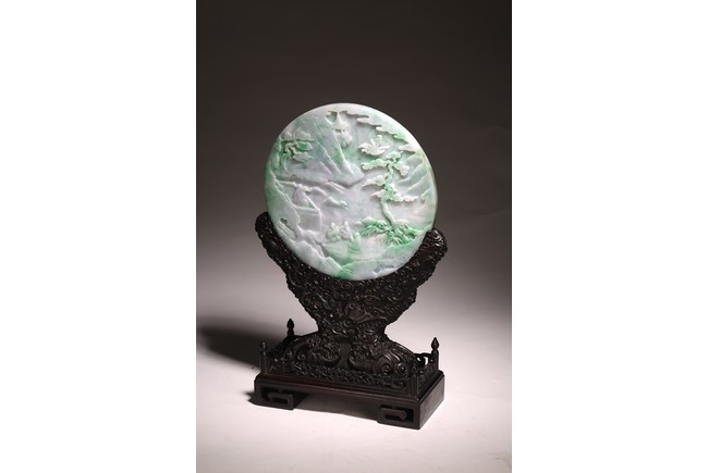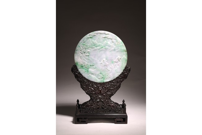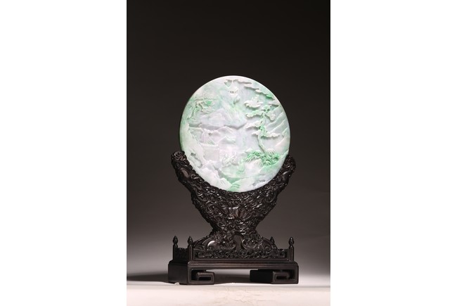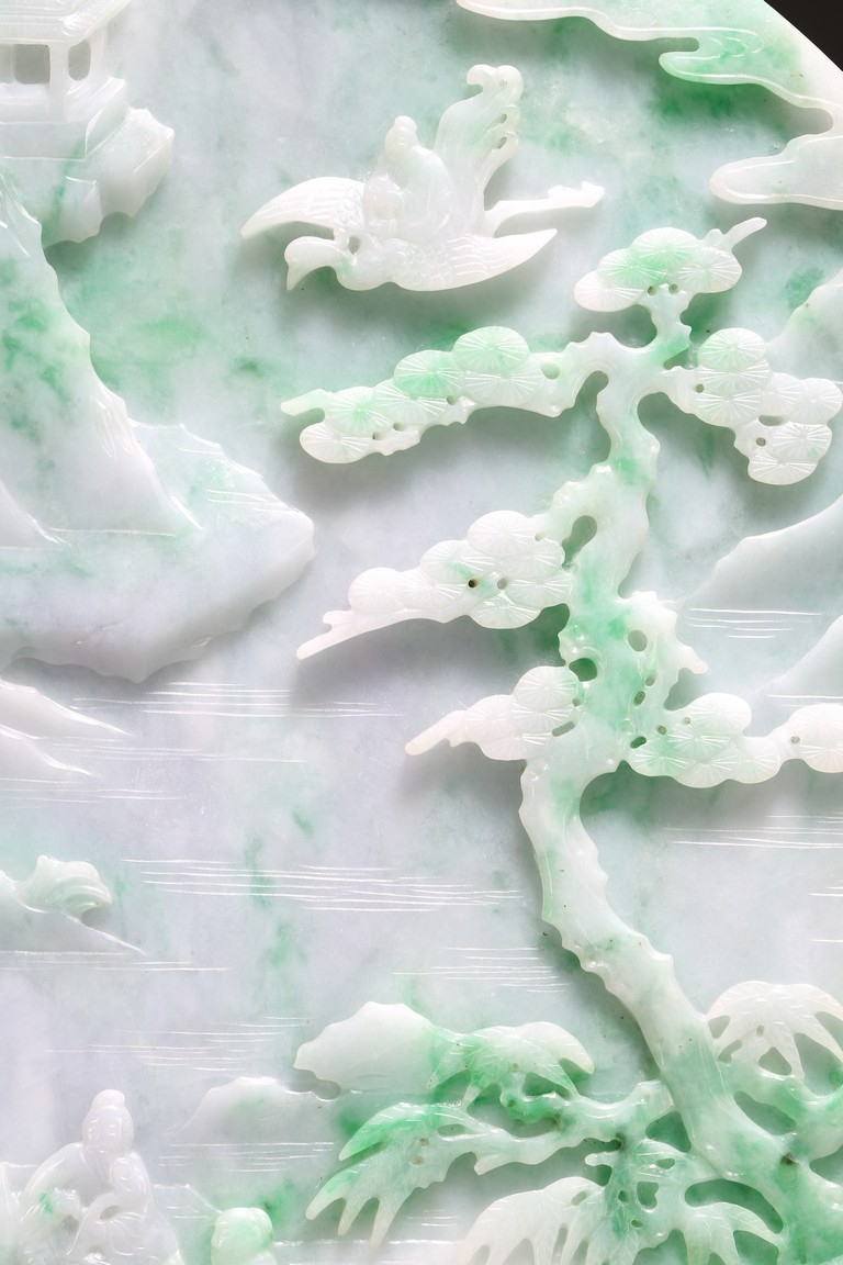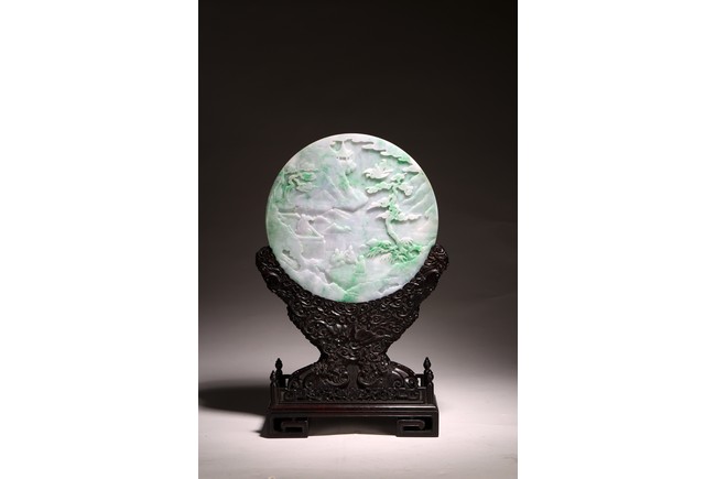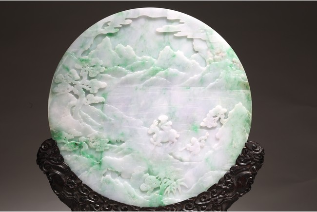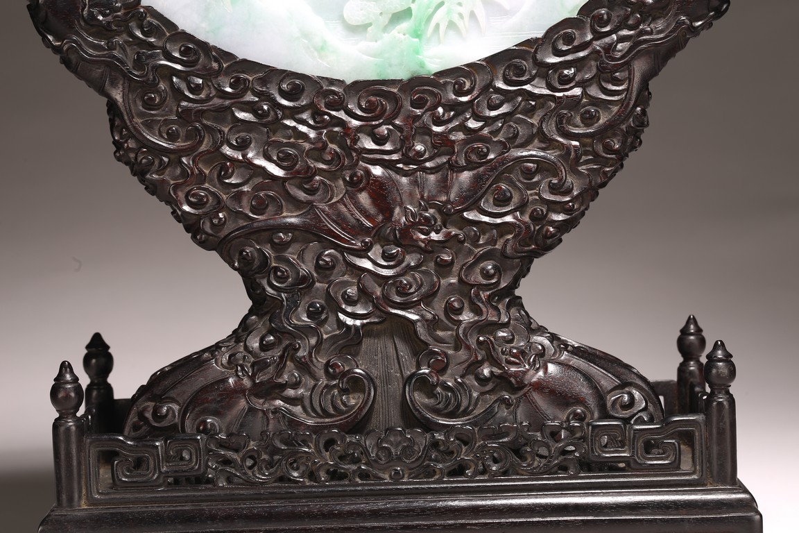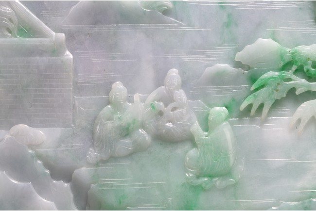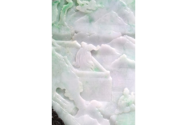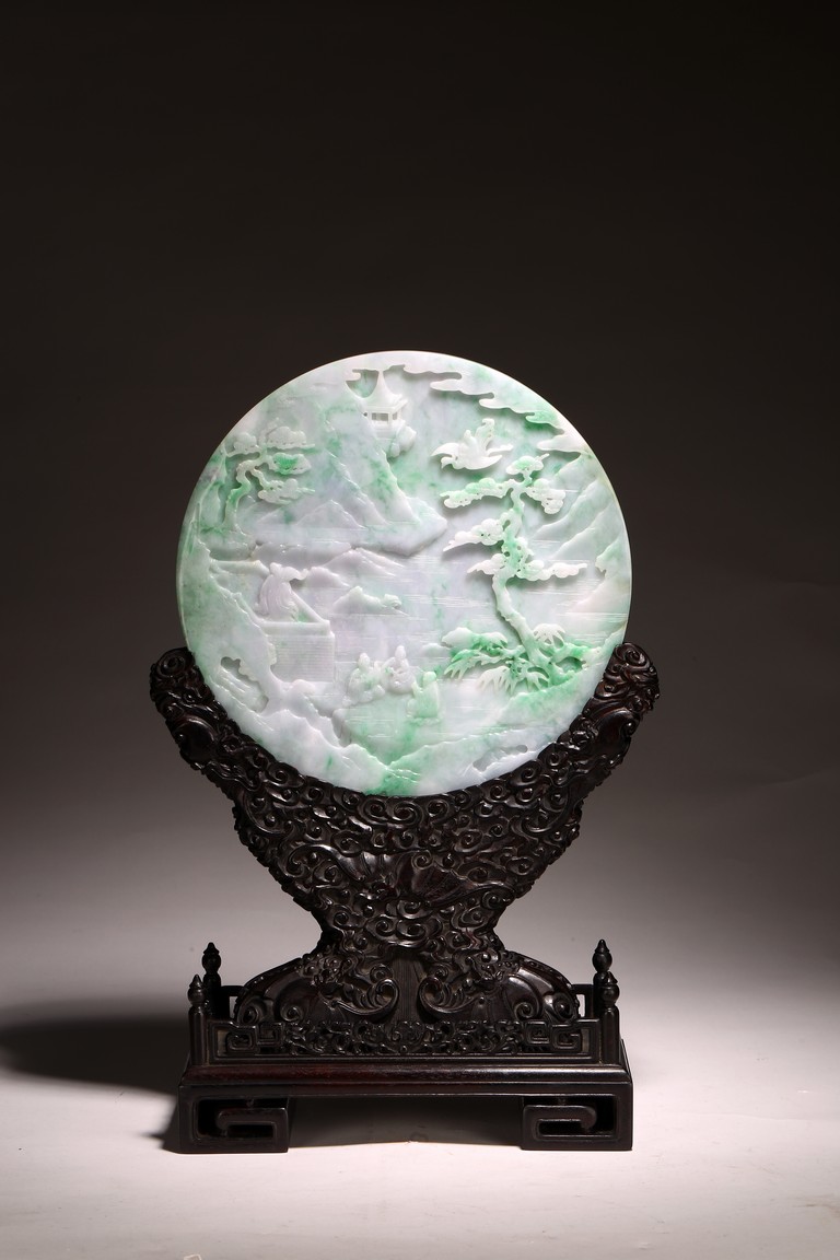 Qing Dynasty period. The jadeite panel carved to one side with three scholars gathering and sitting under a large pine tree growing from rocky outcrop, with pavilions and mountains to the near and far background; the reverse carved with a elderly man riding on deer followed by a young attendant, the stone is of mottled apple green and white tone, all supported on a delicately carved zitan stand.