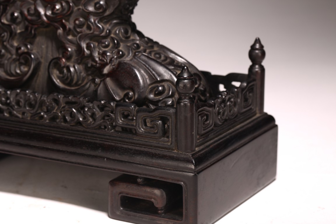 此插屏材料碩大,雙面均浮雕山石崚嶒,雲氣氤氲,花草叢生,山水亭榭,青松蒼翠,高集,古意悠悠,令人神往。此插屏刀法深峻圓潤,細膩流暢,布局景物如畫,質料均佳,包漿潤澤,實爲隽品。