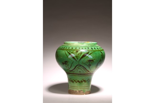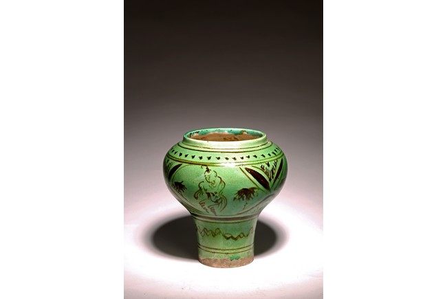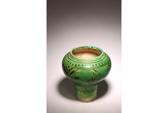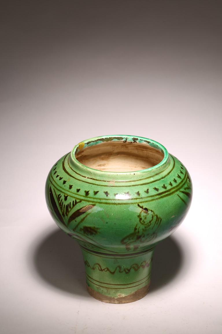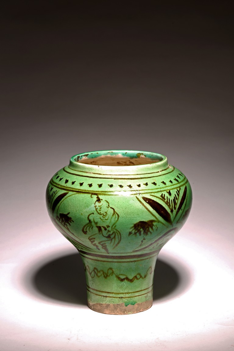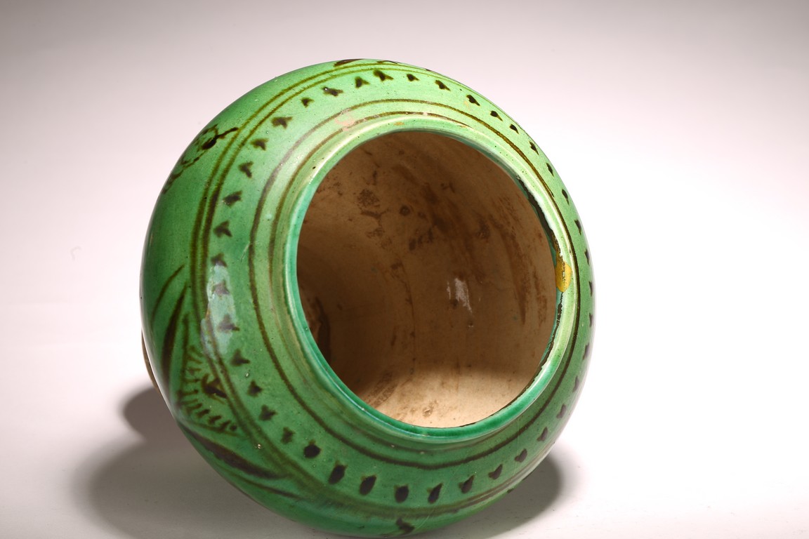 直口,鼓圓腹,高圈足,通體滿施綠彩,用黑彩繪“弦紋”“嬰戲紋”“蕉葉紋”,足底 無釉,胎質灰褐。