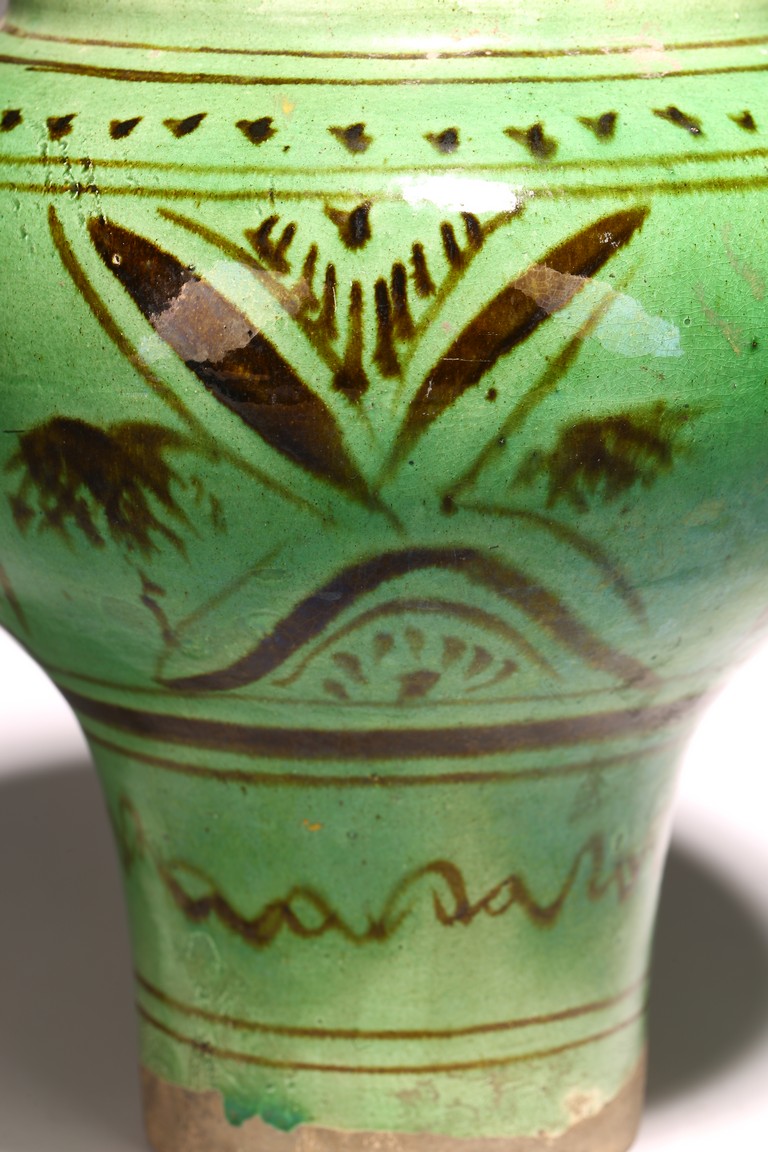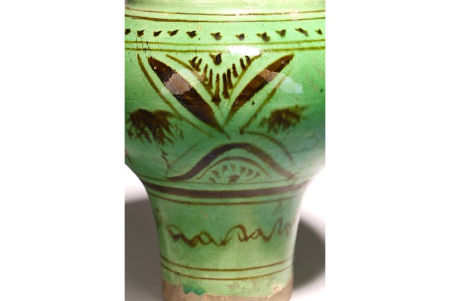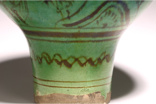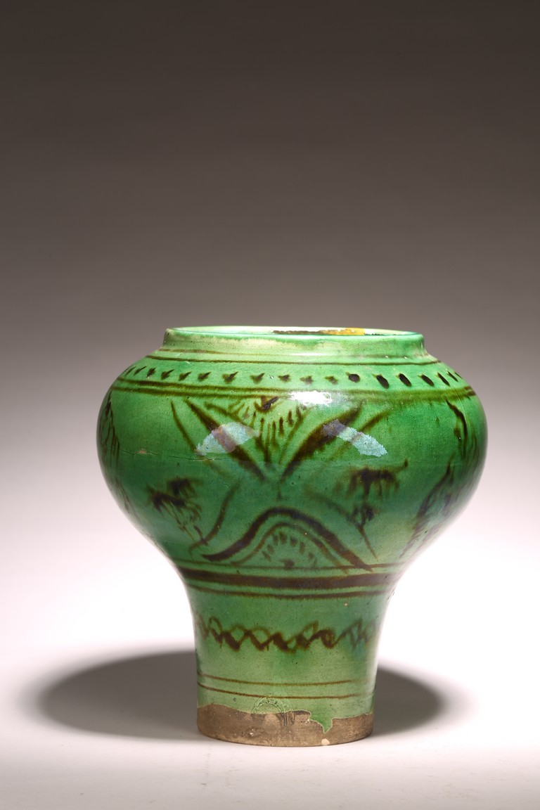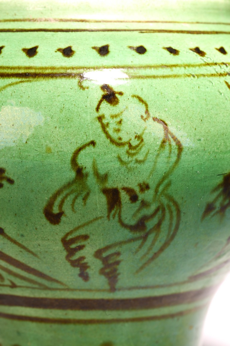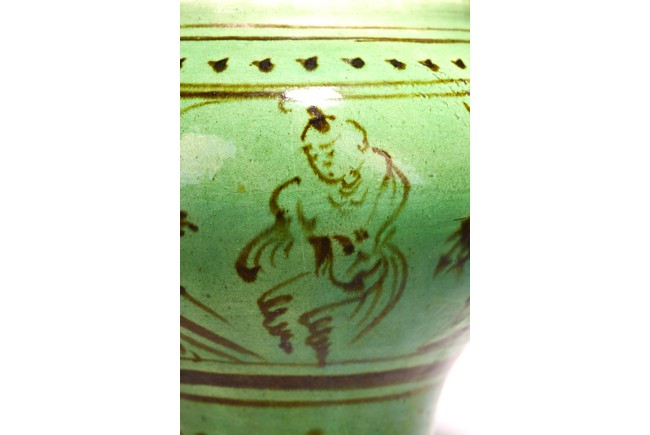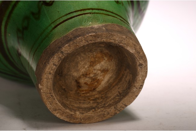 直口,鼓圓腹,高圈足,通體滿施綠彩,用黑彩繪“弦紋”“嬰戲紋”“蕉葉紋”,足底 無釉,胎質灰褐。