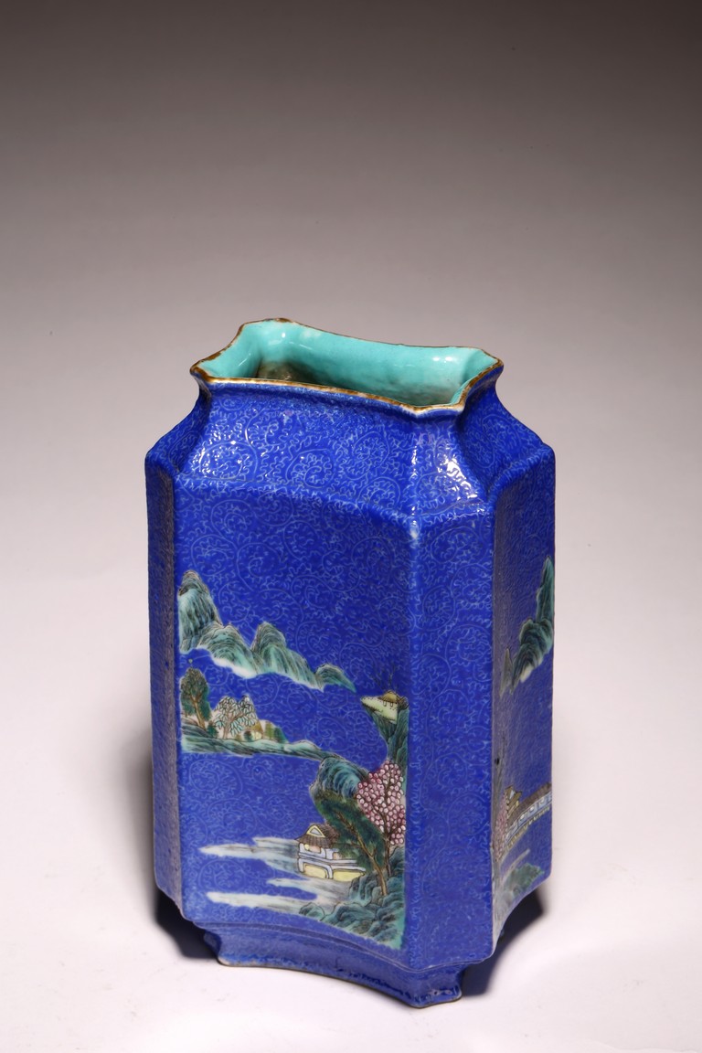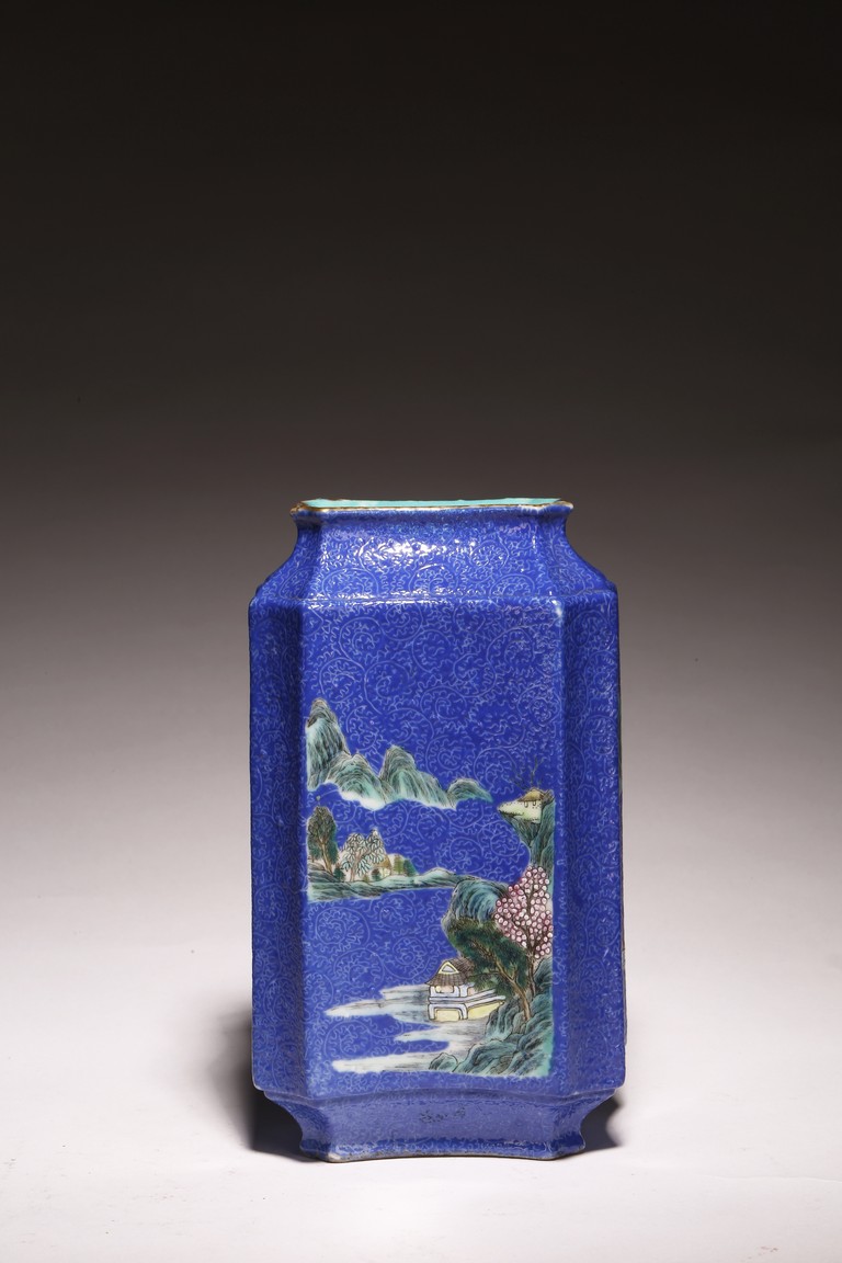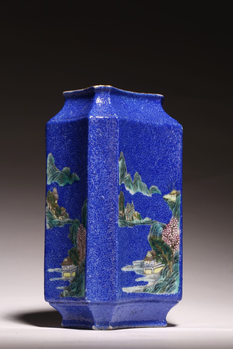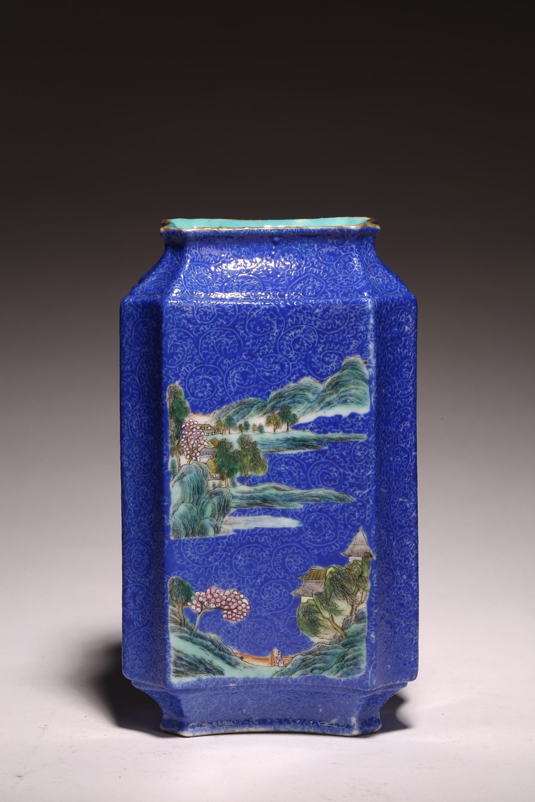 微敞口,斜頸,直腹,矮圈足。藍地紮道爲地,軋道,又叫雕地, 宮中稱錦上添花。粉彩繪“山水紋飾”,色彩鮮豔,畫工精細。“乾 隆年制”款識。