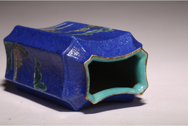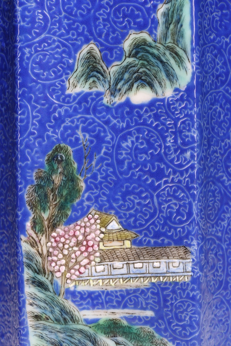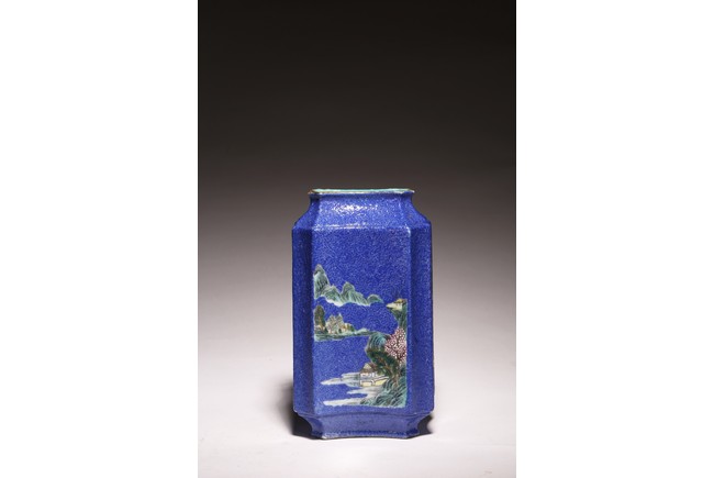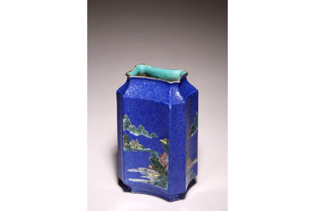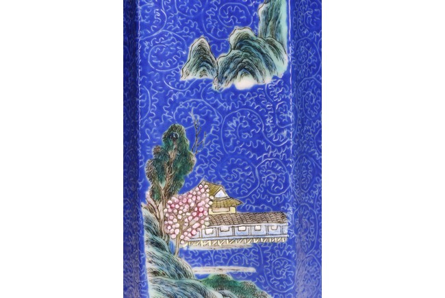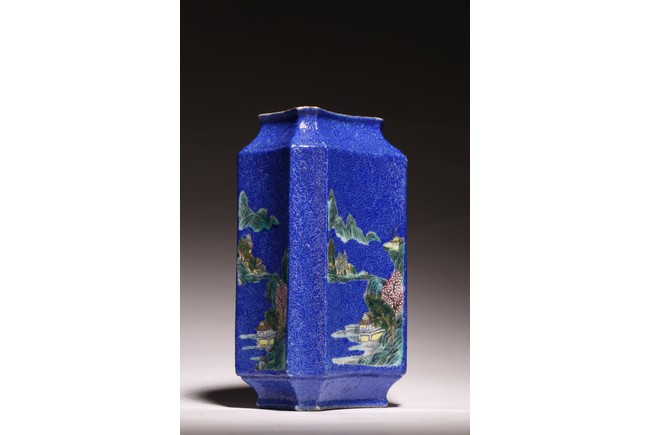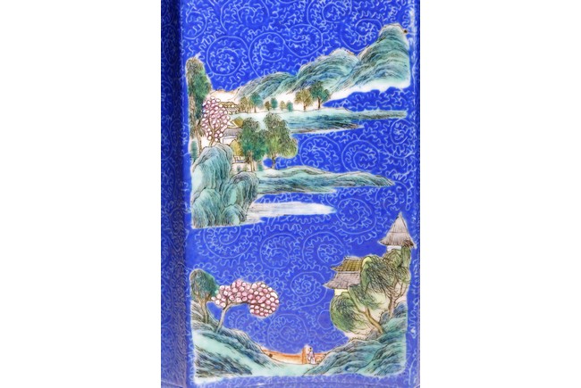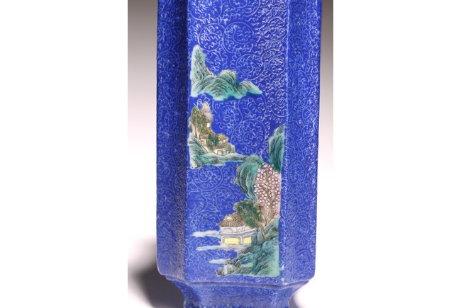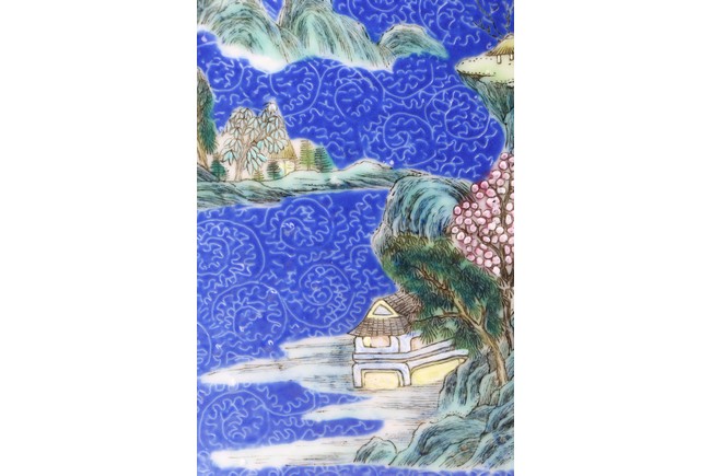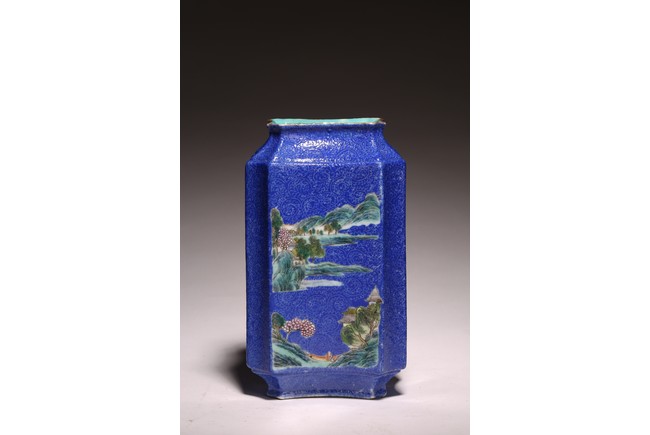 微敞口,斜頸,直腹,矮圈足。藍地紮道爲地,軋道,又叫雕地, 宮中稱錦上添花。粉彩繪“山水紋飾”,色彩鮮豔,畫工精細。“乾 隆年制”款識。