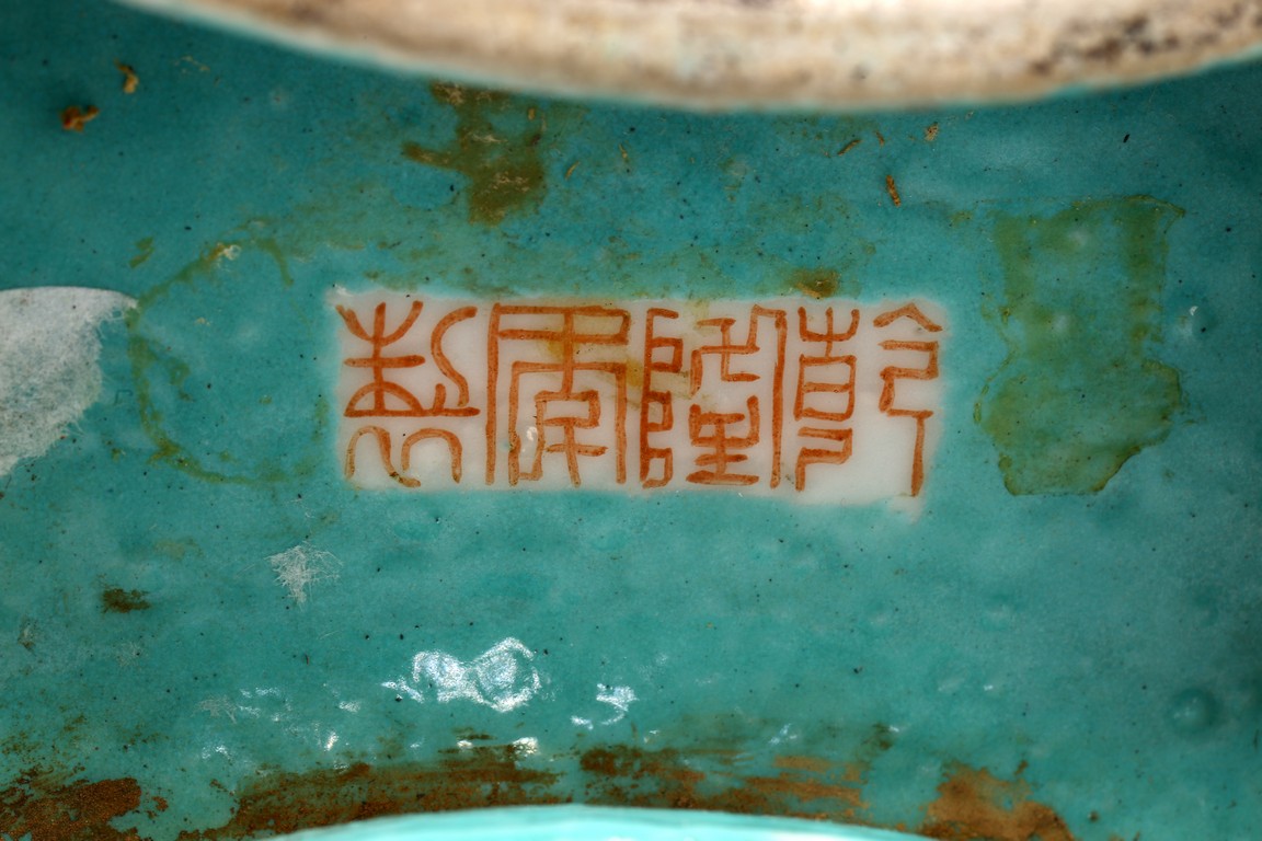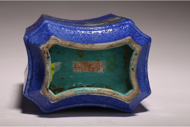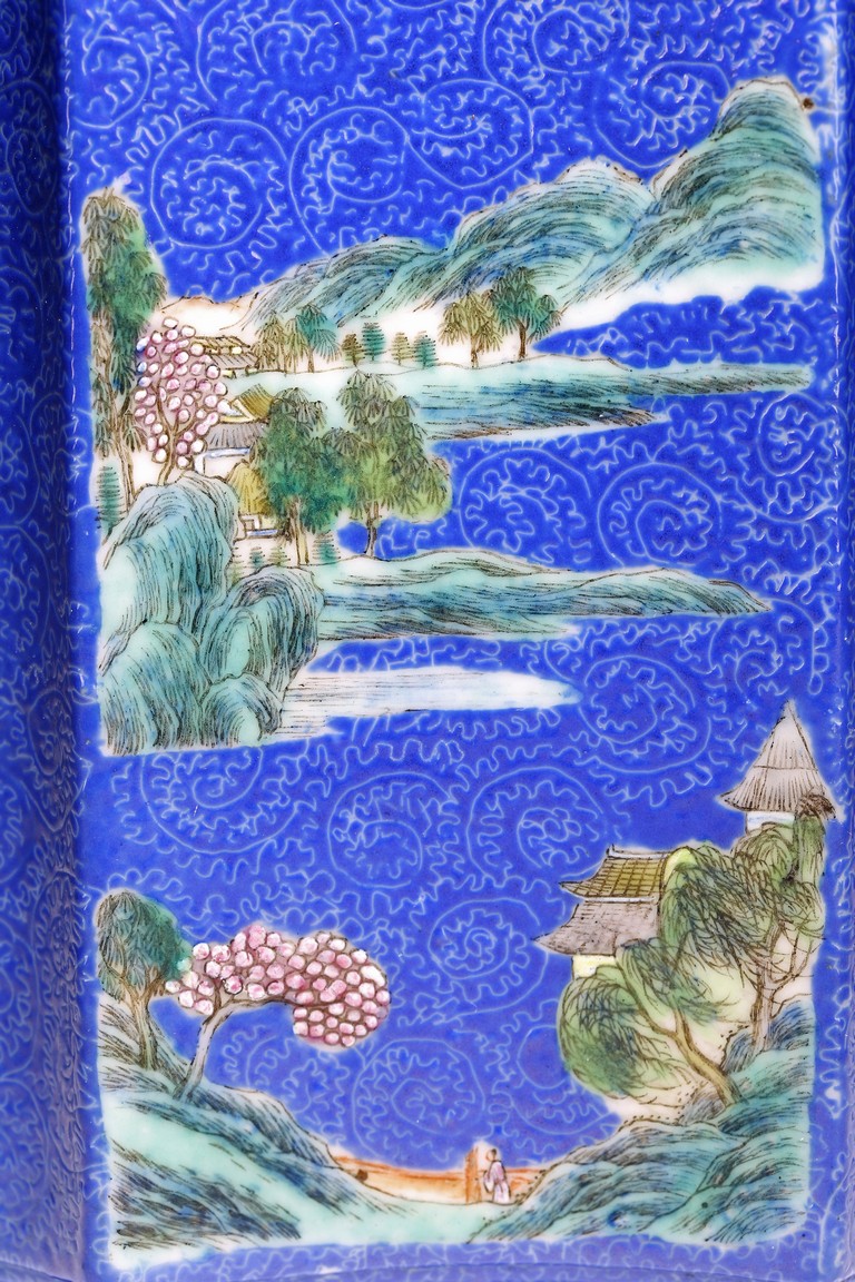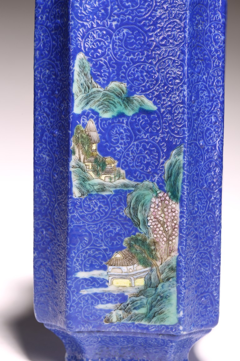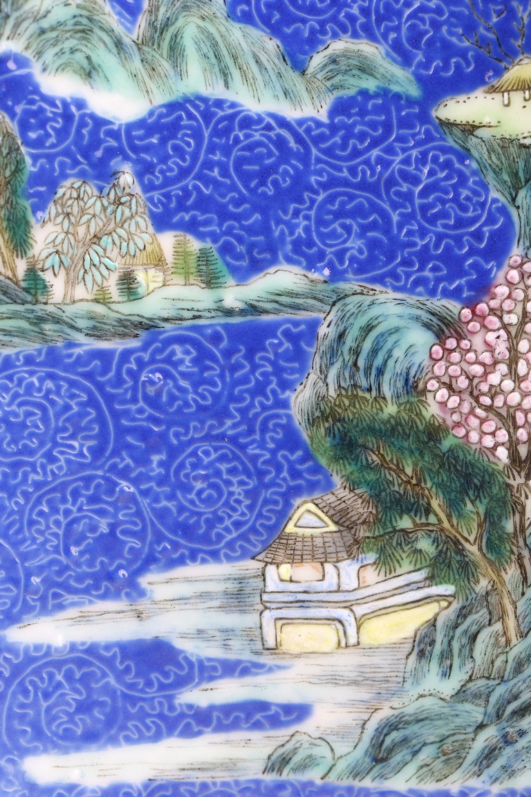 Qing Dynasty Qianlong period. The vase body finely decorated in famille rose to depict riverscape scenes, all against a blue glazed sgraffiato ground, the interior glazed in turquoise green, the base bears a Qianlong reign mark.