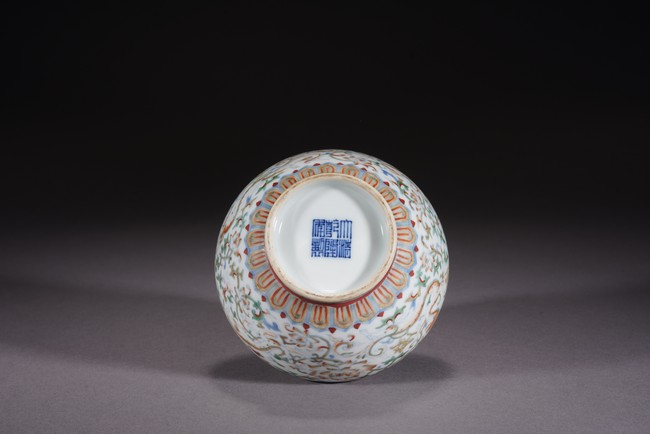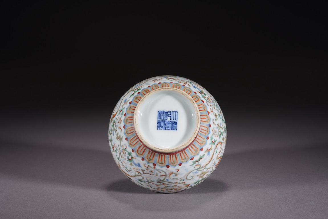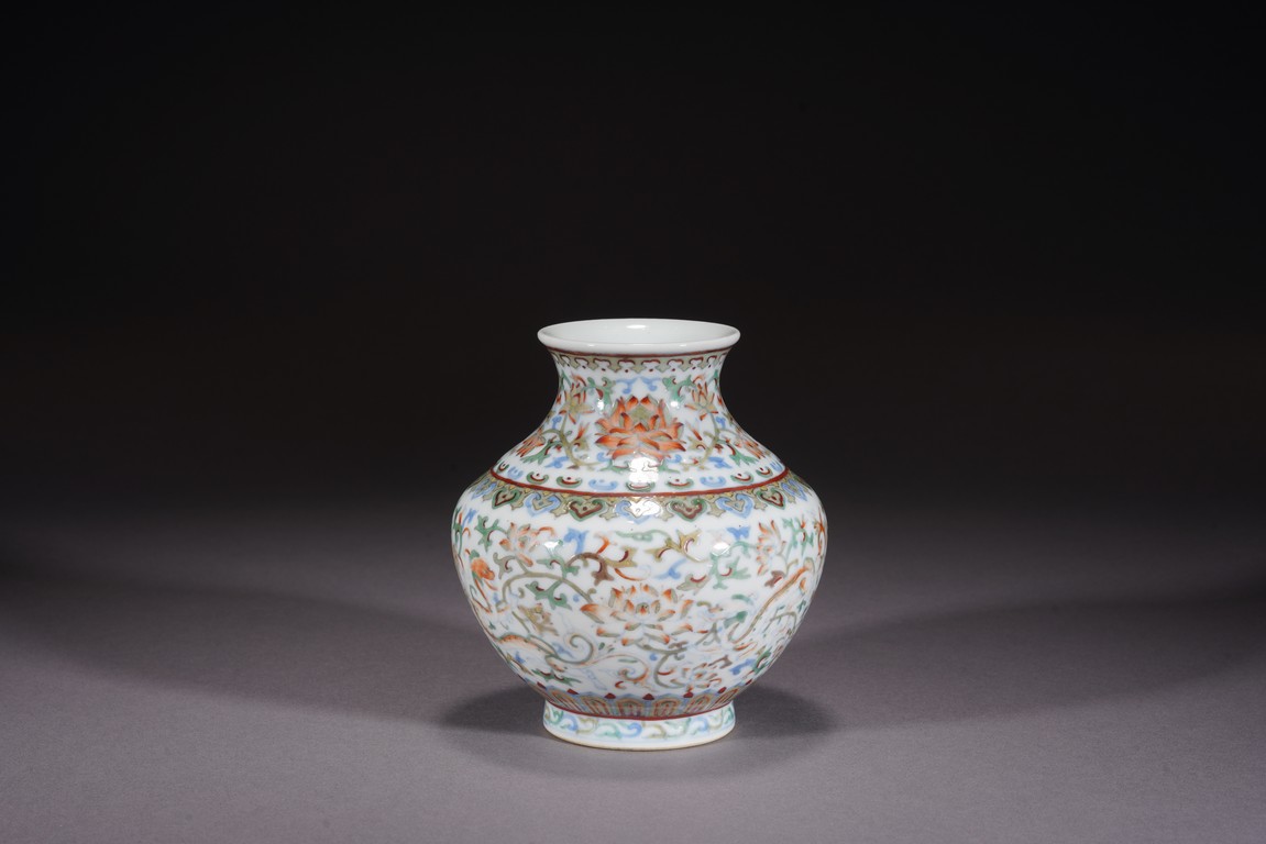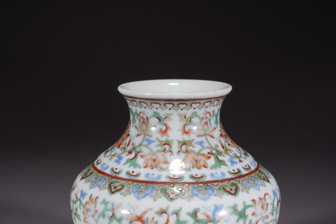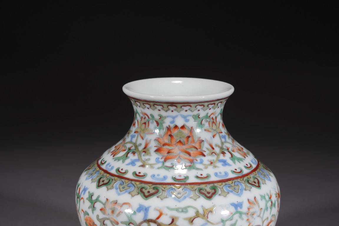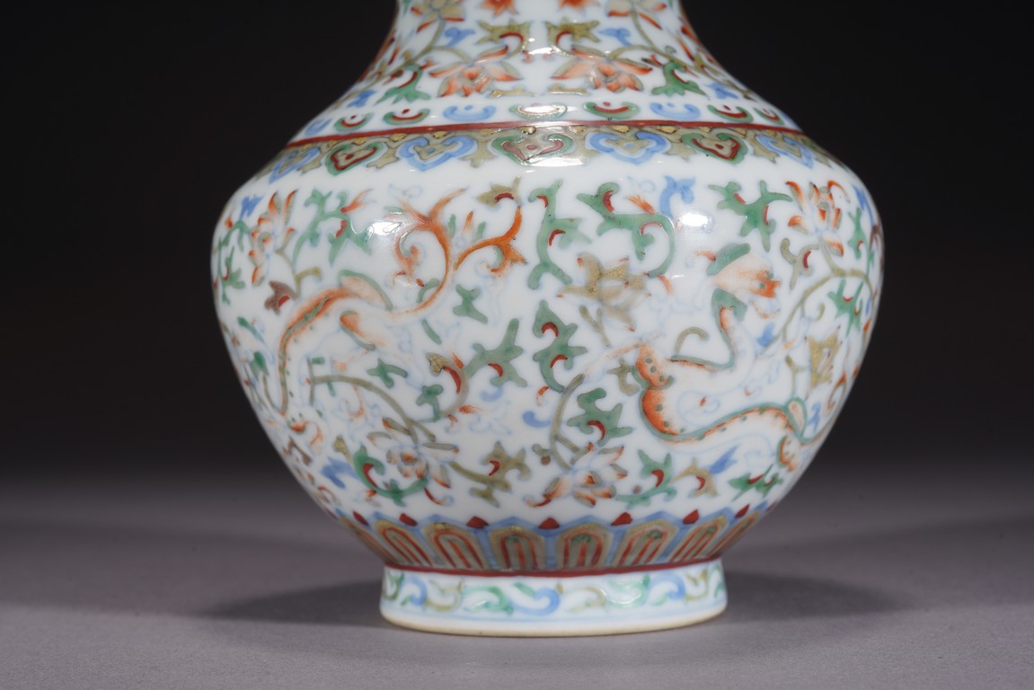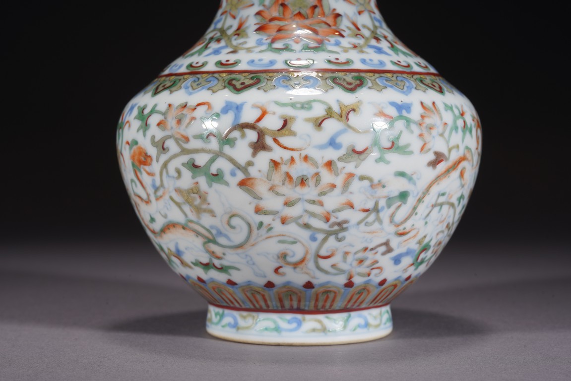 The vase is decorated with lotus scrolls around the body and neck, the base inscribed with reign mark.