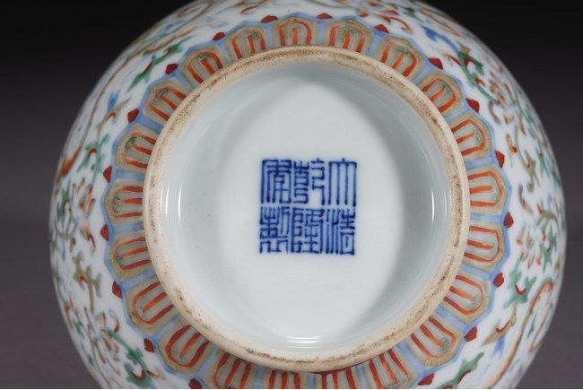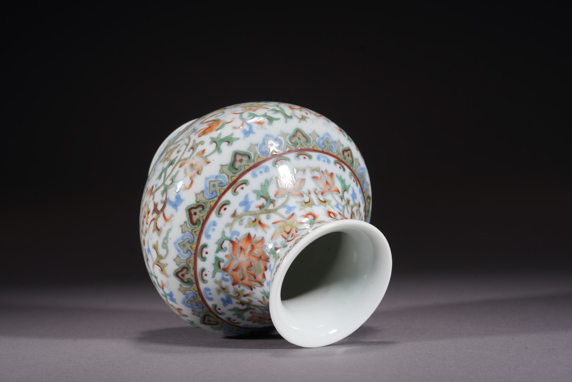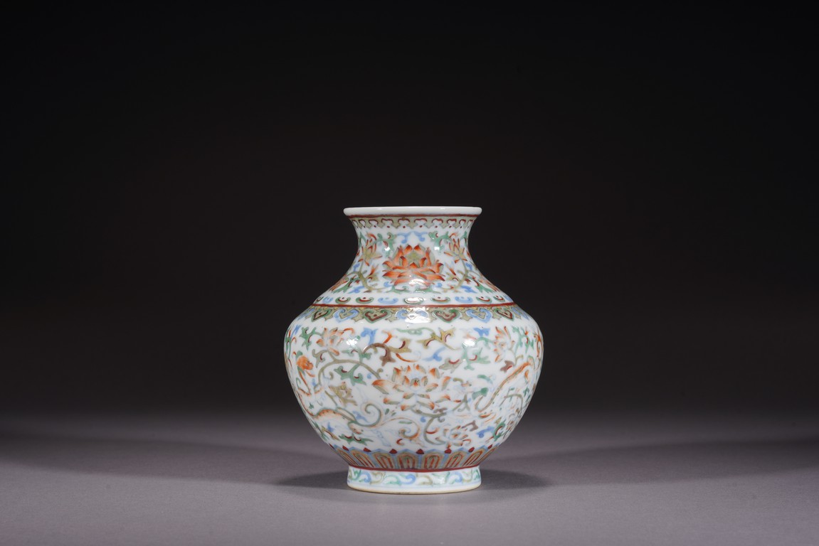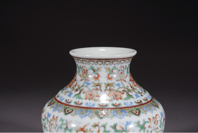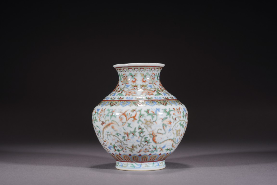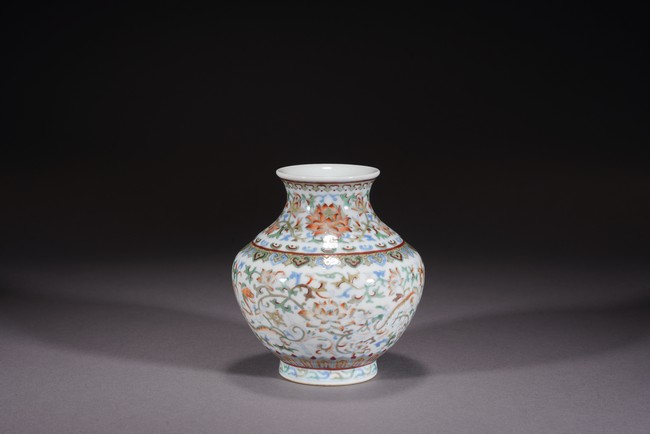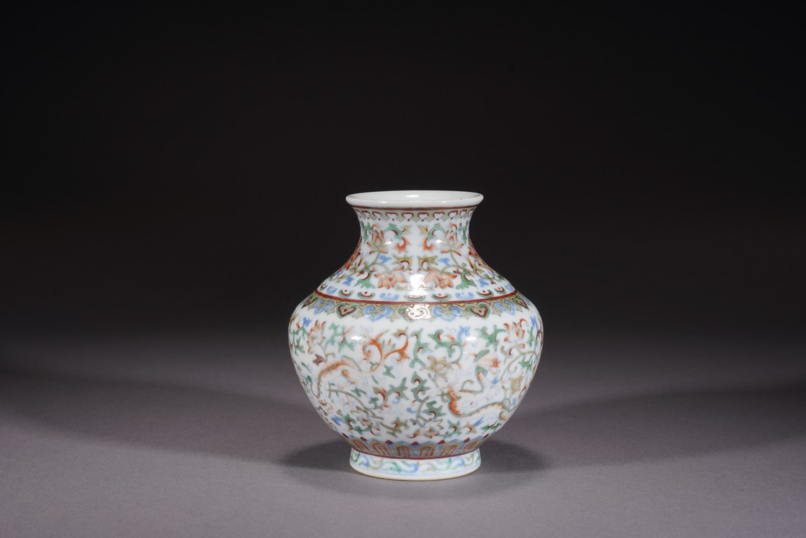撇口,束頸,鼓腹下收,圈足外撇。器身鬥彩繪“如意紋”“纏枝花卉紋”“穿 花龍紋”“蕉葉紋”。“大清乾隆年制”款識。