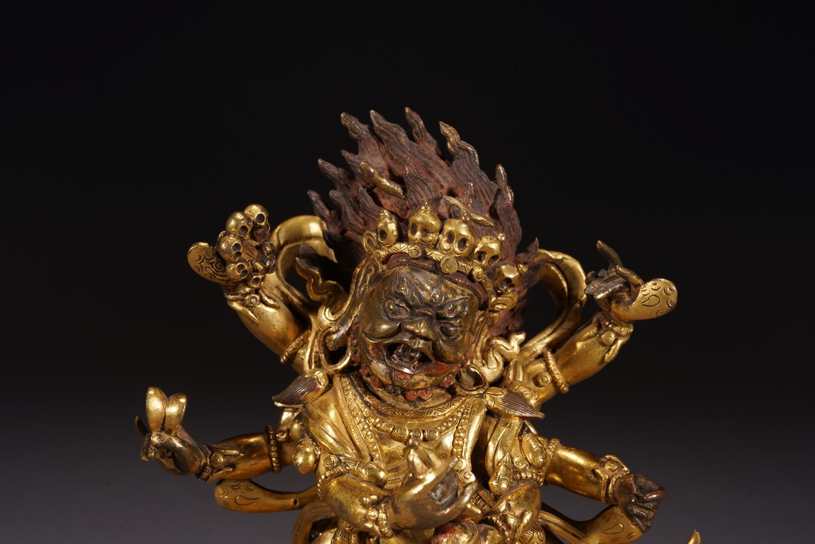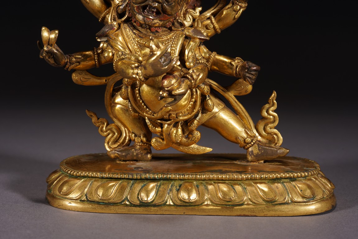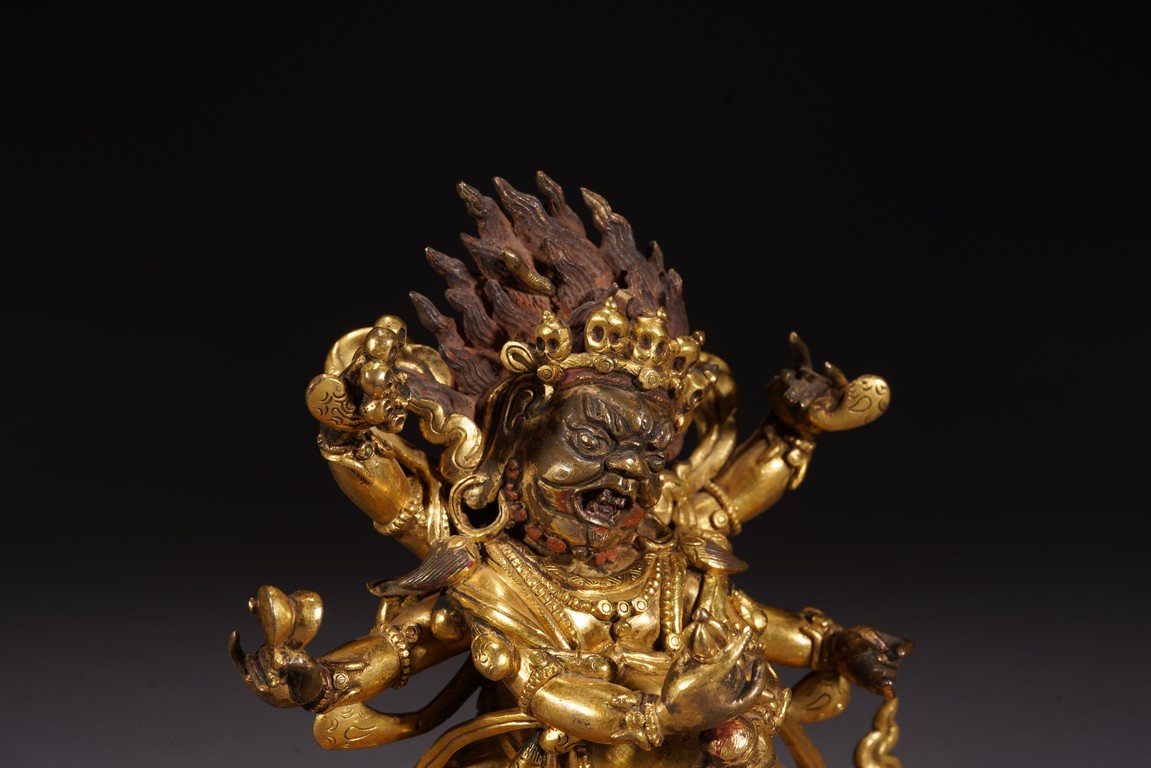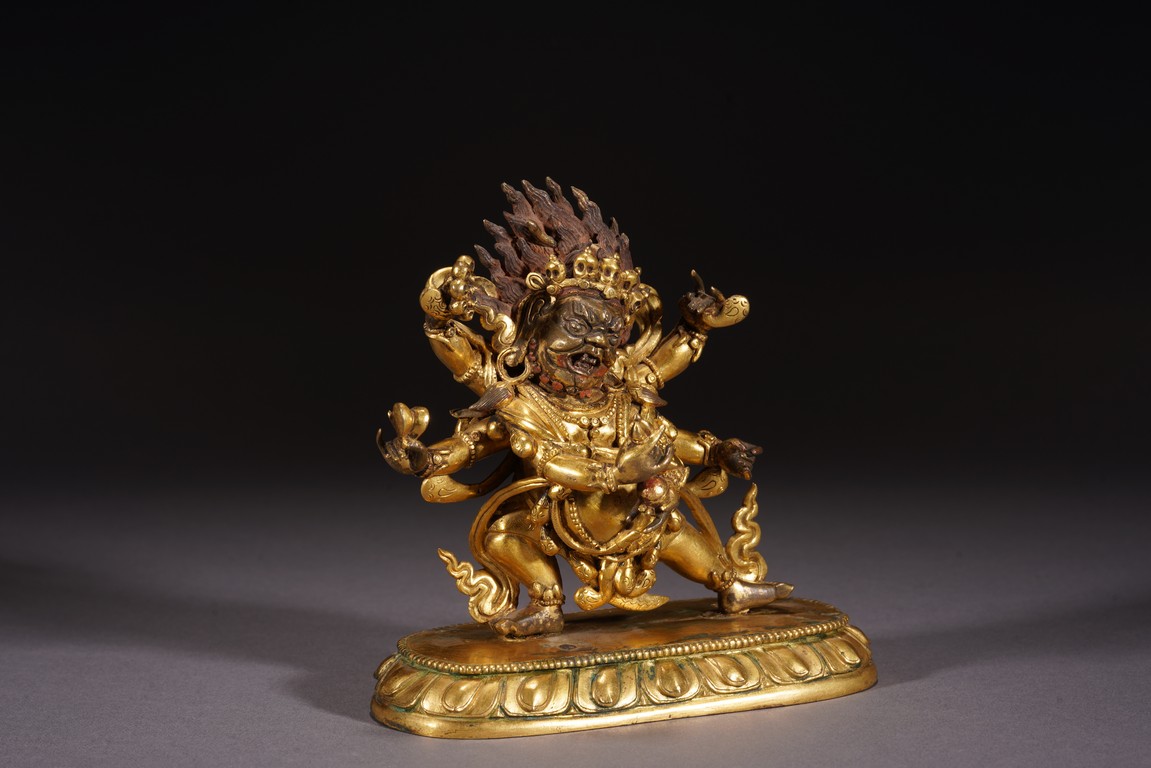 瑪哈嘎拉是佛法中最重要之智慧法,宜秘密供養、修持,則其加持迅速,日 夜不斷。是佛教之護法,觀音之化身,平常隨侍觀音。具有息、增、懷、誅四種 事業法。修持六臂瑪哈嘎拉能降服和救度末法時期中逐漸惡化的衆生,能庇護衆 生,脫離中陰身之苦,解除衆生生活的艱苦及貧窮,圓滿衆生一切善願。 此像頭向左側微傾,戴五骷髅冠,火焰狀豎發上揚,發中有一條小蛇隱現, 面相凶忿。上身飾璎珞,下身圍獸皮,頸間挂五十人頭串,長蛇繞頸,于腹部昂 頭。六手各執法器,胸前雙手,右手執钺刀,左手捧盛滿鮮血的嘎巴拉碗;身後 上方兩手,右手執骷髅手串,左手執箭。身後下方右手執手鼓,左手鈎索遺失。 底座爲活動單層蓮瓣座,蓮瓣光滑飽滿。整器面部表情刻畫尤爲突出,其忿怒像 使人視之不寒而栗,將主像之法力無邊展現得淋漓盡致,鎏金厚實,金色燦爛, 保存完好,極其難得。 來源:華盛頓州柏衛市私人藏家提供 Provenance: Property from a private collection in Bellevue, Washington