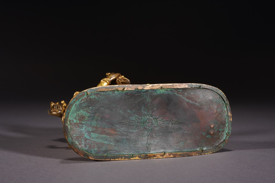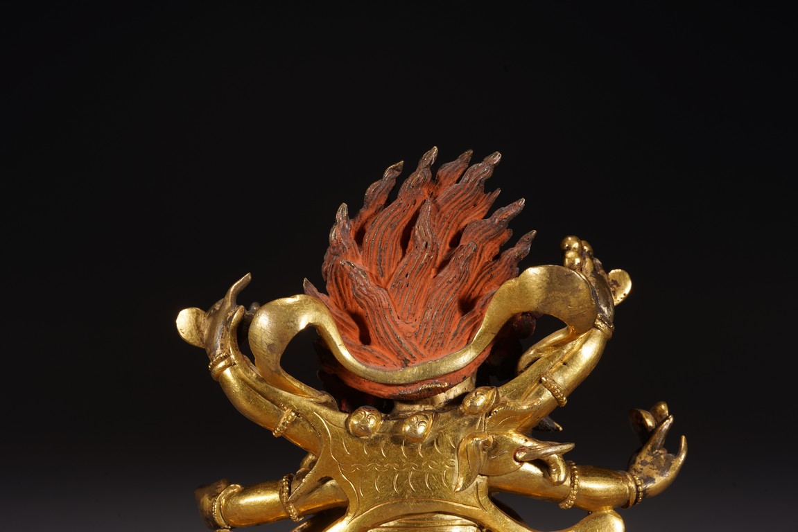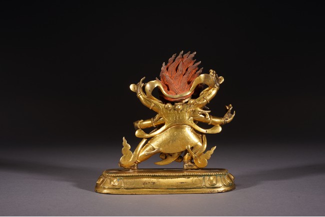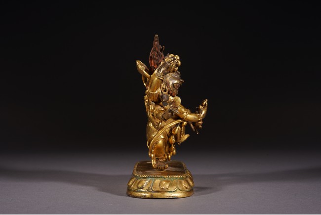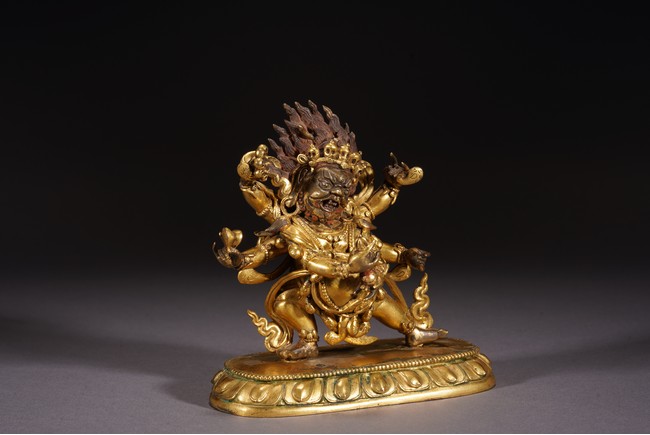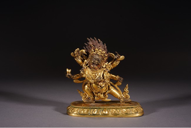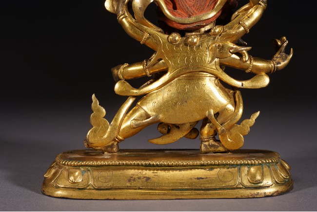 瑪哈嘎拉是佛法中最重要之智慧法,宜秘密供養、修持,則其加持迅速,日 夜不斷。是佛教之護法,觀音之化身,平常隨侍觀音。具有息、增、懷、誅四種 事業法。修持六臂瑪哈嘎拉能降服和救度末法時期中逐漸惡化的衆生,能庇護衆 生,脫離中陰身之苦,解除衆生生活的艱苦及貧窮,圓滿衆生一切善願。 此像頭向左側微傾,戴五骷髅冠,火焰狀豎發上揚,發中有一條小蛇隱現, 面相凶忿。上身飾璎珞,下身圍獸皮,頸間挂五十人頭串,長蛇繞頸,于腹部昂 頭。六手各執法器,胸前雙手,右手執钺刀,左手捧盛滿鮮血的嘎巴拉碗;身後 上方兩手,右手執骷髅手串,左手執箭。身後下方右手執手鼓,左手鈎索遺失。 底座爲活動單層蓮瓣座,蓮瓣光滑飽滿。整器面部表情刻畫尤爲突出,其忿怒像 使人視之不寒而栗,將主像之法力無邊展現得淋漓盡致,鎏金厚實,金色燦爛, 保存完好,極其難得。 來源:華盛頓州柏衛市私人藏家提供 Provenance: Property from a private collection in Bellevue, Washington