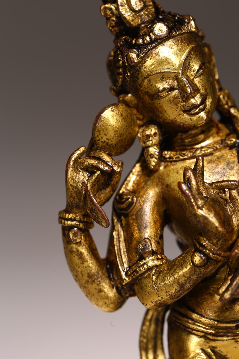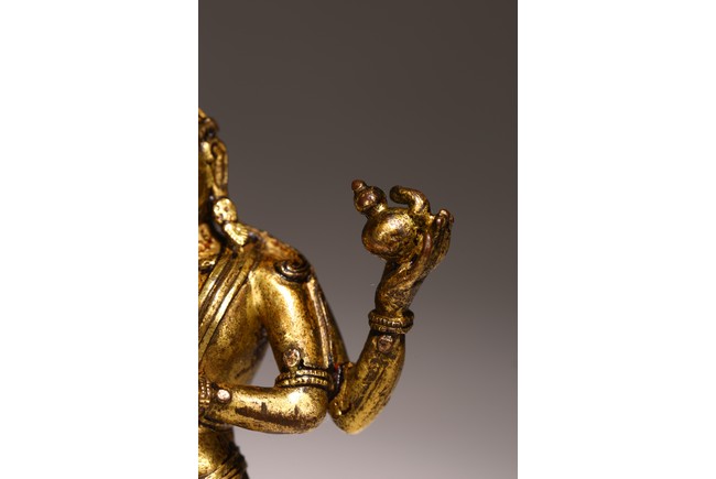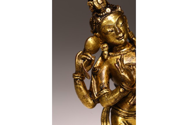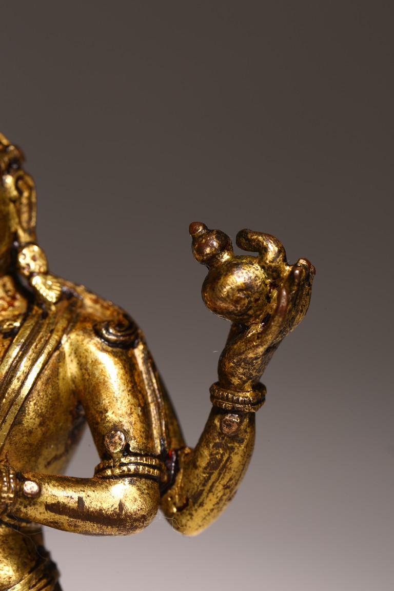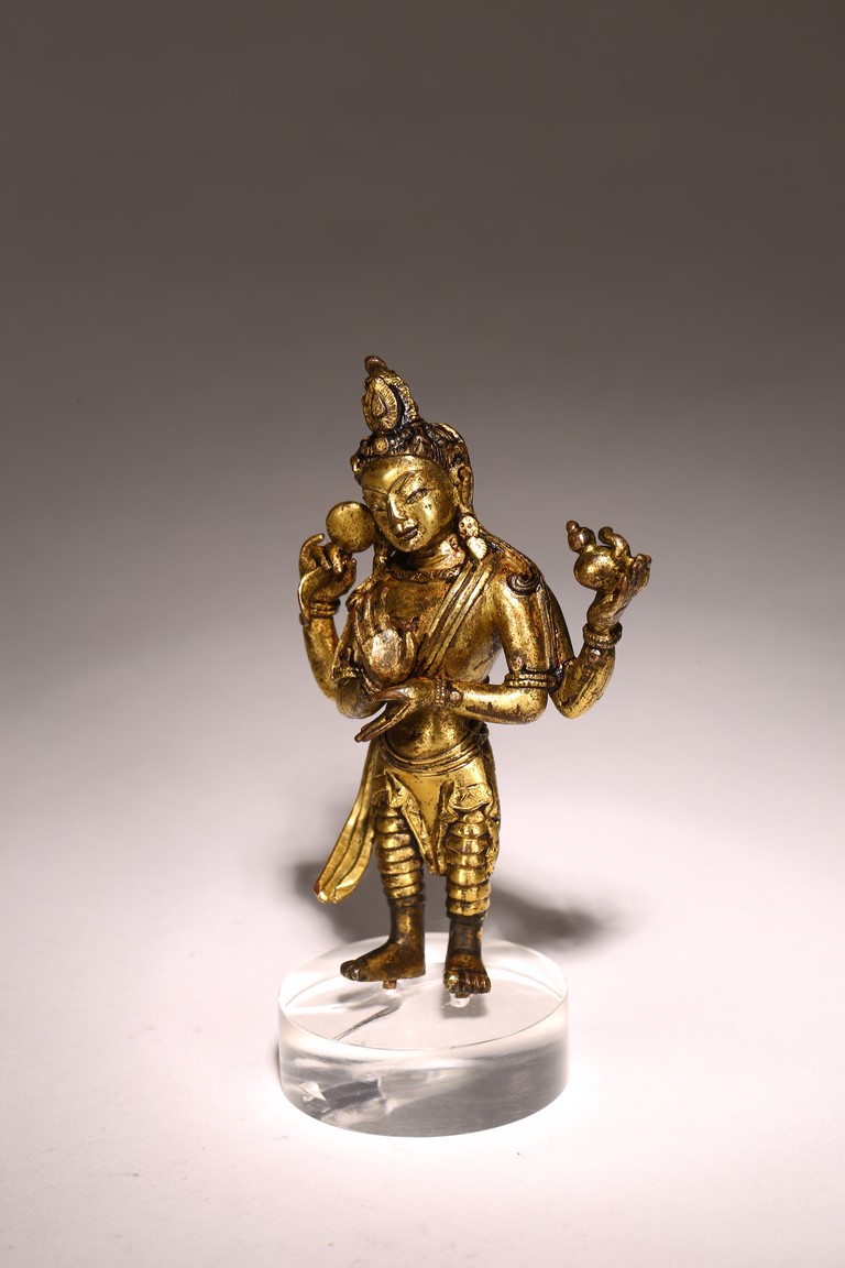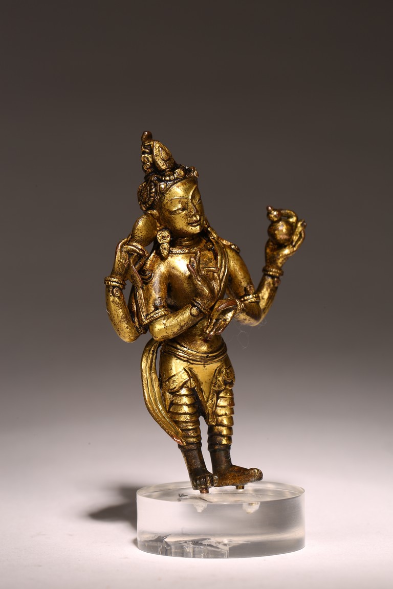 觀音呈站姿,寶珠頂嚴,面龐豐腴,慧眼凝視衆生,上身袒露,手挽披帛,下 身著長裙,主臂置于胸前,作“說法印”,後兩臂持法器上舉。整器比例精准, 形態優美,鎏金肥厚,金色燦爛。
