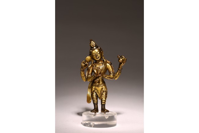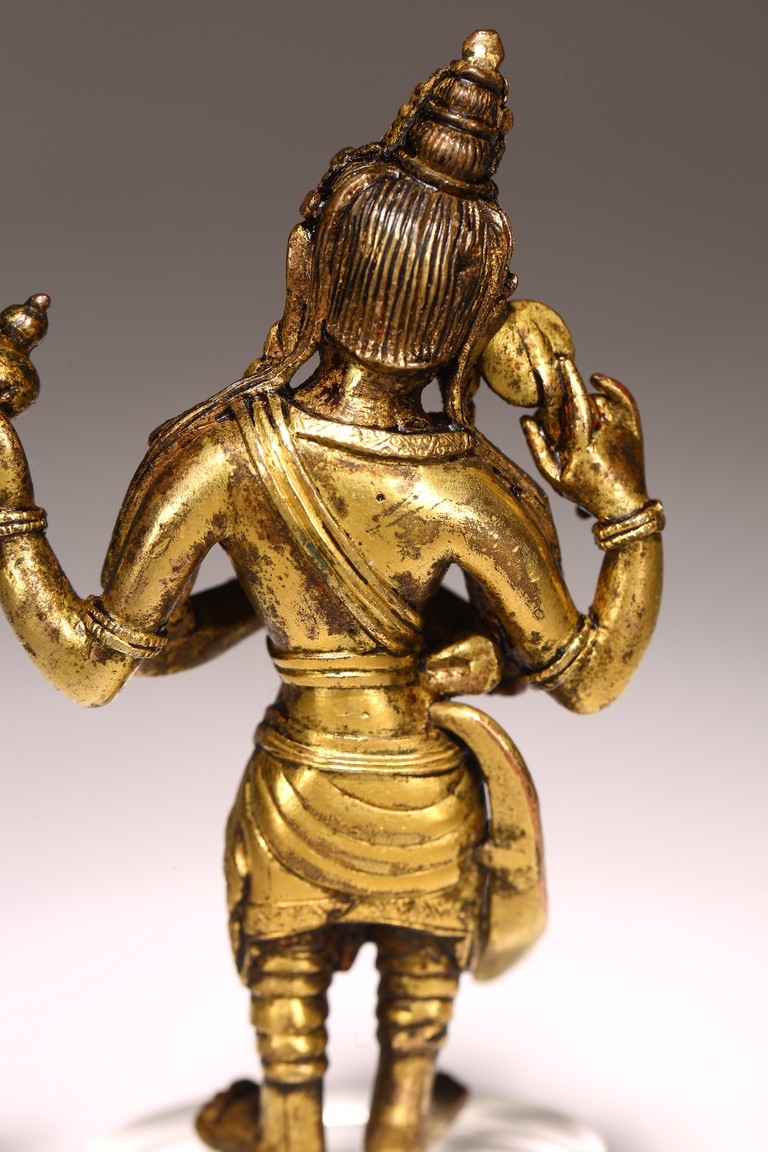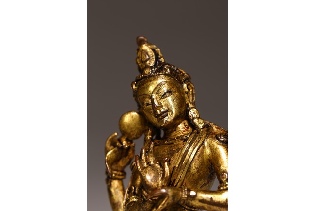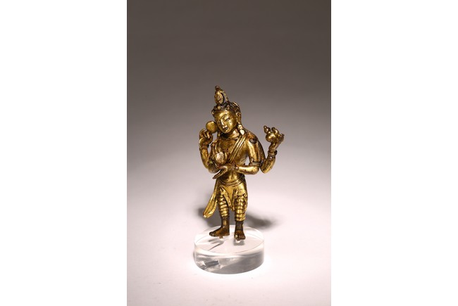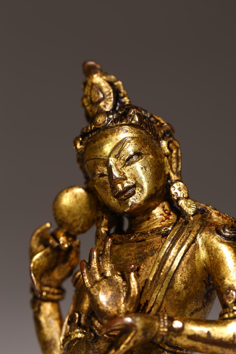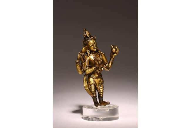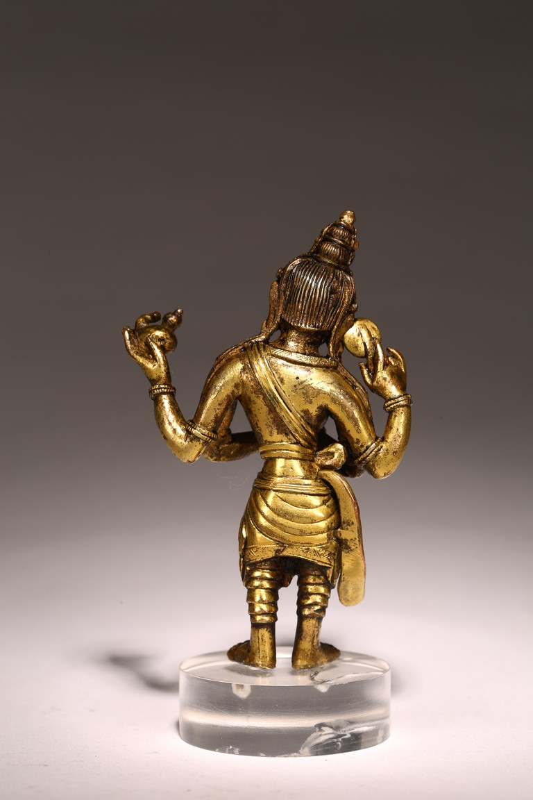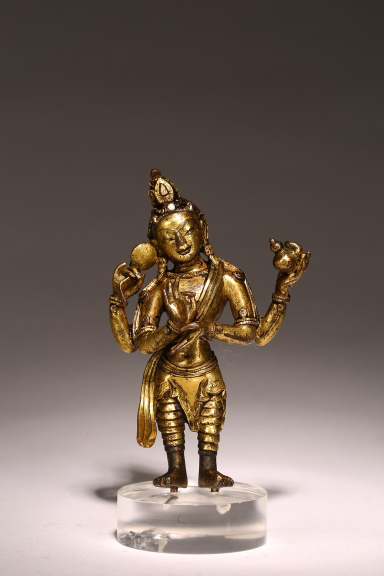 觀音呈站姿,寶珠頂嚴,面龐豐腴,慧眼凝視衆生,上身袒露,手挽披帛,下 身著長裙,主臂置于胸前,作“說法印”,後兩臂持法器上舉。整器比例精准, 形態優美,鎏金肥厚,金色燦爛。
