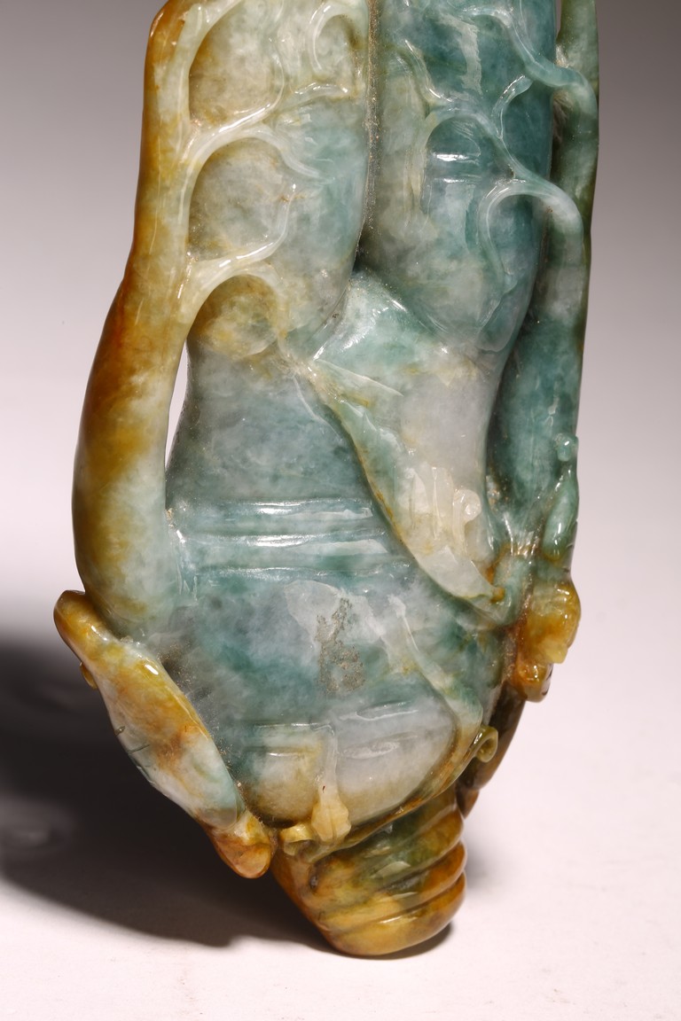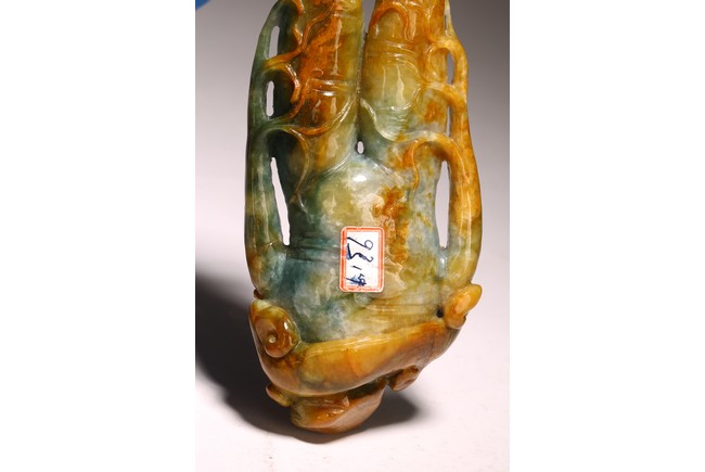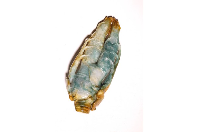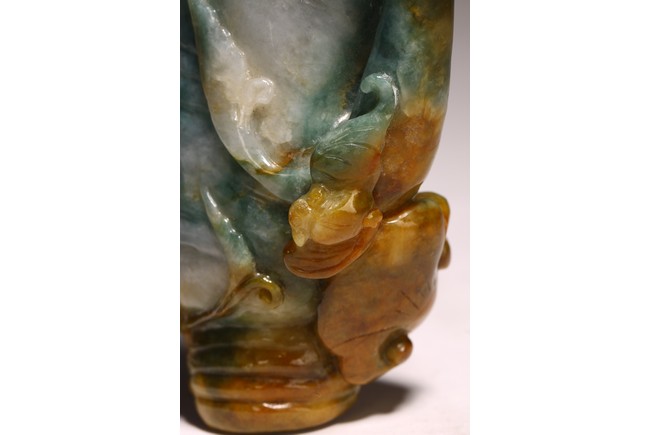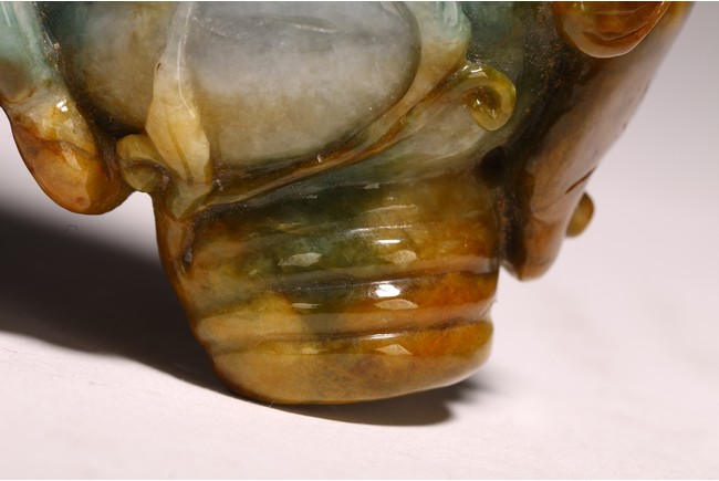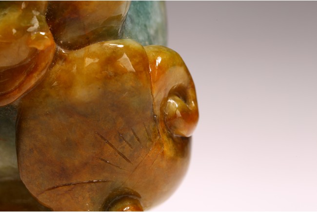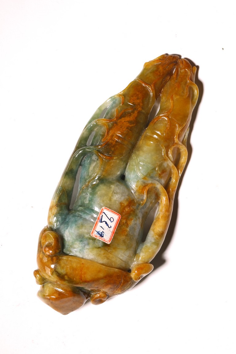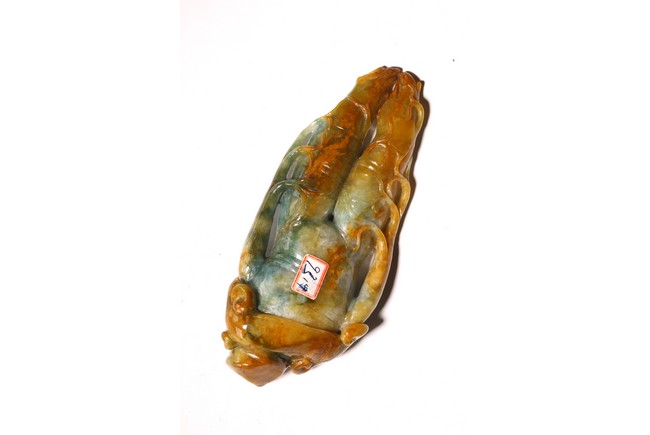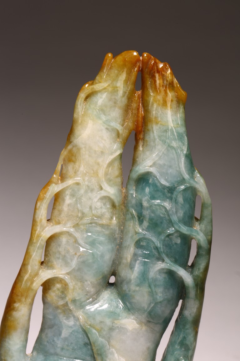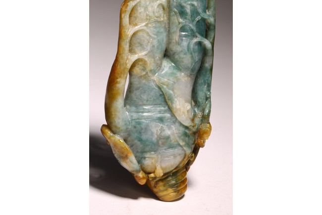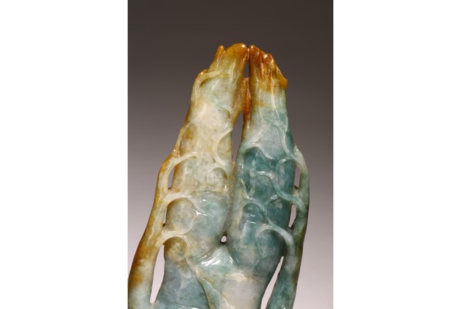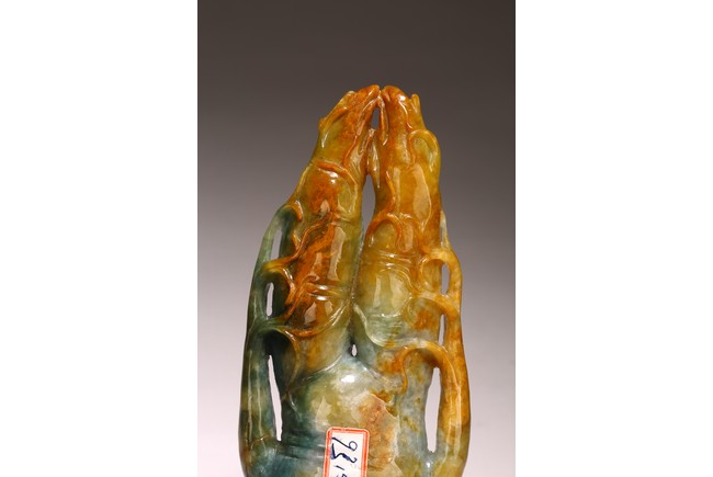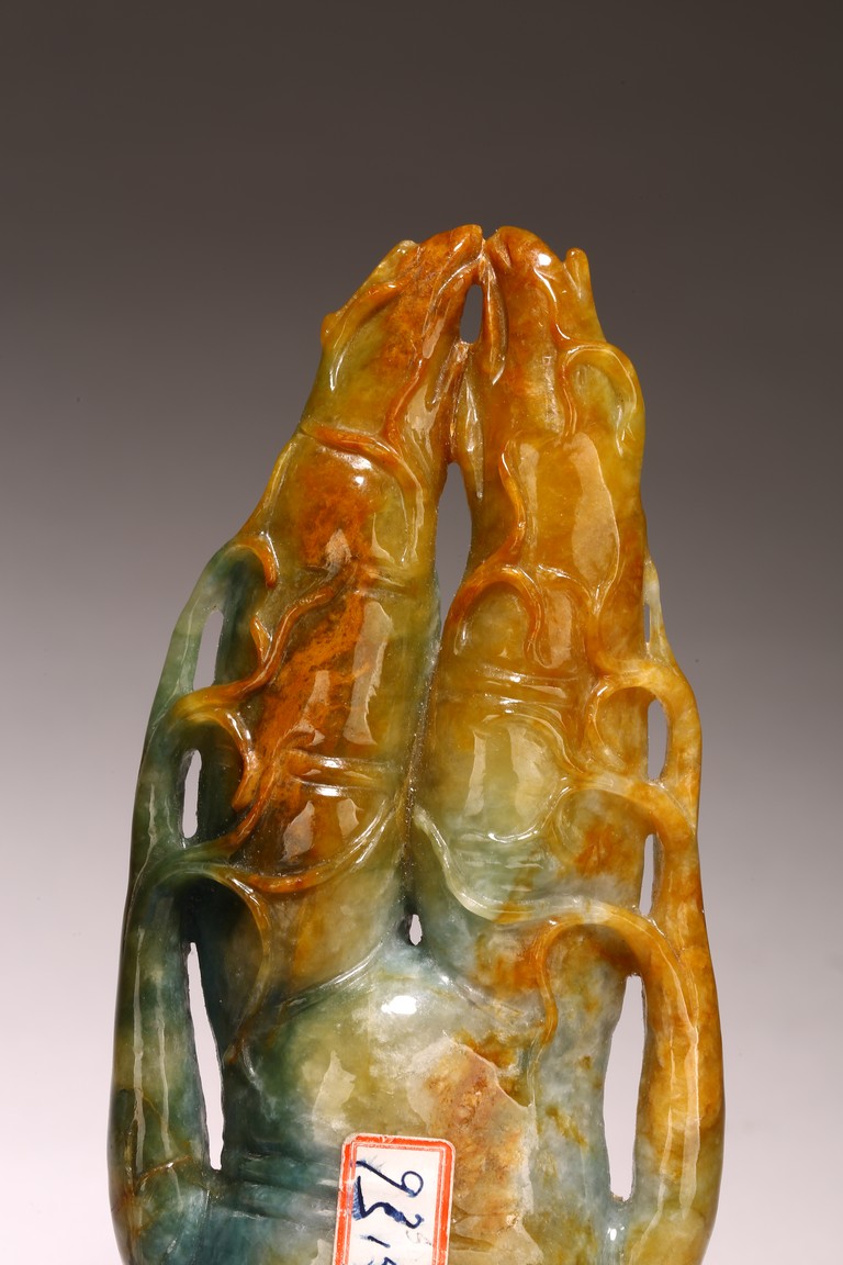 翡翠制成,大面积带有黄翡巧色,质地一流。圆雕佛手形状,寓意吉祥,清代常以佛手纹 饰表示长寿,取其吉祥与“佛佑”之意。
