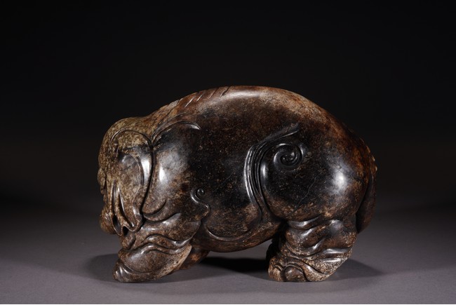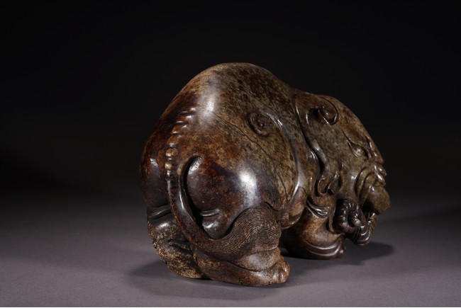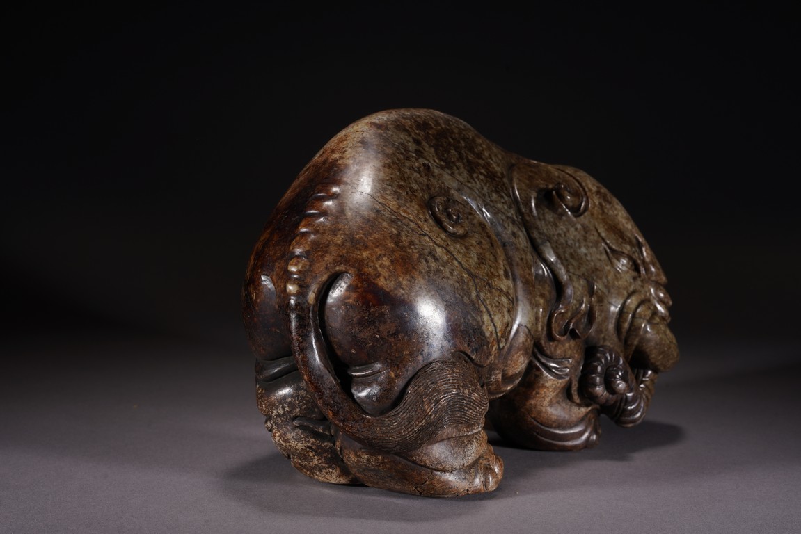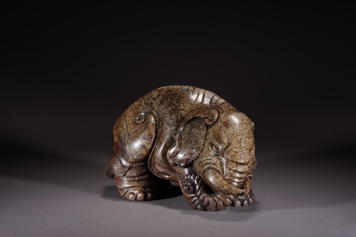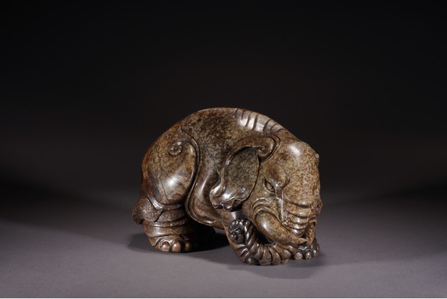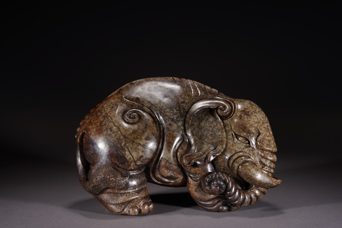 大象壽命長久,可達兩百多年,曆來被視爲瑞獸,爲中國古代吉祥紋飾, 在宮廷各種禦用器物上廣泛使用,乾隆本人也尤其喜愛大象,常常運用至玉雕 擺件上。佛教崇象,大象代表修行者願行殷深,象亦與釋迦牟尼佛和普賢菩薩 有關。據傳釋迦牟尼佛前世是一頭象,普賢菩薩則多乘大象。象代表溫馴祥和 之瑞獸,象征盛世安甯與和平,也指連年豐收的象征意義。帝王多以大象比作 天下太平的象征來歌功頌德。 此器不惜用料,不惜工本,用料碩大,雕工頂級,精雕細琢,唯妙唯俏, 極其寫實,活靈活現,手感極爲厚重。玉質沁色深透,局部提油,呈現黑褐色, 深淺得宜,色澤自然古樸,包漿瑩潤。圓雕立象,回首遠望,其身形健壯敦厚, 葉形大耳後揚,眉眼細長,鋒牙斜出,長鼻上卷,造型雍容端莊,曲線婉轉流 暢,肌理分明,富有動態美感,結構嚴謹有度,彰顯出至尊無上的皇家氣息。 足部陰刻“乾清宮制”篆書款識。乾清宮:(乾清宮是故宮內廷正殿,爲皇帝處 理日常政務,批閱各種奏章的地方,乾清宮與政務關系相當密切,也用來接見外國使節以及舉行內廷典禮和家宴。)(參閱 2017 年春季拍賣會香港蘇富比拍 賣有限公司“靈動凝神:長壽坊珍藏肖生玉雕”3305 號拍品,成交價 :HKD 7300000)