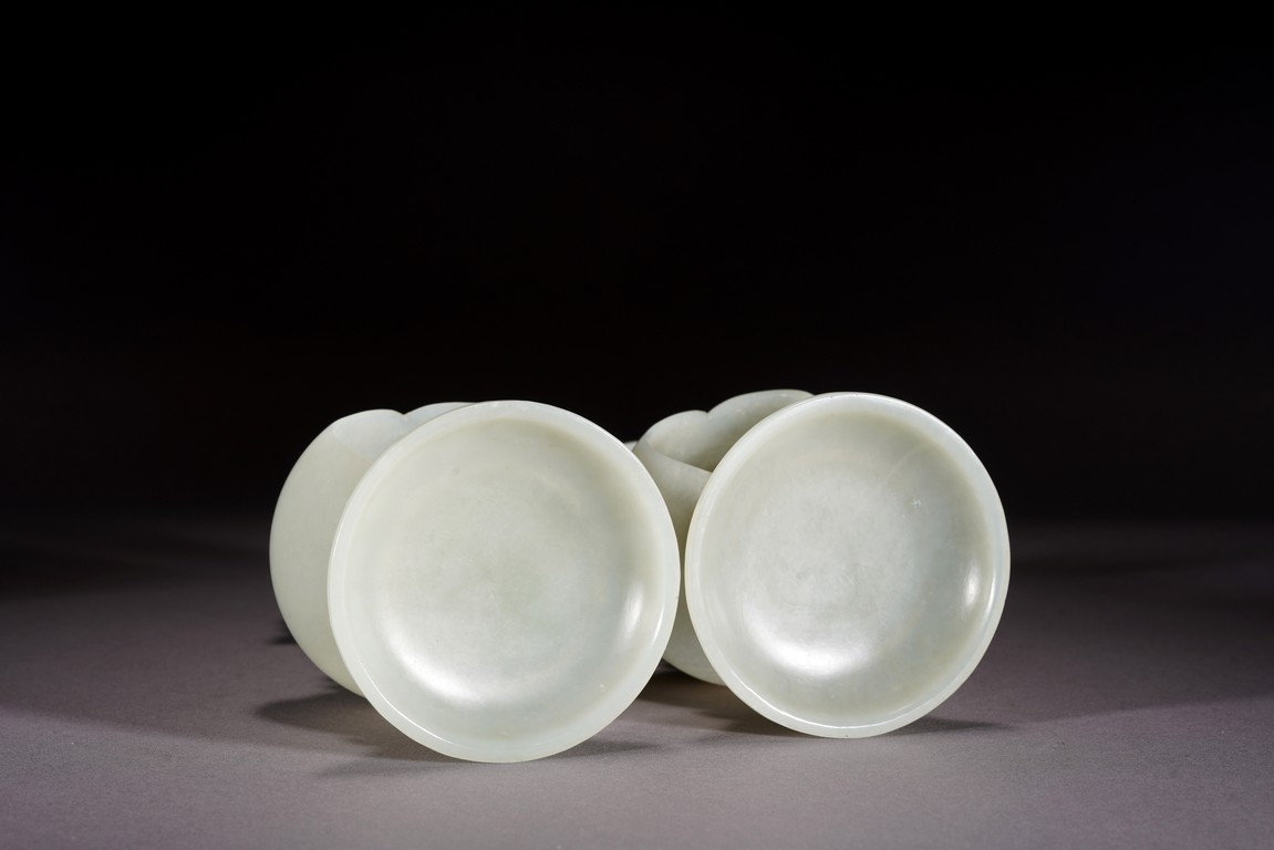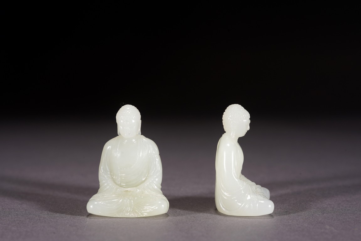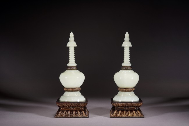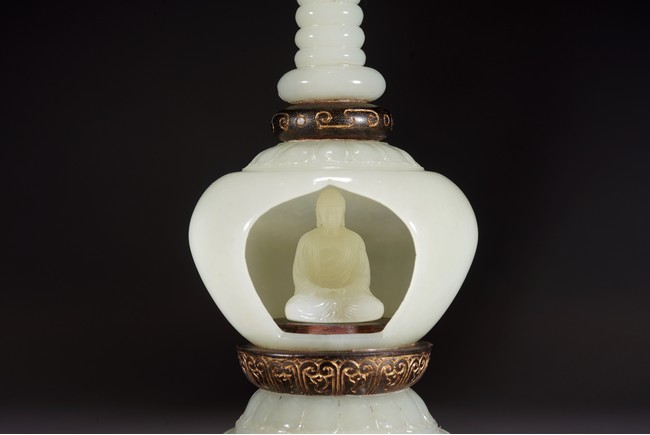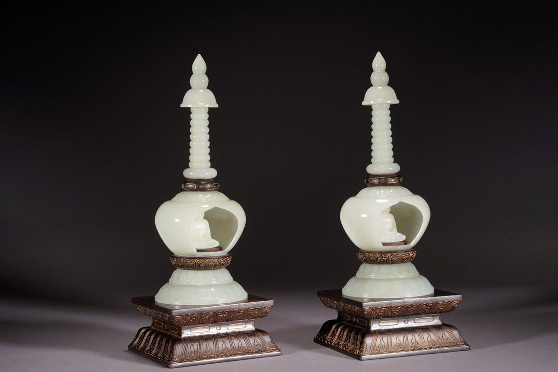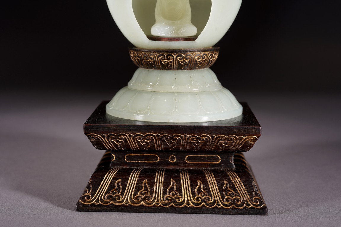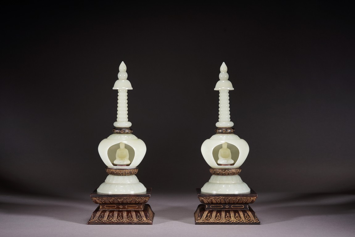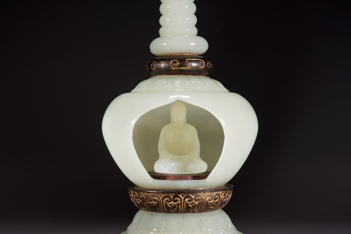 Each white jade pagoda containing a small white jade buddha, all supported on zitan carved stand.