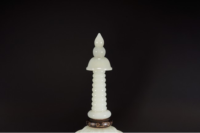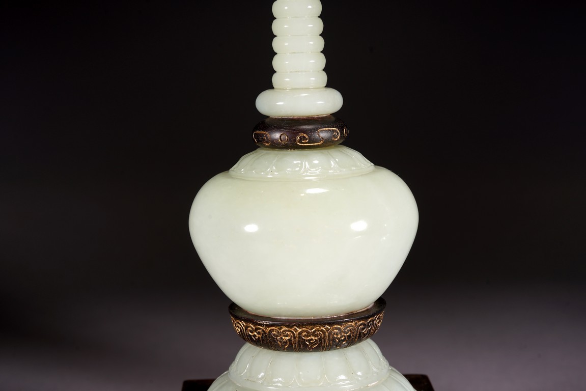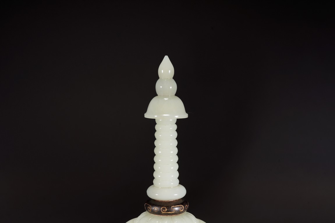 此對佛塔和田白玉材質,用材油潤細膩潔白似羊脂,氧化老化光澤明顯,保存完美。整塔七節拼接組成,象征勝造佛法七級佛途,塔首爲寶葫蘆,下接蓋頂,塔身與頂由錐狀塔頸連接,塔身镂空內膛開光,內藏莊嚴殊勝盤佛祖,供奉收藏均屬佳品。