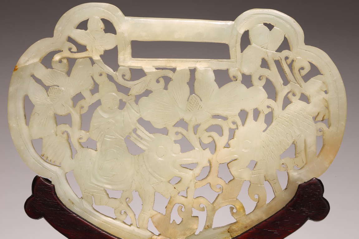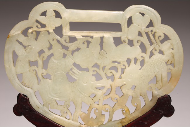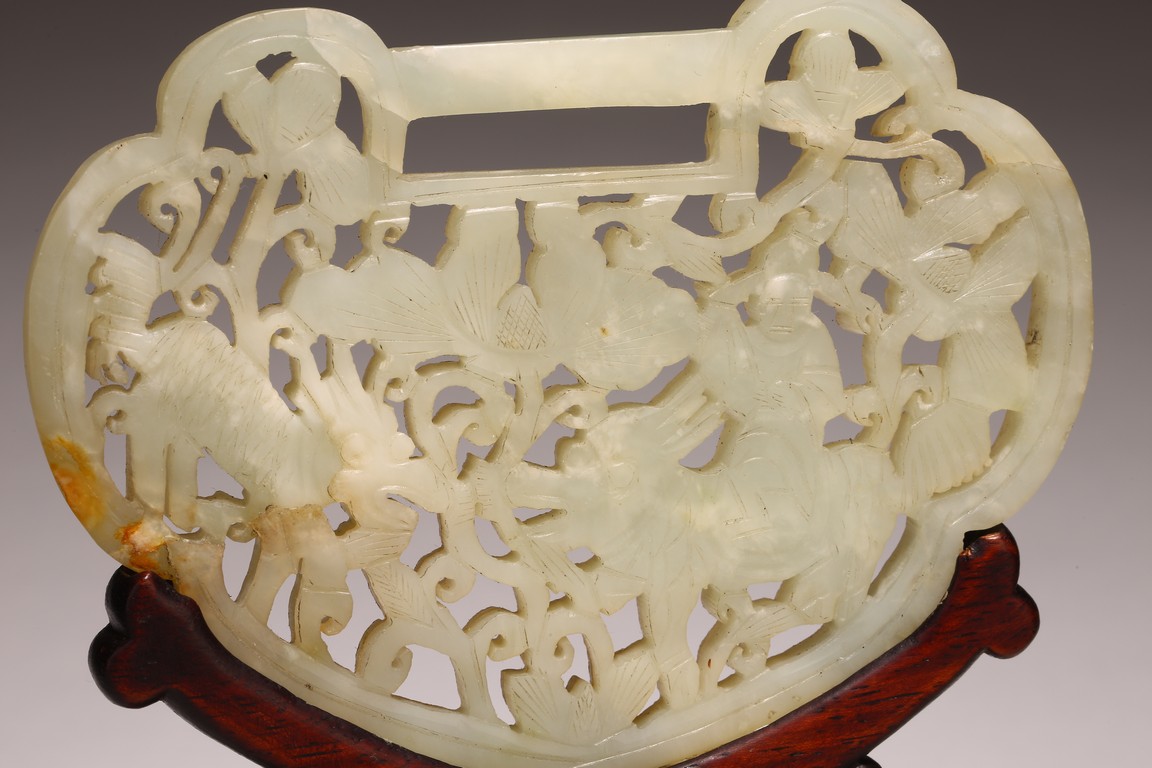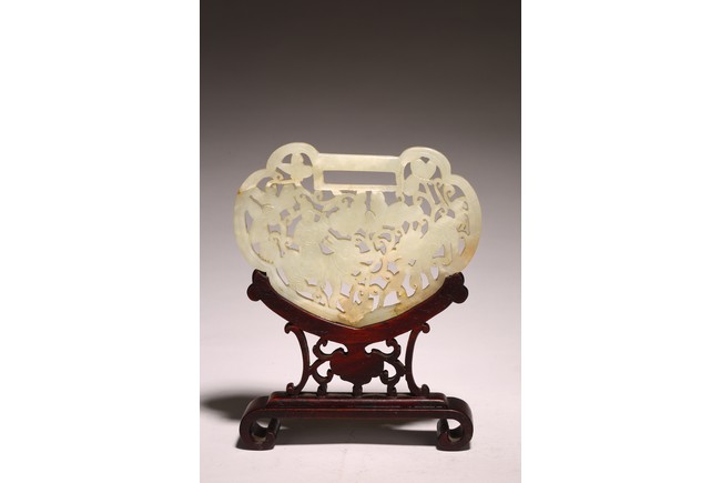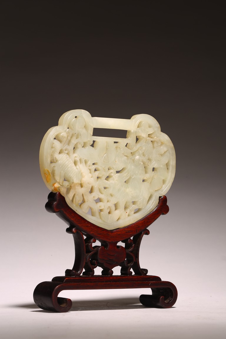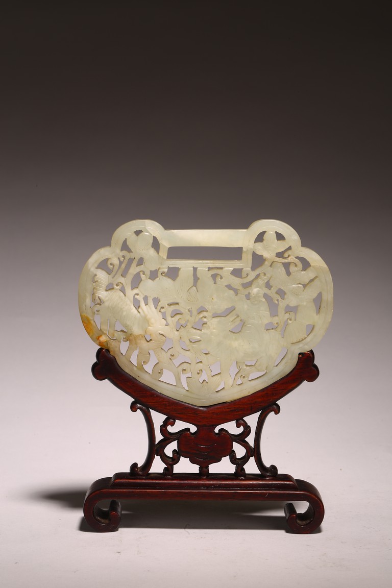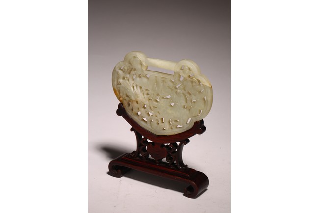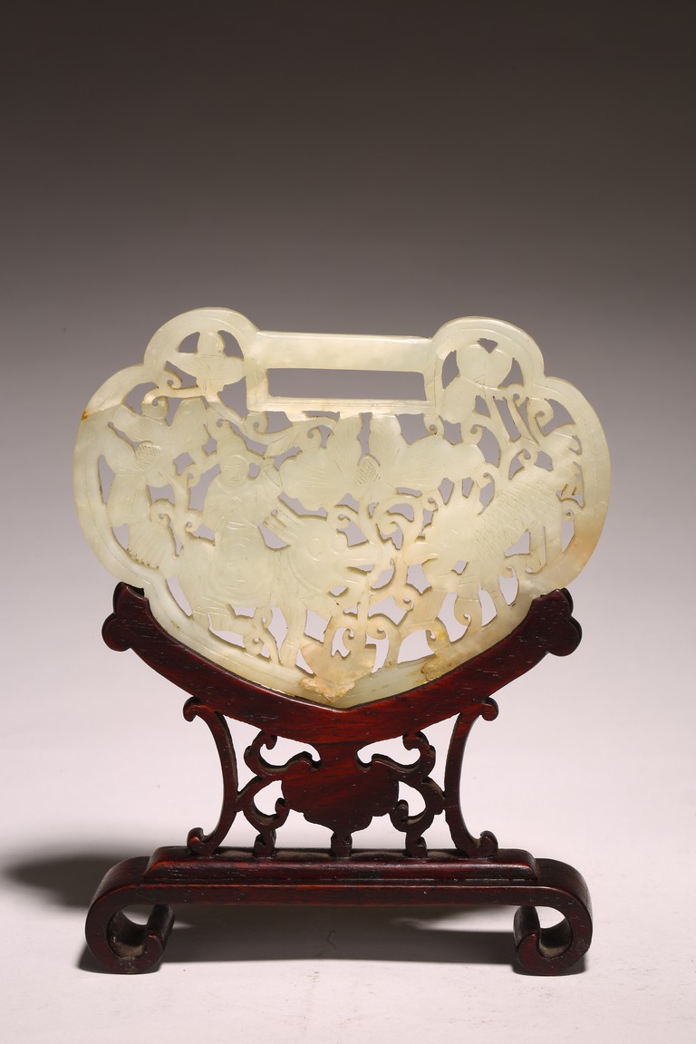 Qing Dynasty period. comprising ruyi shaped, reticulated 'lock' plaque carved and pierced to depict figures and mythical beasts, hardwood stand; and an oval celadon jade panel carved in relief with circular ruyi heads and lotus leaves