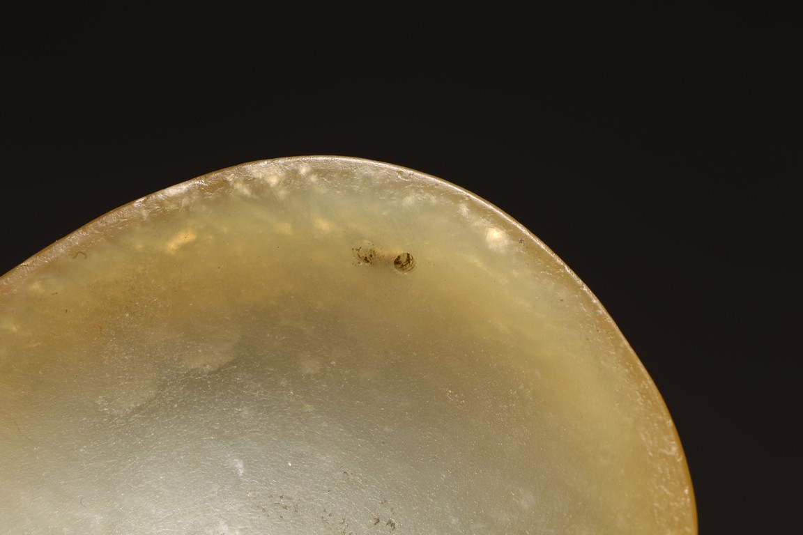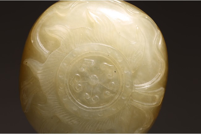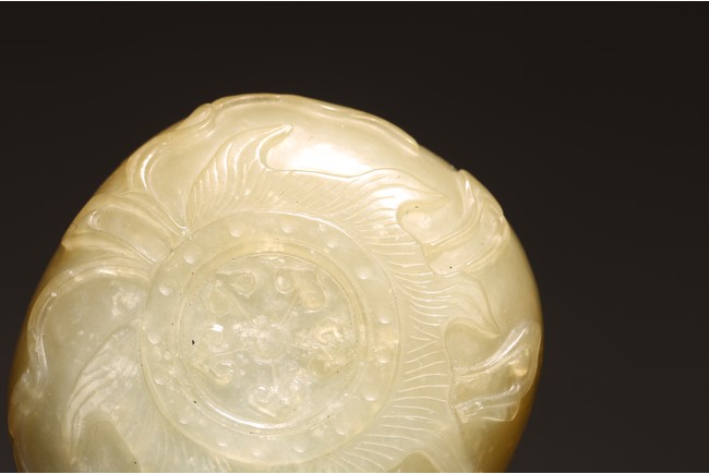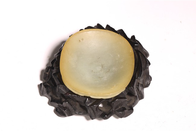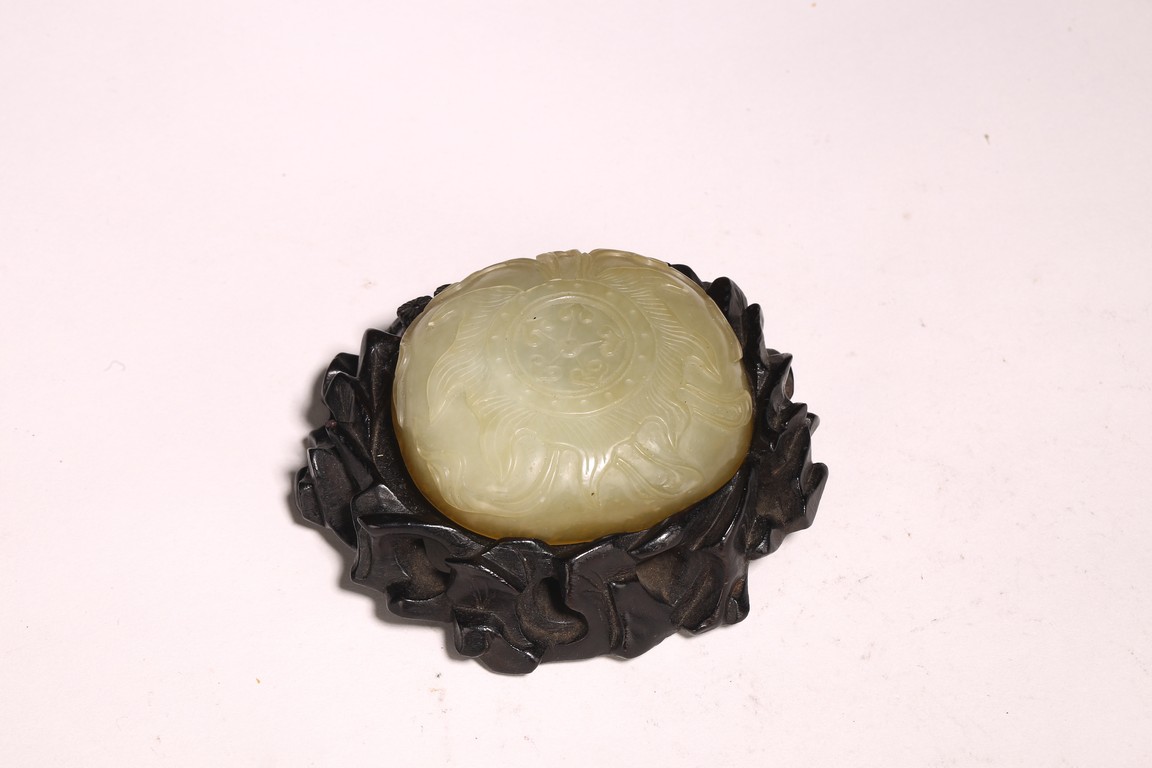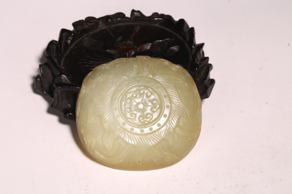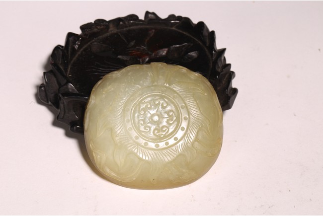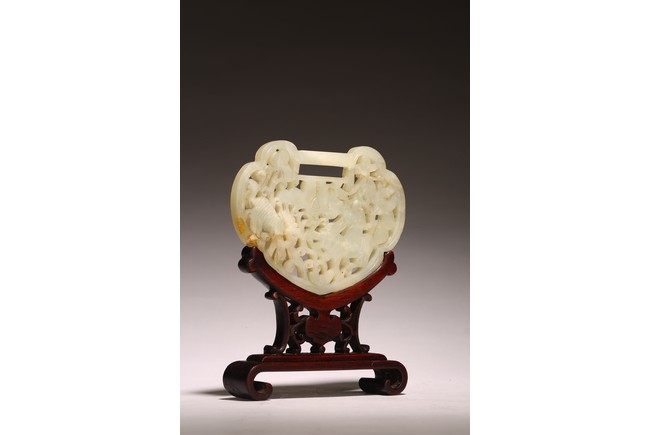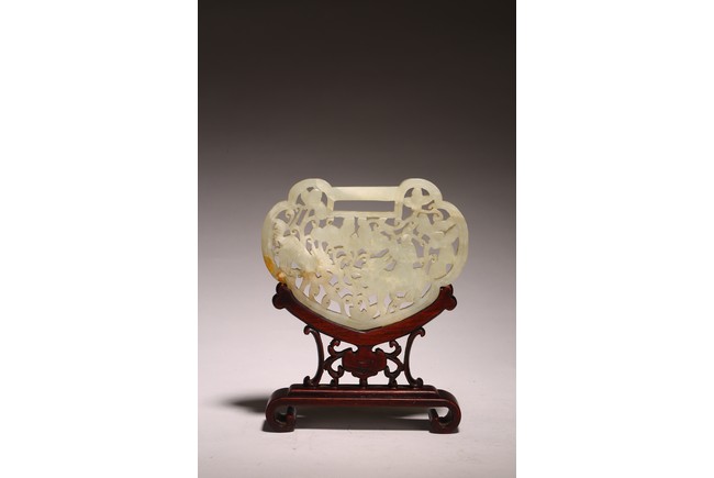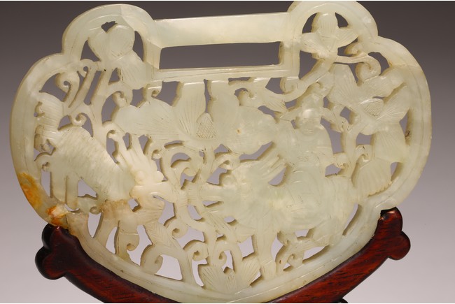 Qing Dynasty period. comprising ruyi shaped, reticulated 'lock' plaque carved and pierced to depict figures and mythical beasts, hardwood stand; and an oval celadon jade panel carved in relief with circular ruyi heads and lotus leaves
