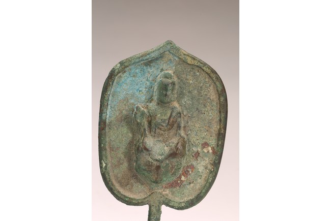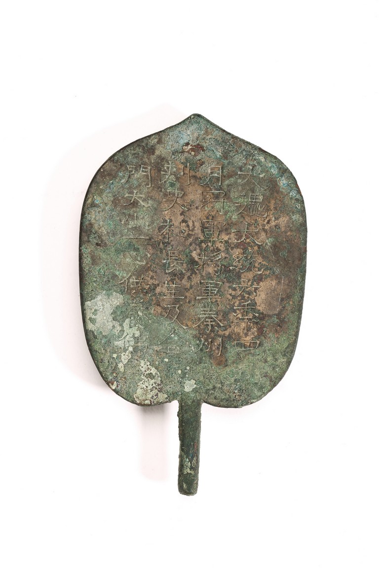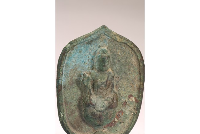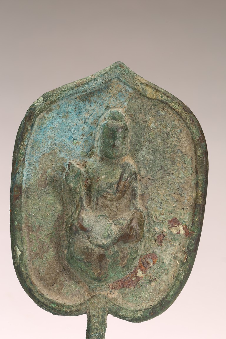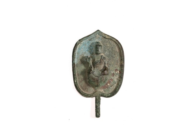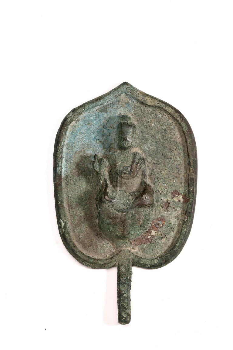 Northern Wei Dynasty or later. The leaf shaped mandorla plate cast with a relief figure of seated buddha, the reverse incised with inscription in 'Lishu' dated to the six year of 'datong' (641 A.D), the bronze with extensive green patina.