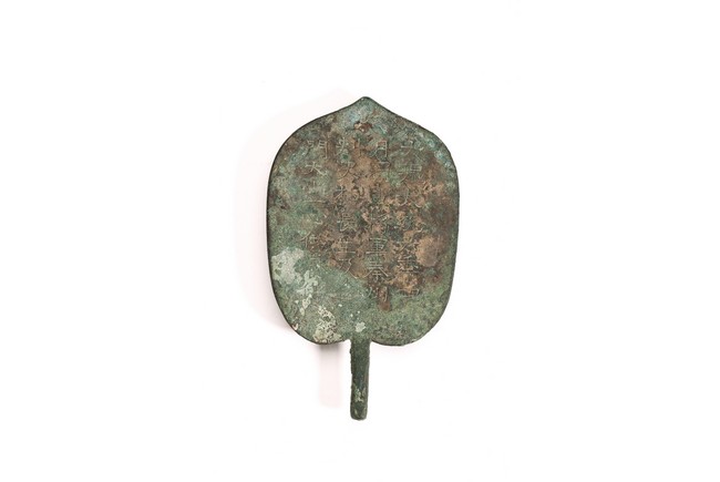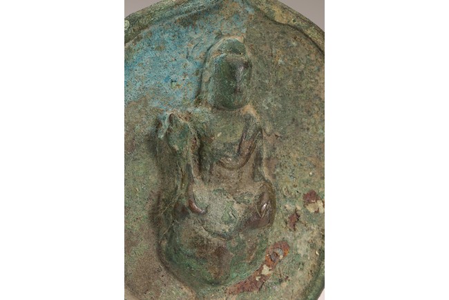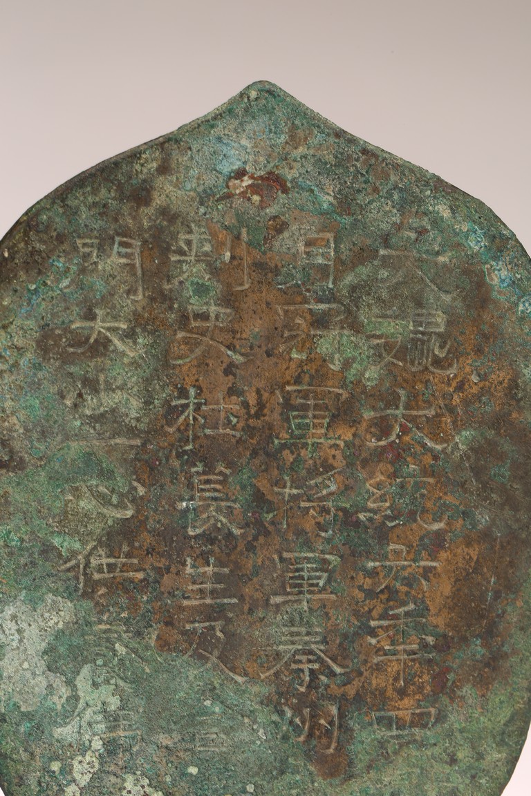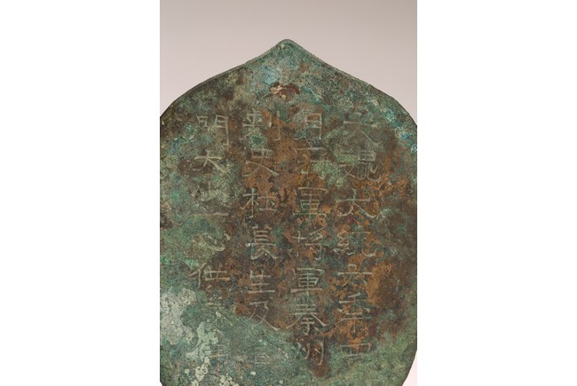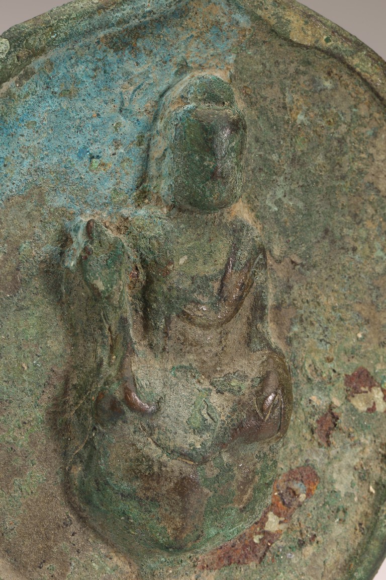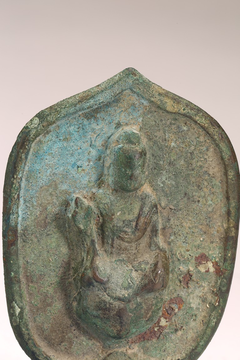 Northern Wei Dynasty or later. The leaf shaped mandorla plate cast with a relief figure of seated buddha, the reverse incised with inscription in 'Lishu' dated to the six year of 'datong' (641 A.D), the bronze with extensive green patina.