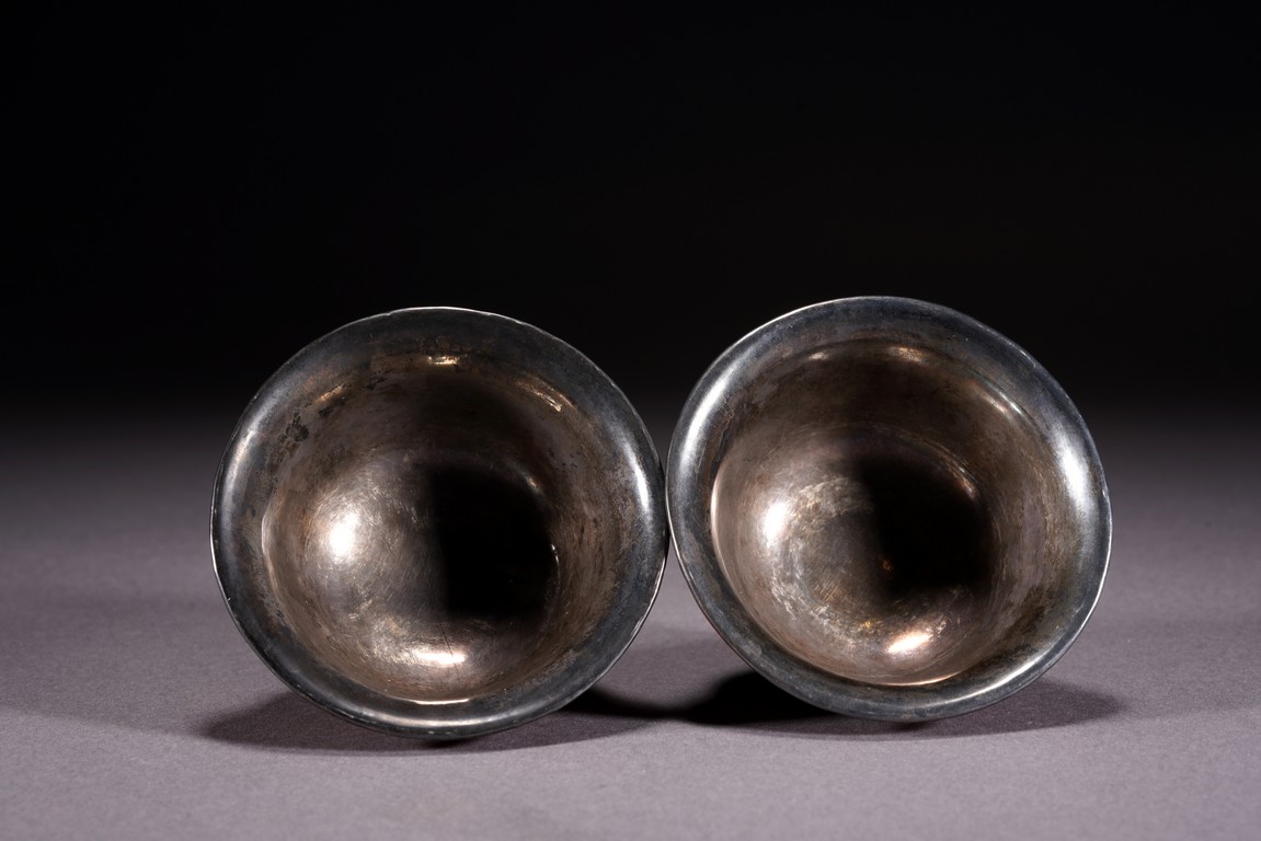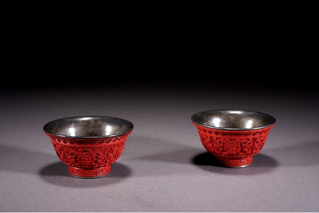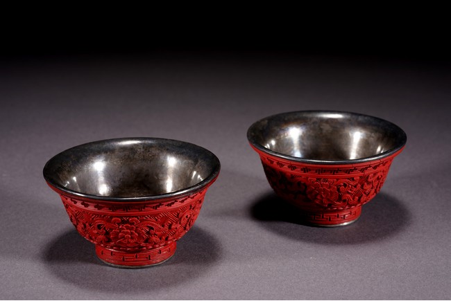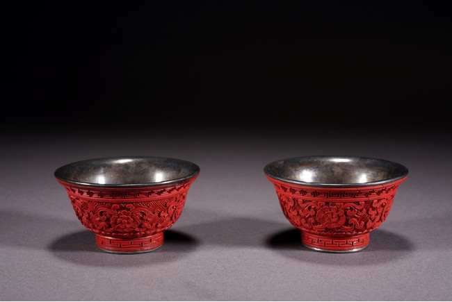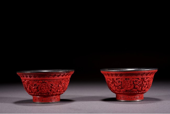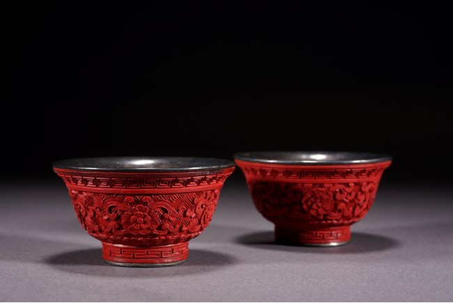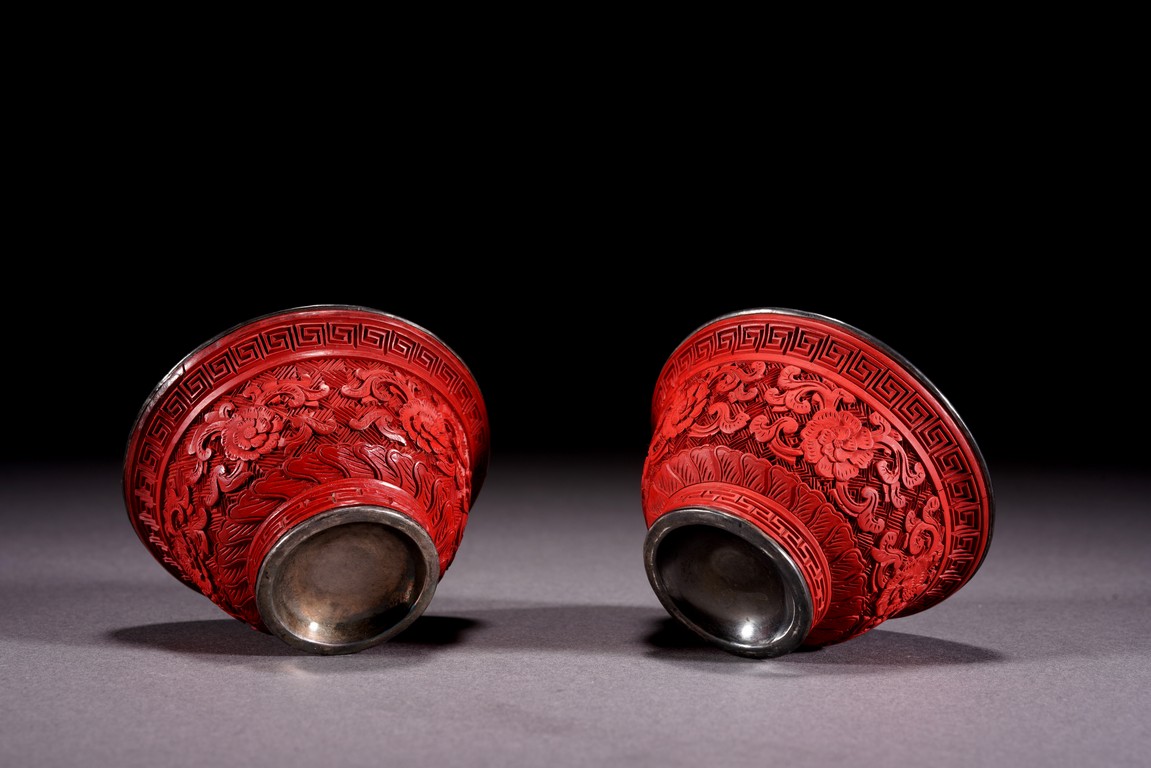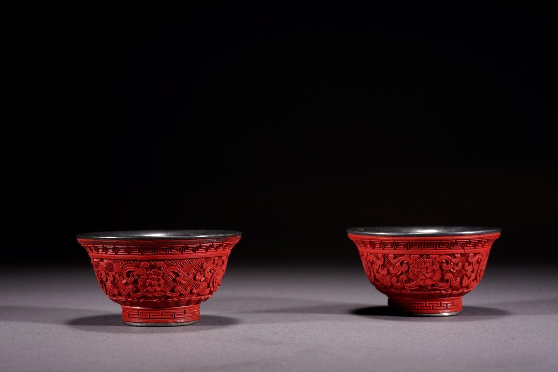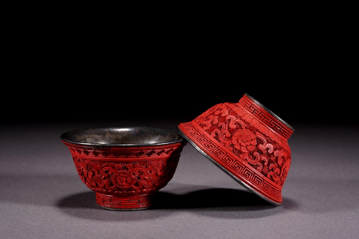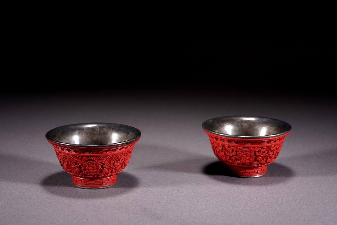 此杯成對,內膽為純銀材質,外壁為剔紅工藝,撇口與圈足處均為迴紋裝飾,周身花卉紋飾,刀工精湛細膩,色澤朱紅可人,成對保存完整,不可多得。
