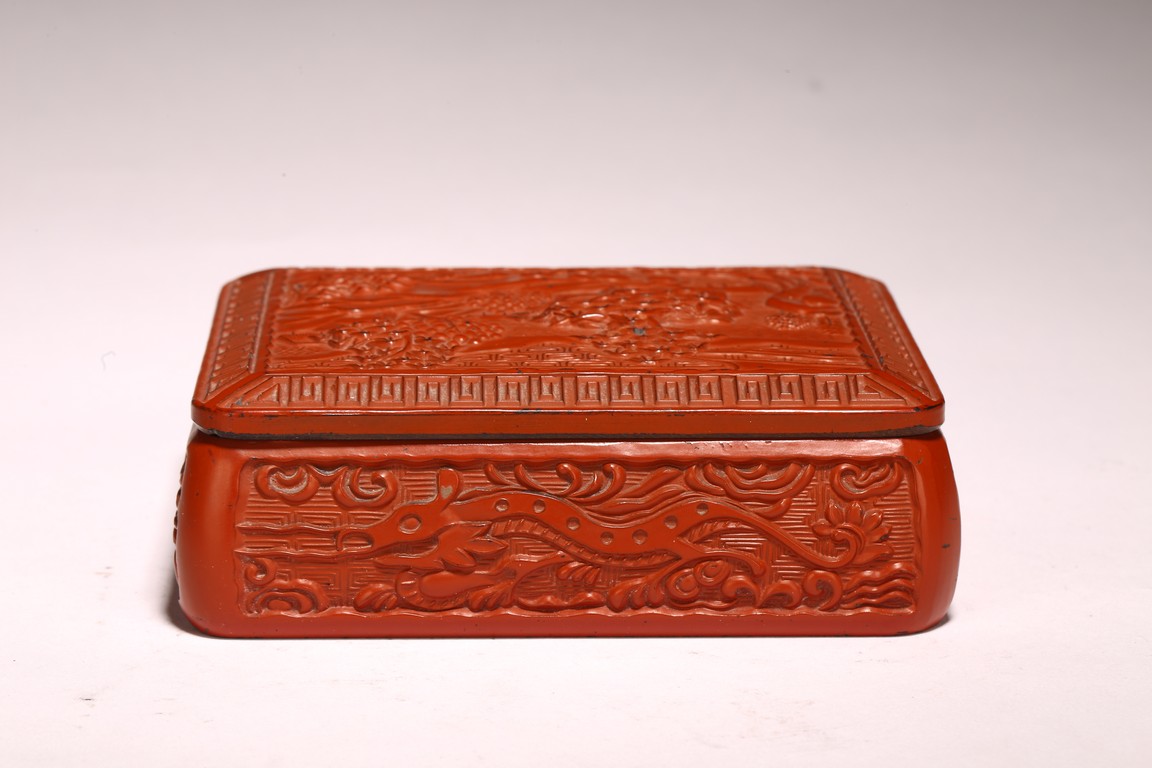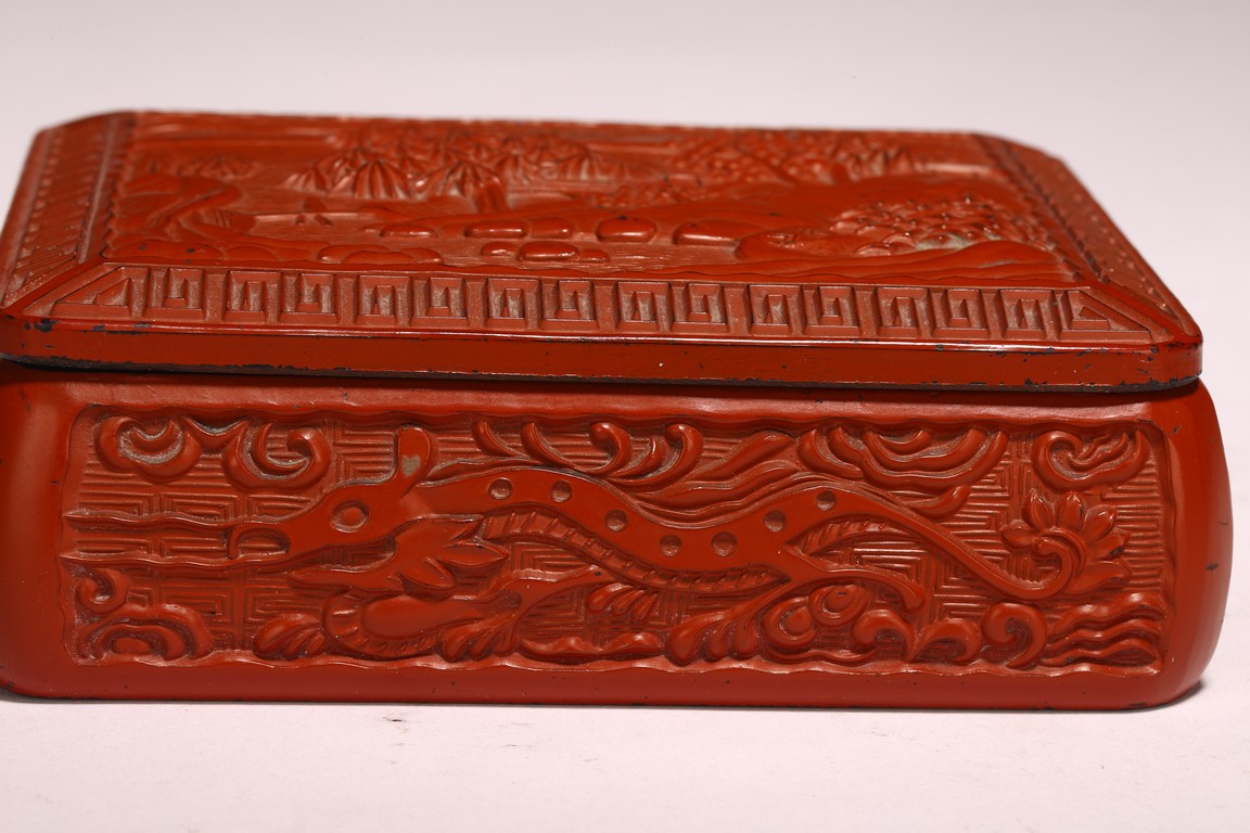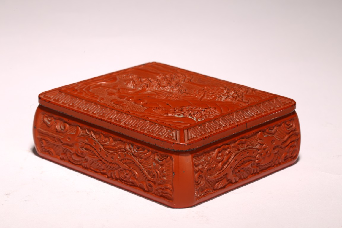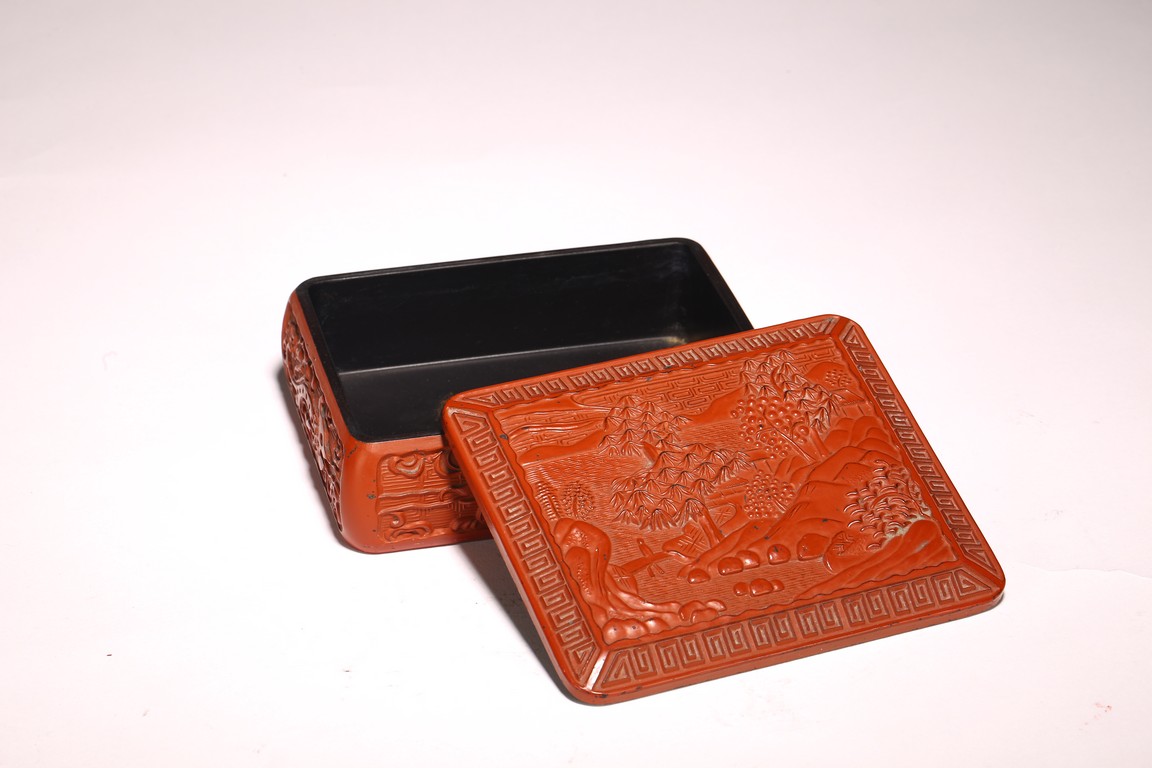 The box cover moulded with landscape scene, the sides decorated with stylized mythical beasts in relief, interior covered in black lacquer