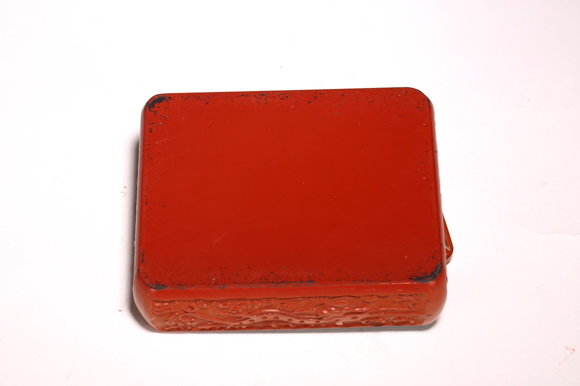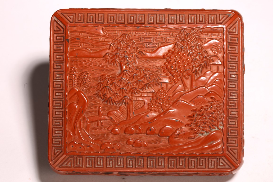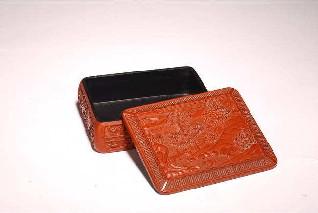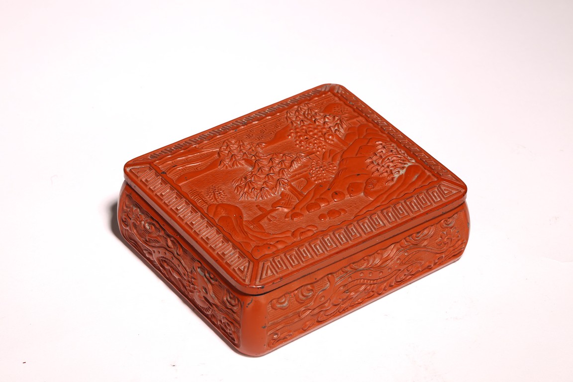 The box cover moulded with landscape scene, the sides decorated with stylized mythical beasts in relief, interior covered in black lacquer