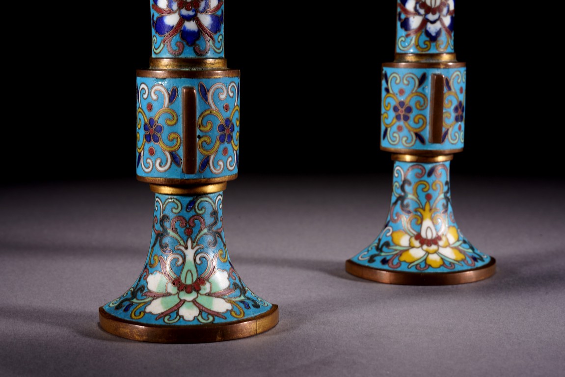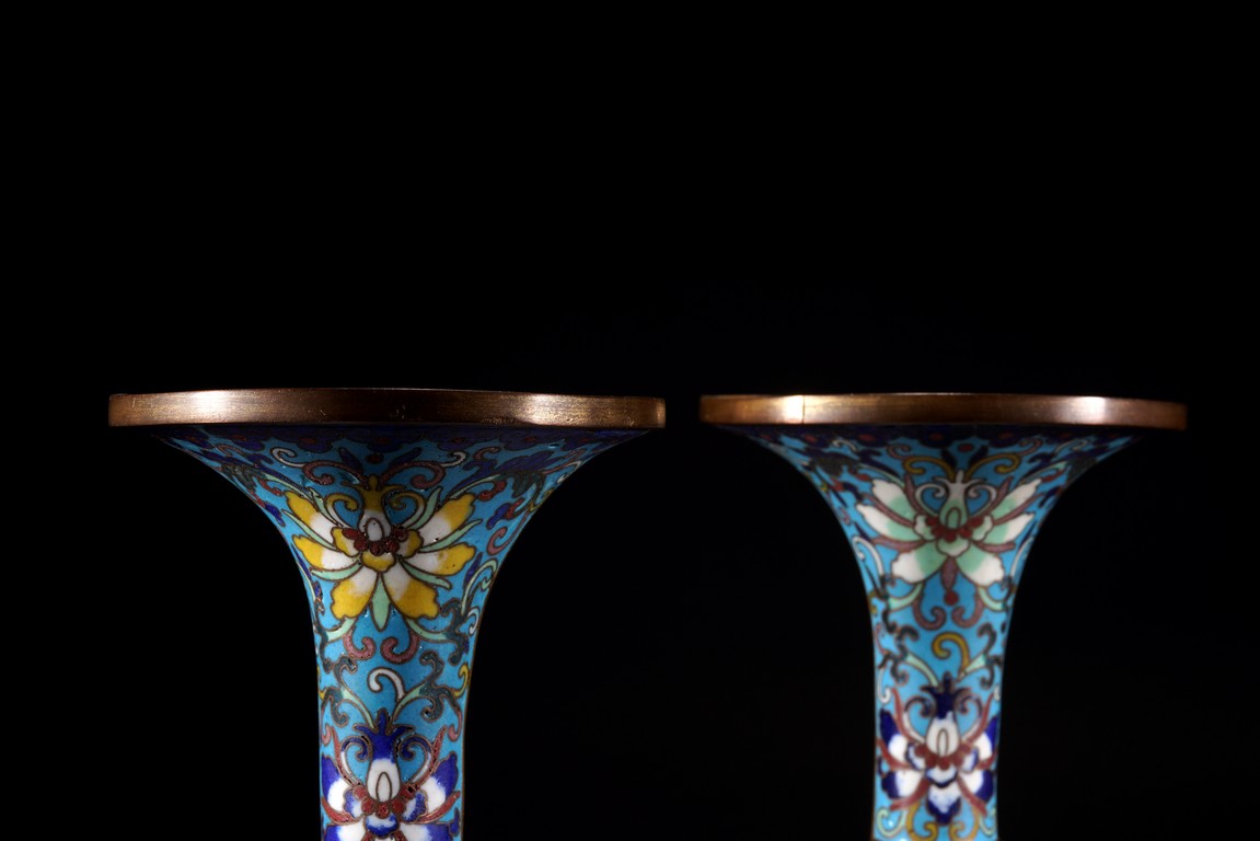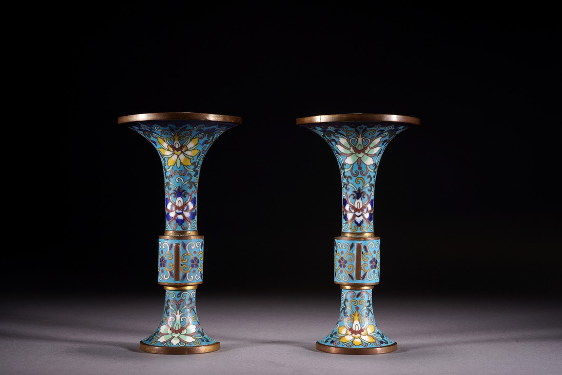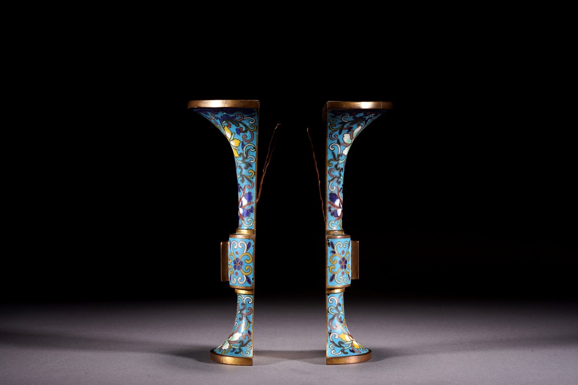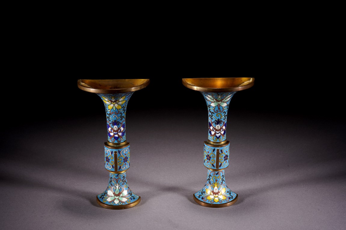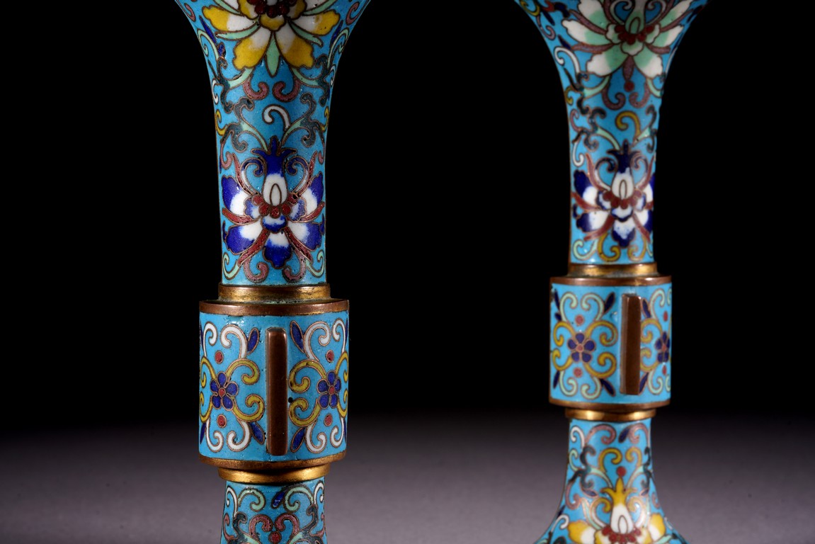 Late Qing Dynasty period. Of archaistic gu form, it is finely enamelled with stylized lotus scrolls reserved on blue ground, the interior and back richly gilt.