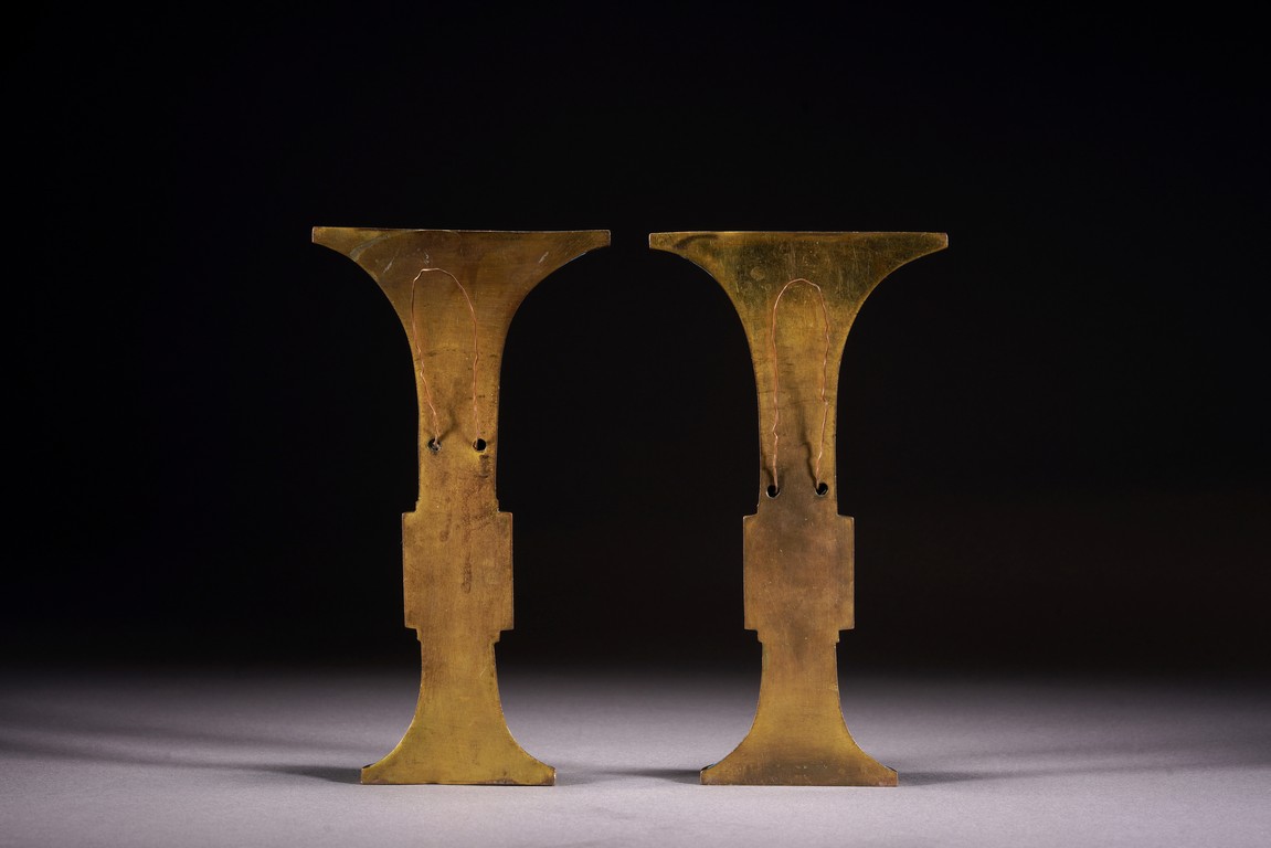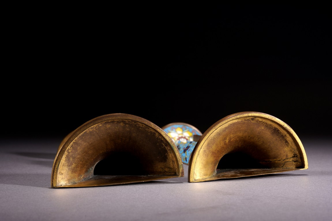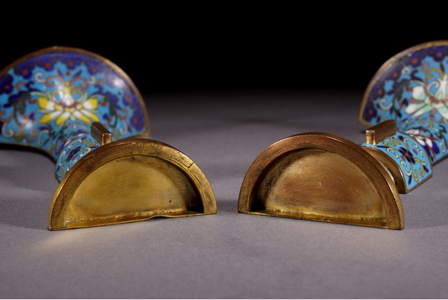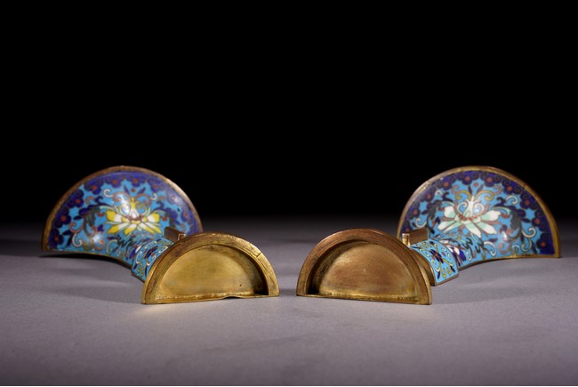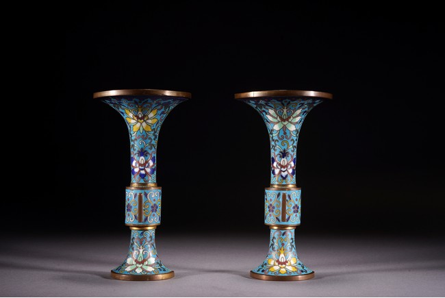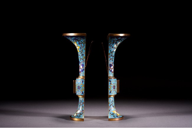 壁瓶亦稱掛瓶,是專門為懸掛於牆壁而設計燒造的一種瓶,器形為瓶的一半,即半器造型。壁瓶最早始見於明代宣德朝,萬曆朝最為流行,造型豐富,品種日益多樣。清代以乾隆朝最為鼎盛,造型規整且多種多樣。此件掐絲琺瑯壁瓶花觚狀,背部有孔,用於懸掛。通體天藍色地,纏枝蓮寶相花紋飾,圖案佈局典雅,色彩濃重華麗,工藝細膩精湛,最宜書齋插花觀賞。