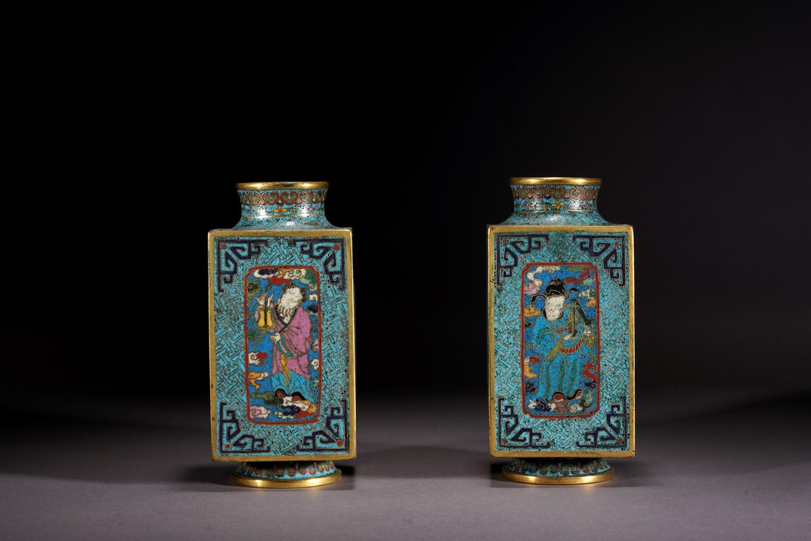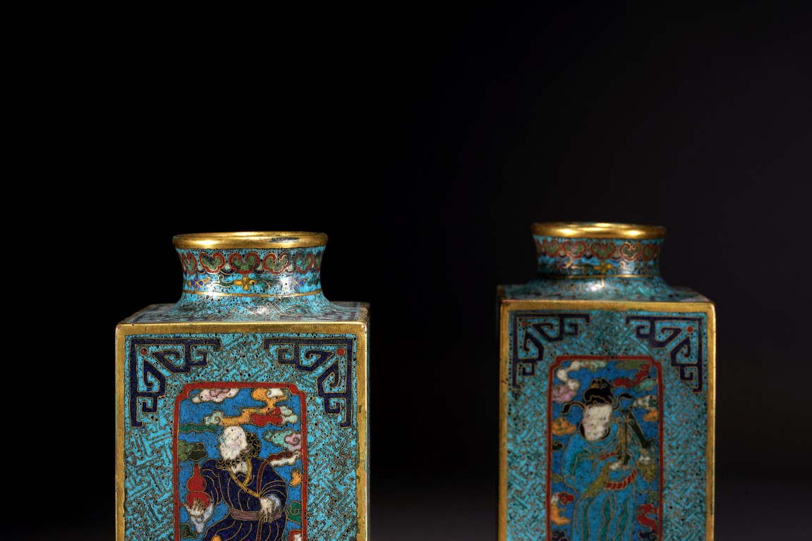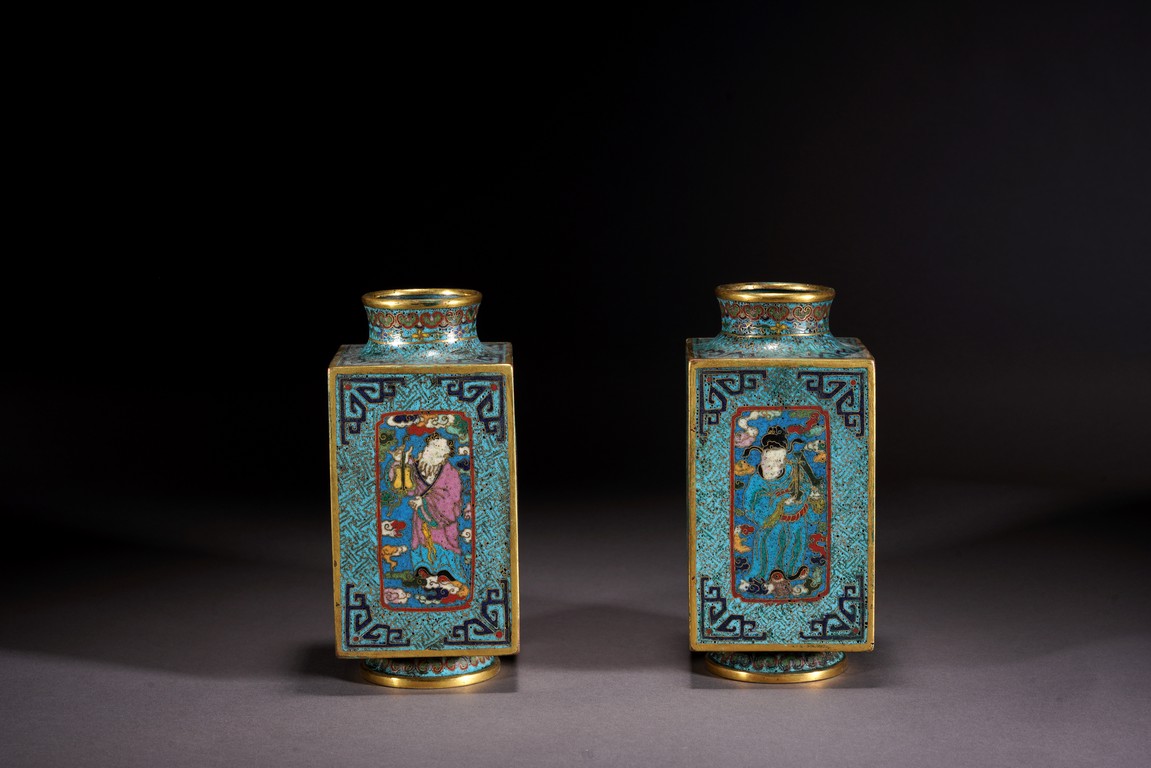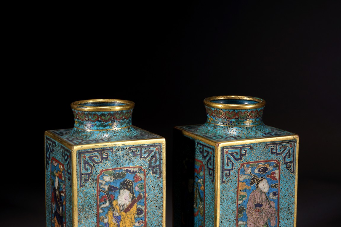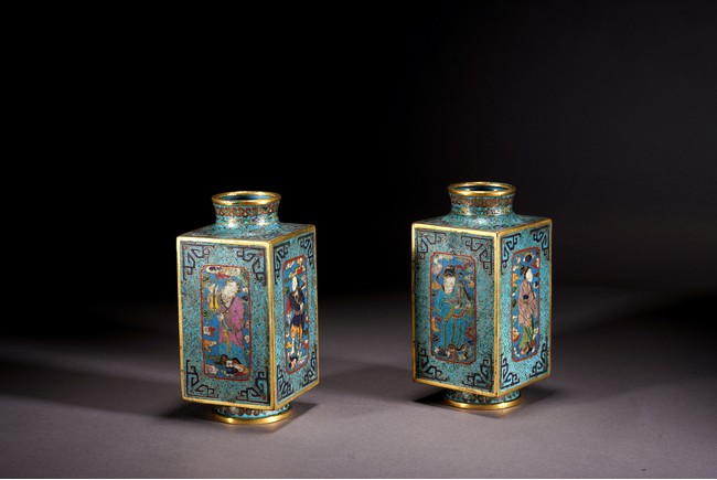 這件琮式瓶爲清代仿古造型,琮是中國古代用于祭祀的玉質筒狀物,在玉器中,琮是用于祭地的玉器,檔次非常之高,此件作品造型端莊,比例俊美,掐絲人物靈動自然,古樸不失典雅,非常難得。