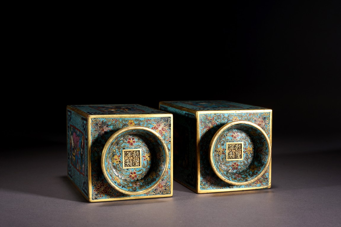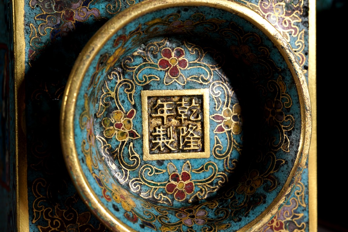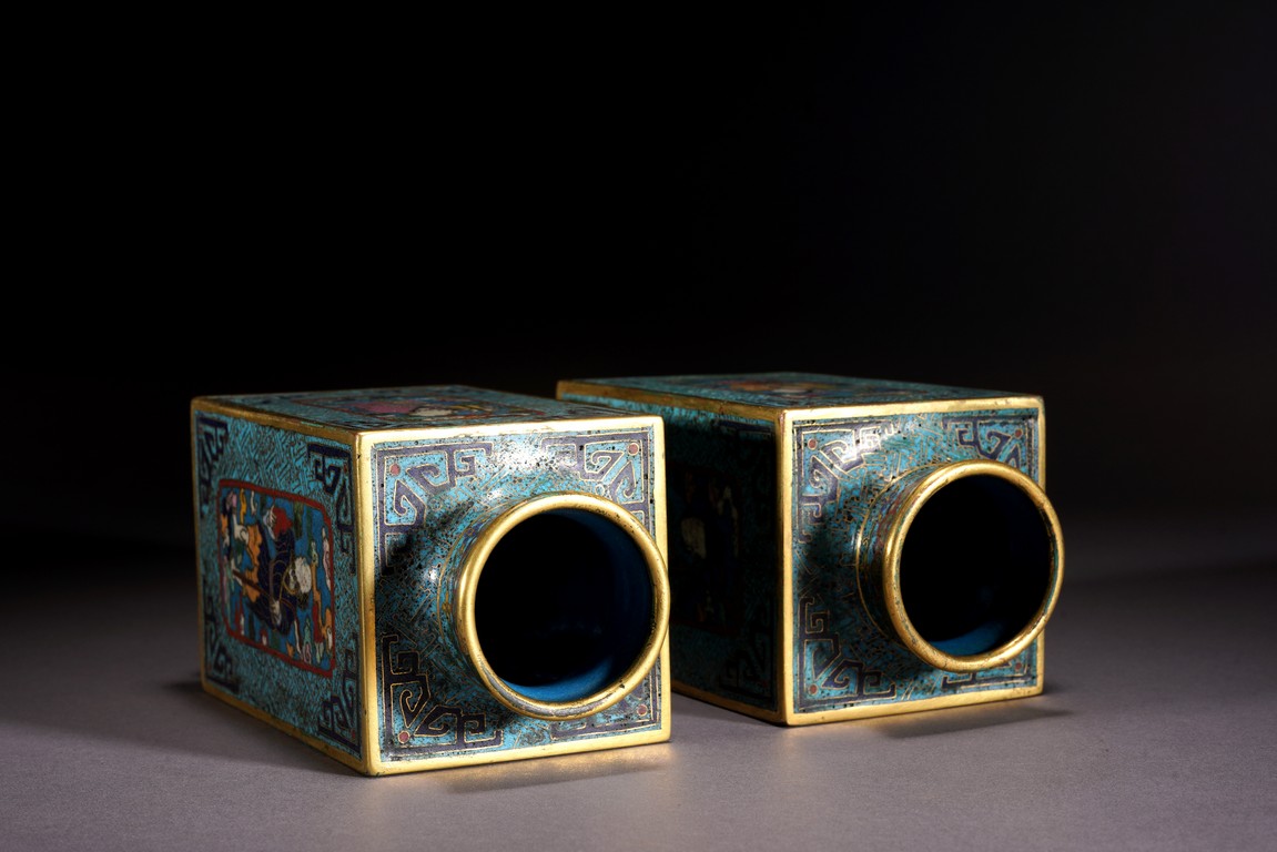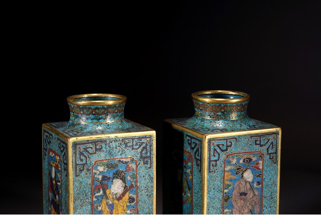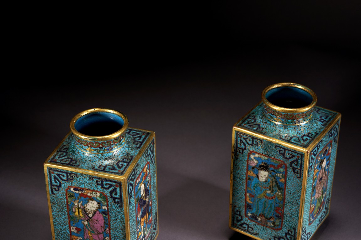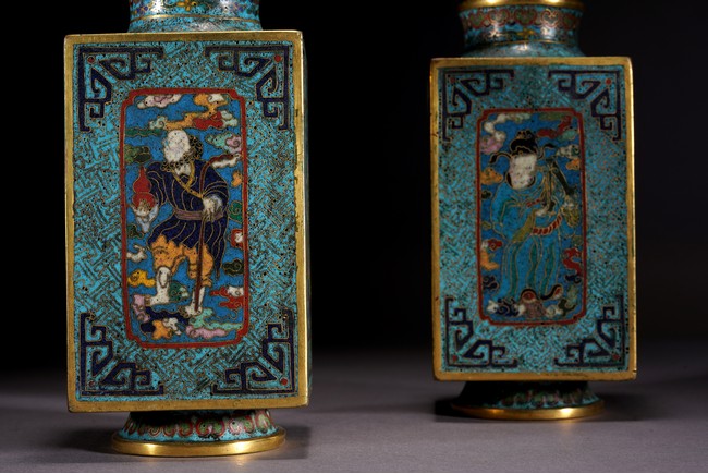 這件琮式瓶爲清代仿古造型,琮是中國古代用于祭祀的玉質筒狀物,在玉器中,琮是用于祭地的玉器,檔次非常之高,此件作品造型端莊,比例俊美,掐絲人物靈動自然,古樸不失典雅,非常難得。