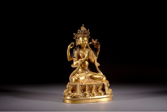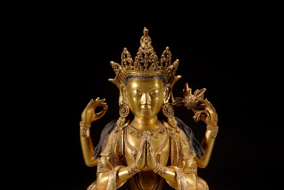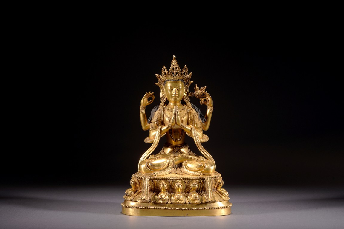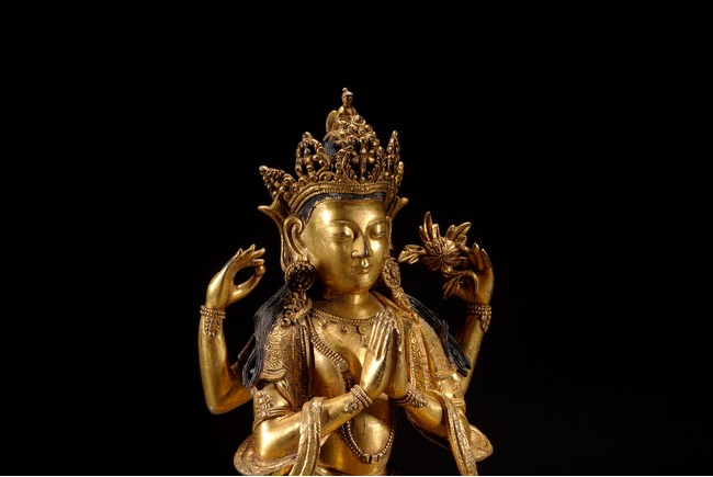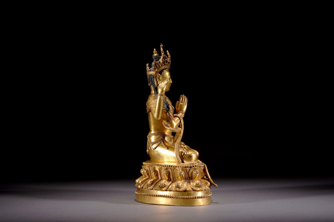 Qing Dynasty period. Cast in vajra paryankasana with the principal hands in namaskar mudra, the outer proper left hand raised and holding a blossom at the shoulder, with an elaborate crown, extravagantly beaded jewelry, and celestial sashes adorning the body and slender limbs, all raised on a double-lotus base