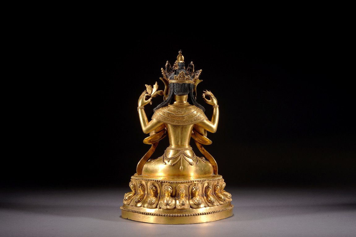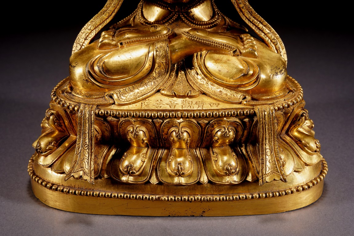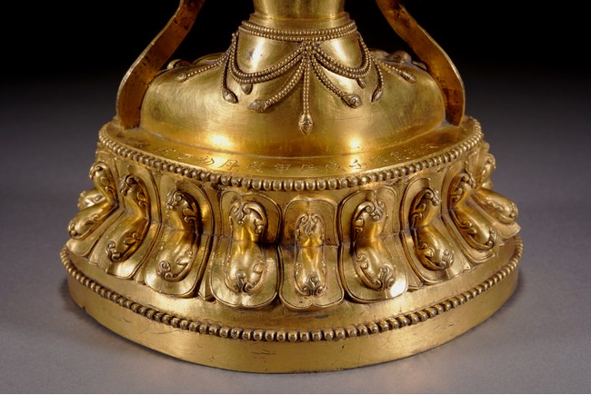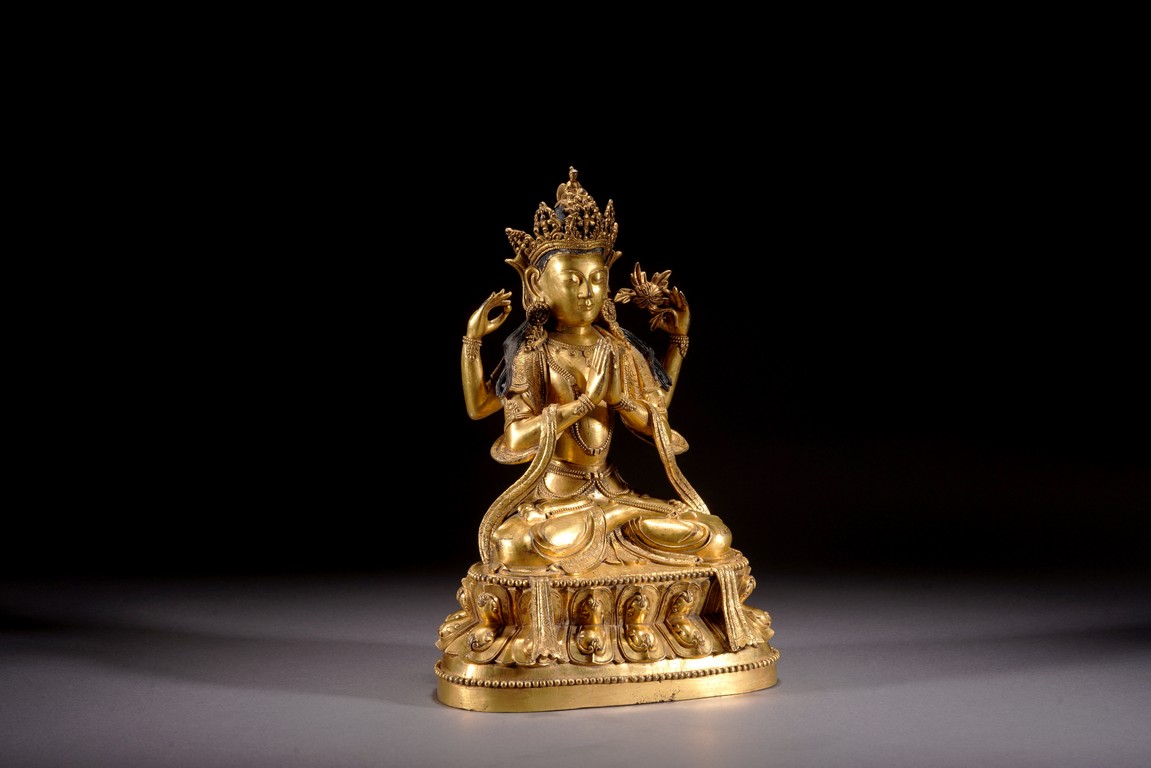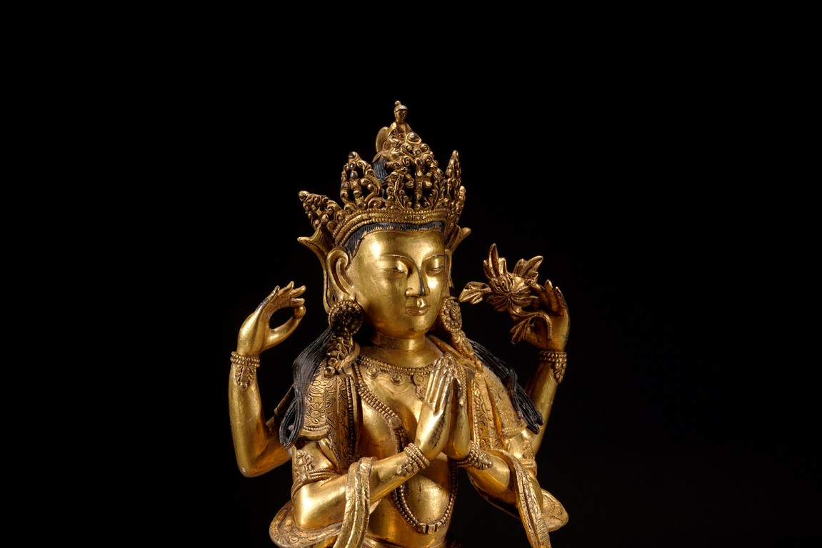 Qing Dynasty period. Cast in vajra paryankasana with the principal hands in namaskar mudra, the outer proper left hand raised and holding a blossom at the shoulder, with an elaborate crown, extravagantly beaded jewelry, and celestial sashes adorning the body and slender limbs, all raised on a double-lotus base