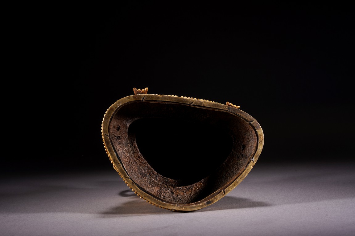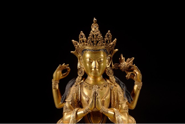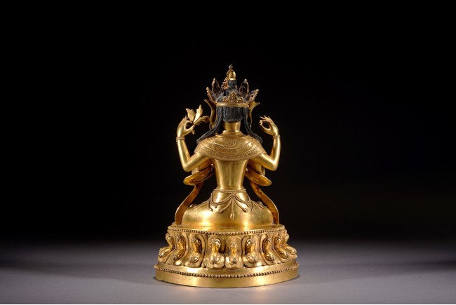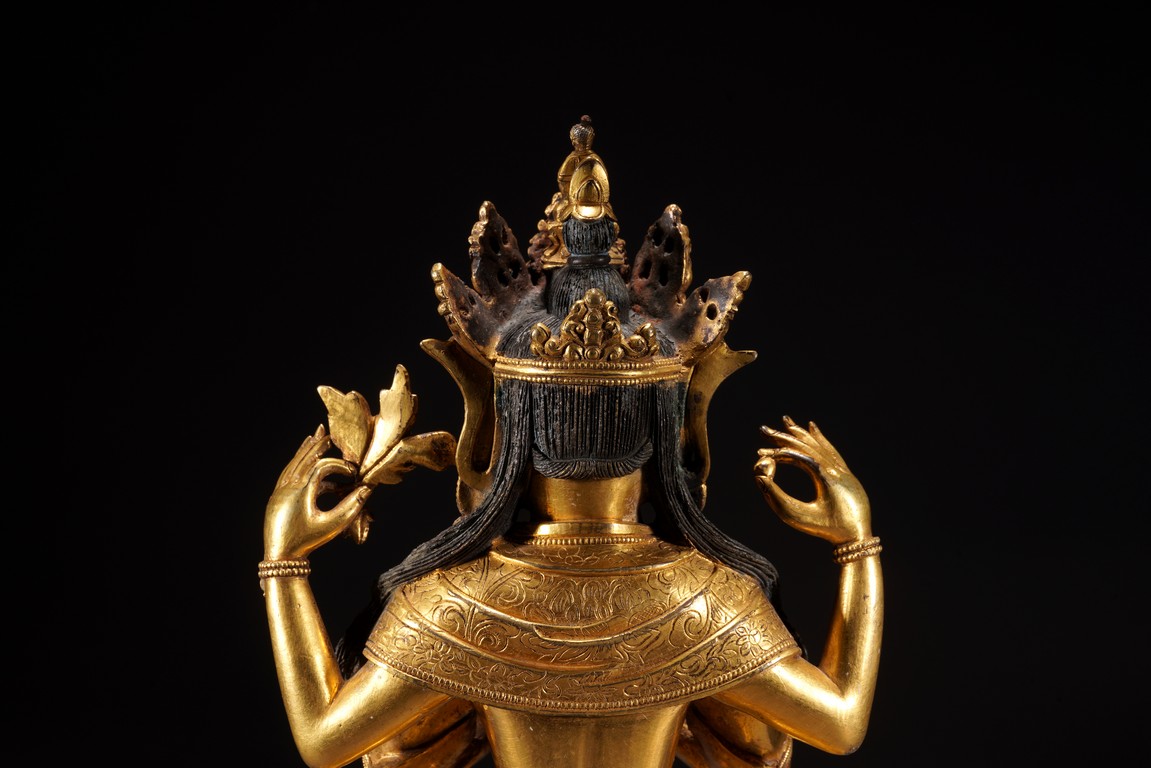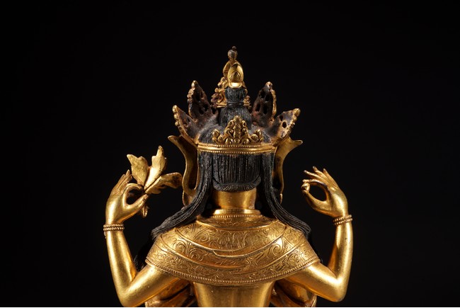 觀音頭戴五葉寶冠,寶繒帶從兩側飛起,髮辮垂至兩肩,髮色染青。身披袈裟,佩瓔珞,下兩手合十,上舉兩手分別持蓮花、寶珠。全跏趺坐,下為雙層蓮台,蓮瓣中央凸起刻紋。整體造型端莊,佛衣上線刻紋樣繁複,瓔珞華麗,裝飾效果極強。從風格上看,受到明顯的喀爾喀造像影響,於故宮博物院所藏康熙為其祖母孝莊皇太后祝壽所做四臂觀音在風格上有異曲同工之妙,康熙時期由於孝莊太后出身蒙古,宮廷與蒙古間有著緊密的聯繫,這些具有濃重喀爾喀風格影響的造像也是在這樣的文化氛圍下產生的,成為清代宮廷造像中極具特色的組成部分。