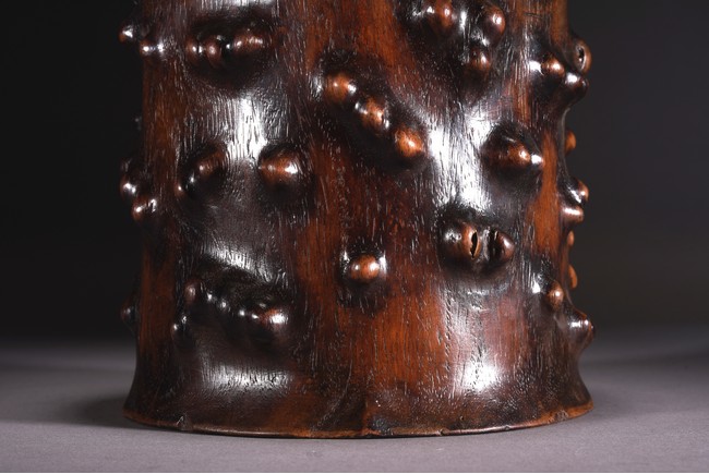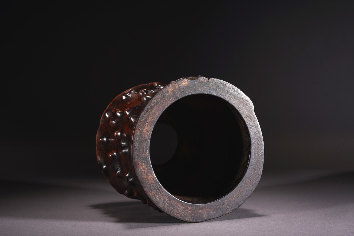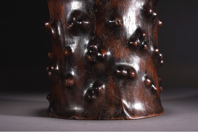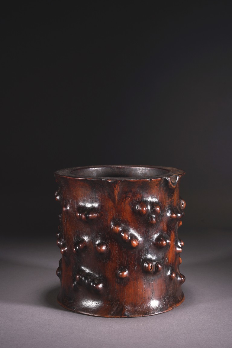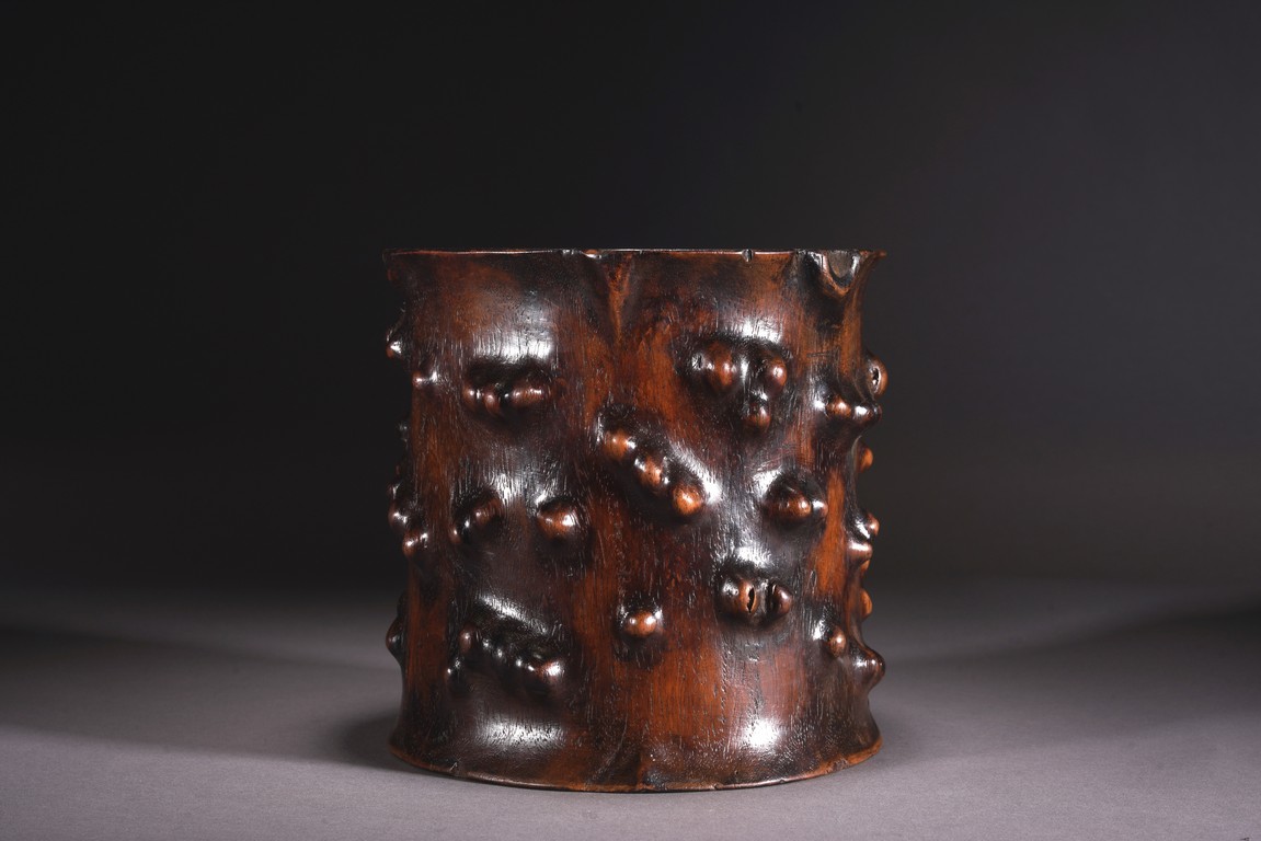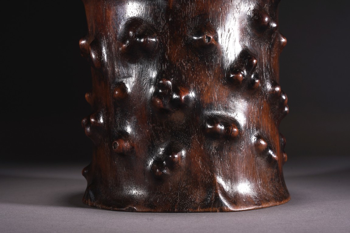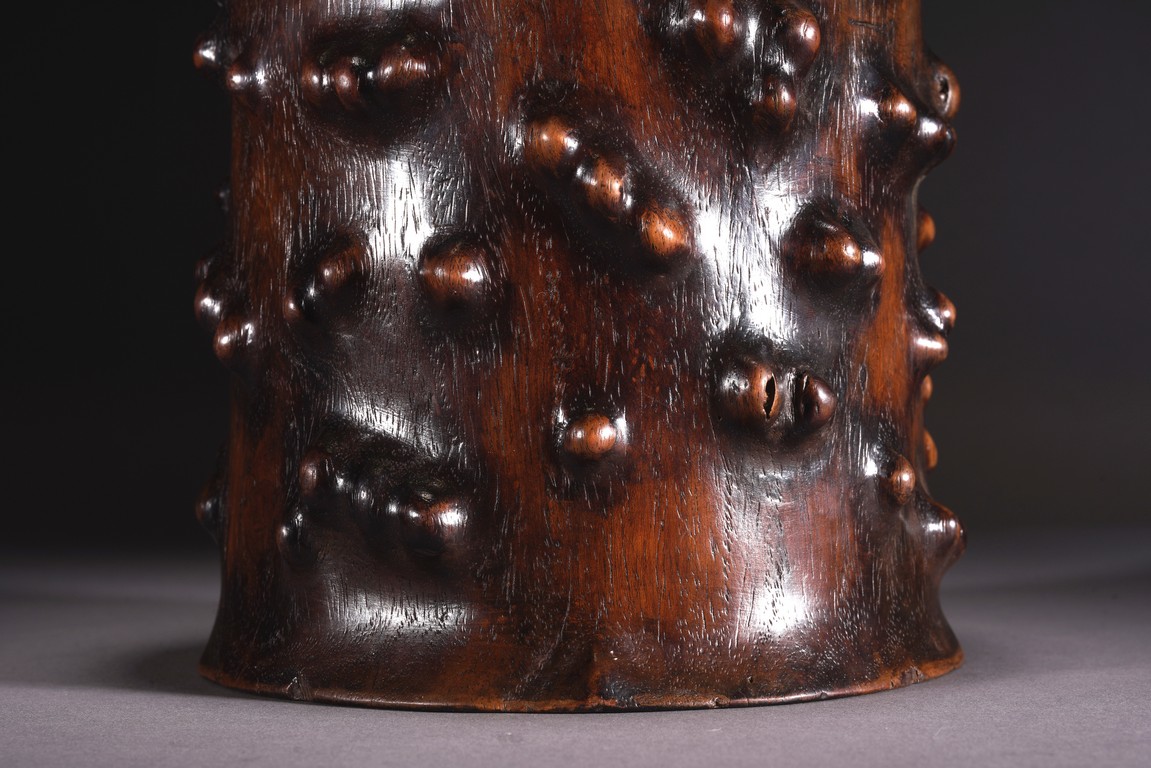 Qing Dynasty period. of cylindrical form with naturalistically gnarled and whorled exterior suggestive of grottos and rivers, the surface comprising grooves, circular pools and diamond-shaped knots, the chestnut-brown wood of rich patina with darker striations, the flat base a circular hole.