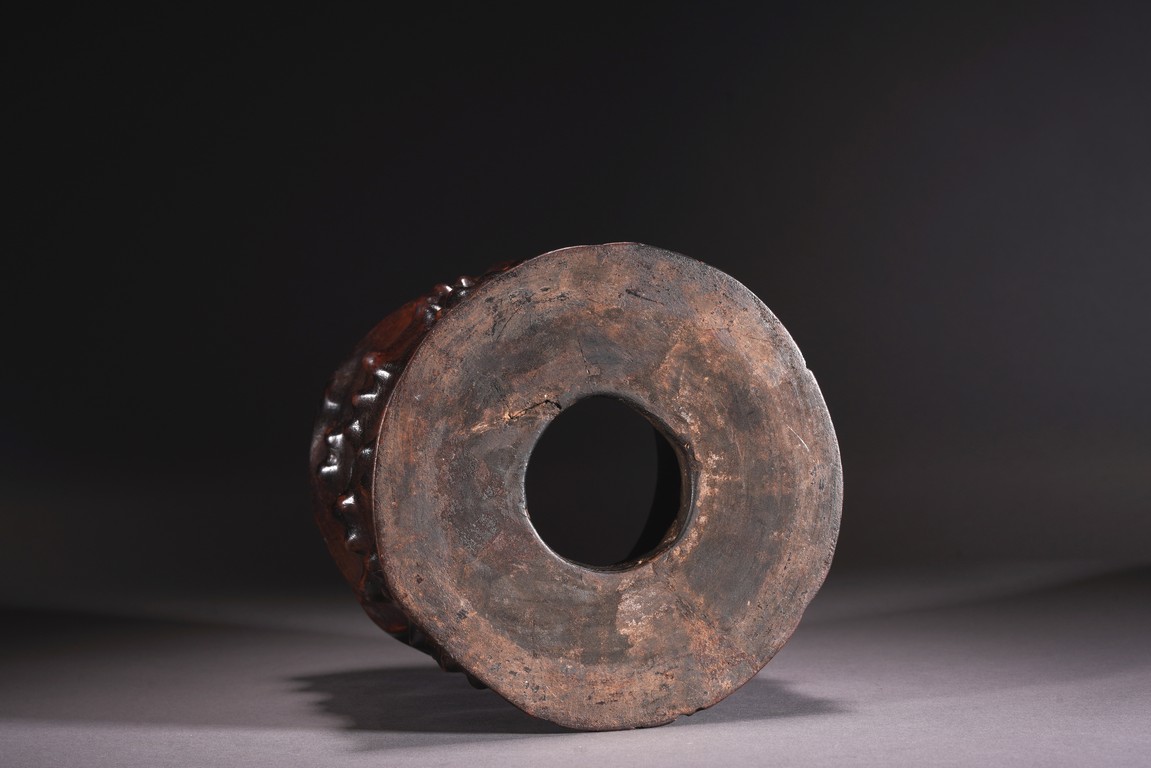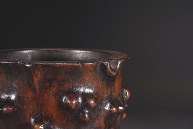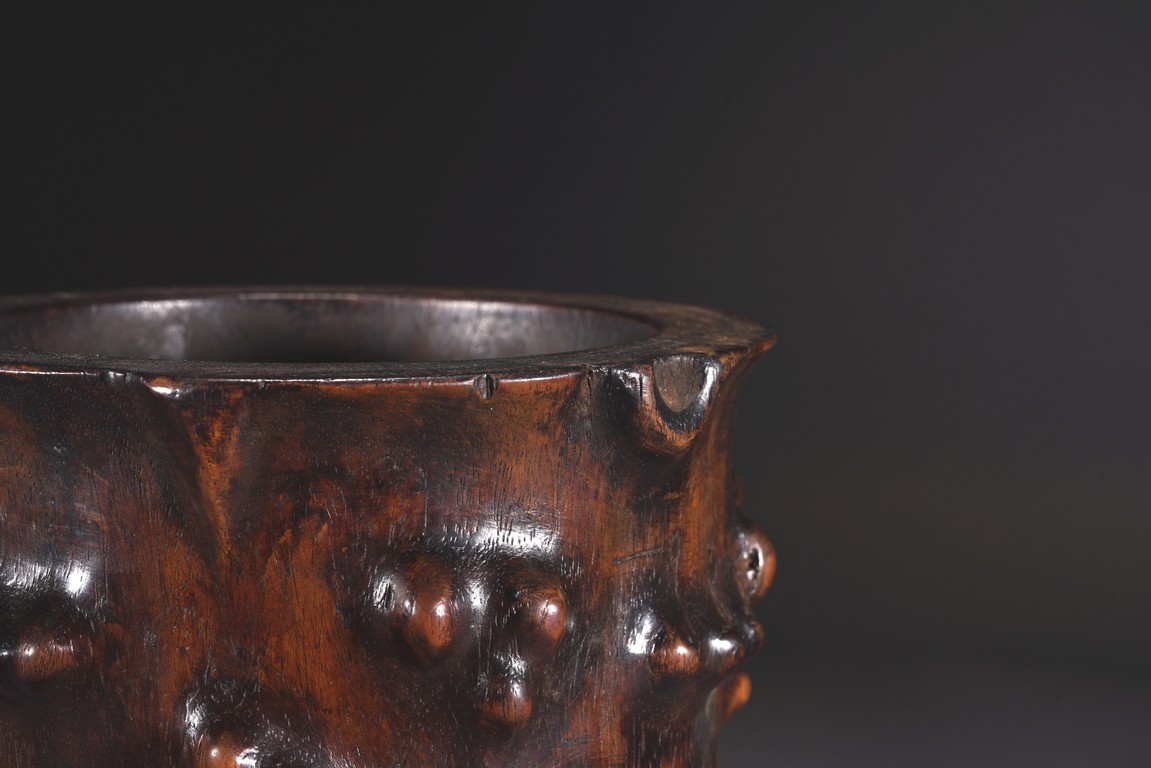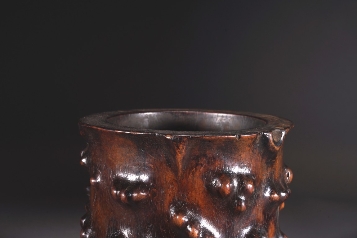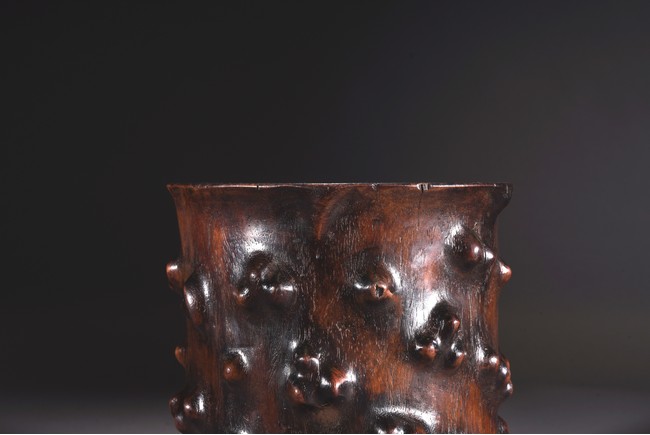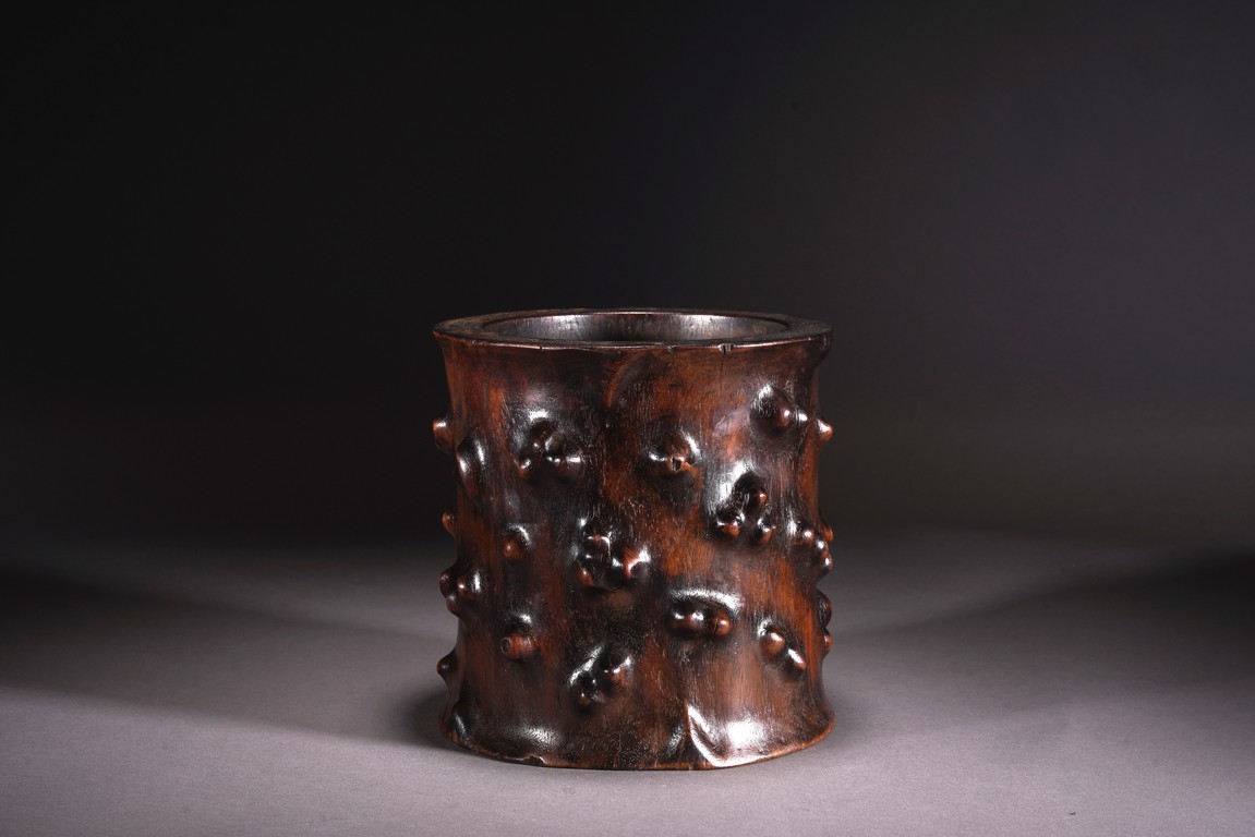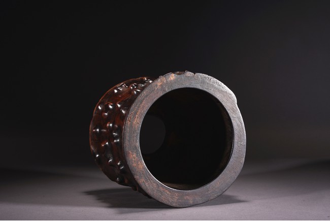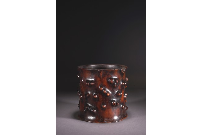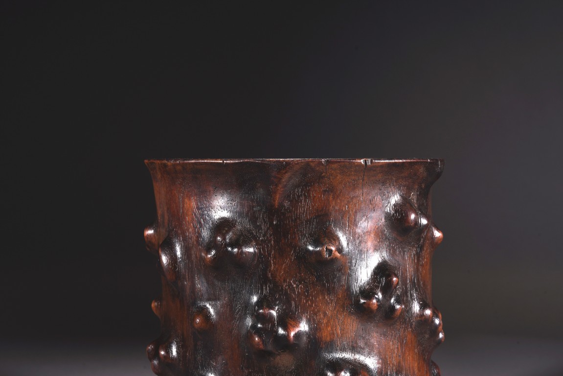 Qing Dynasty period. of cylindrical form with naturalistically gnarled and whorled exterior suggestive of grottos and rivers, the surface comprising grooves, circular pools and diamond-shaped knots, the chestnut-brown wood of rich patina with darker striations, the flat base a circular hole.