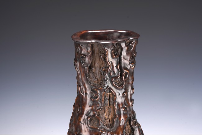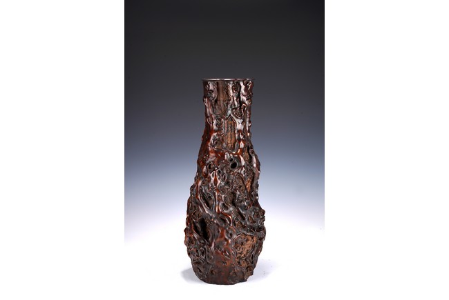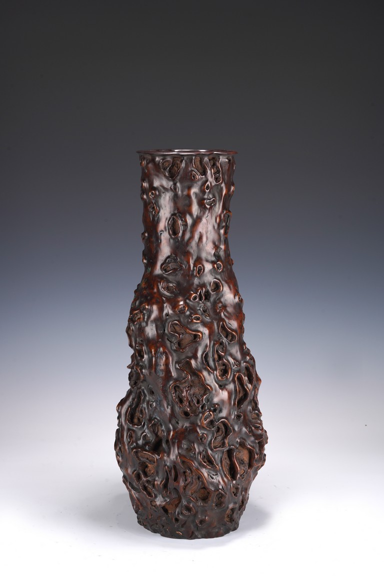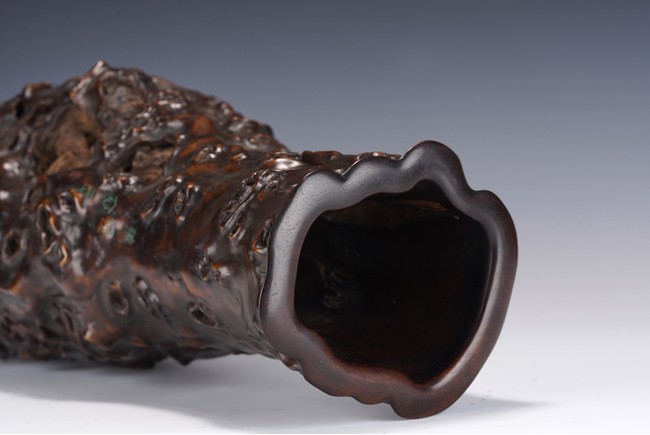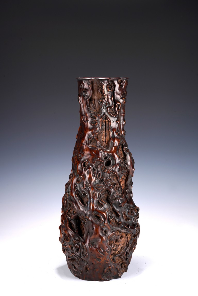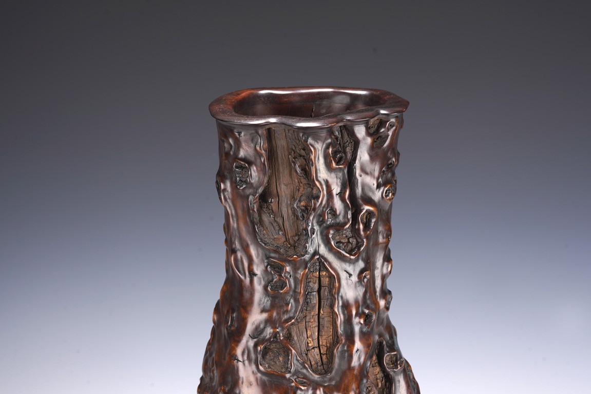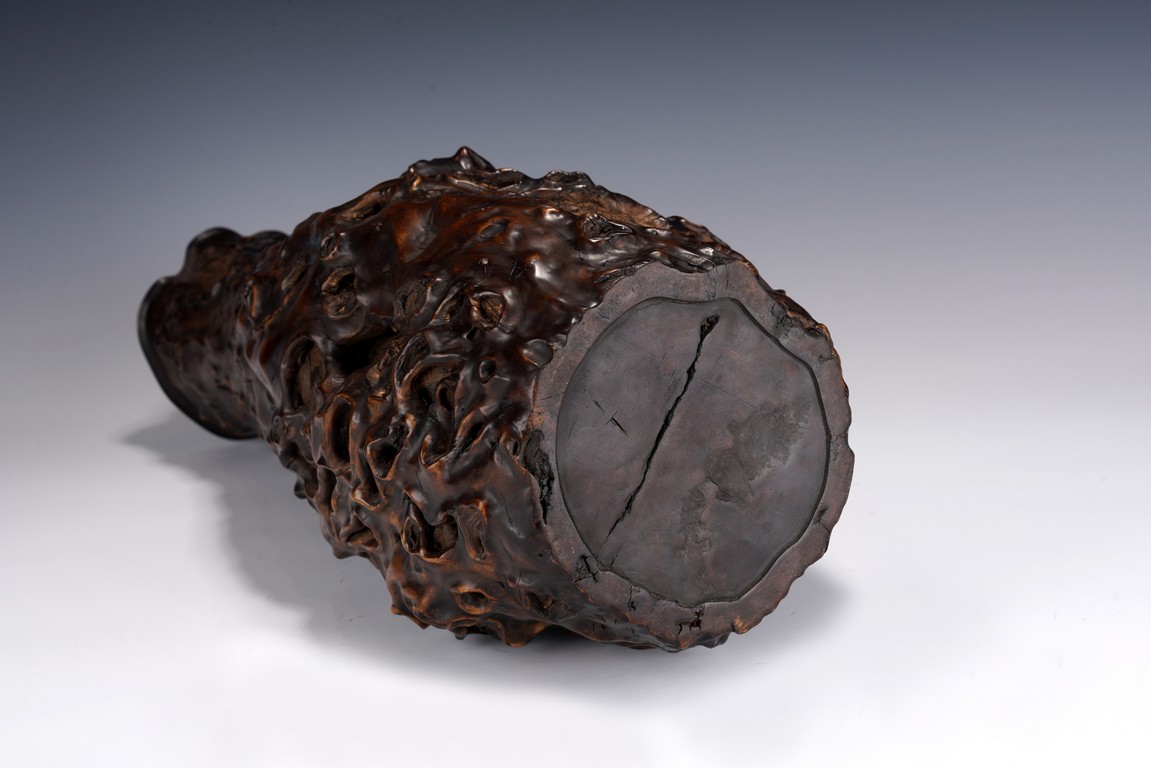 花瓶取天然木隨形雕造,作瓶之形制。撇口,長束頸,溜肩,鼓腹下收,至底漸撇,平底。通體包漿均潤,腹部溝翯嶙峋,蟲眼孔洞密部,或大或小,天然成趣,與頸部的光素無紋對比顯明,相映成趣,文人氣息濃厚。 來源:三藩市私人家族收藏 Provenance: Property from a family collection in San Francisco, California