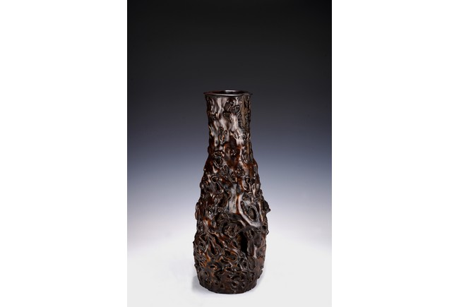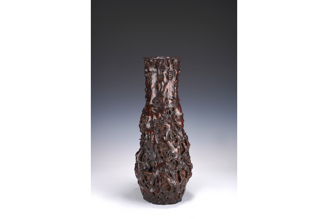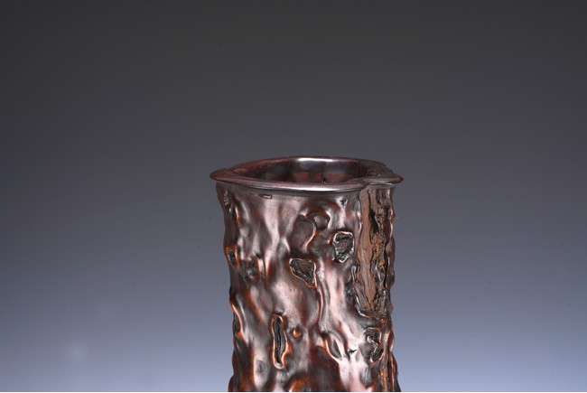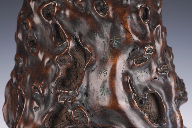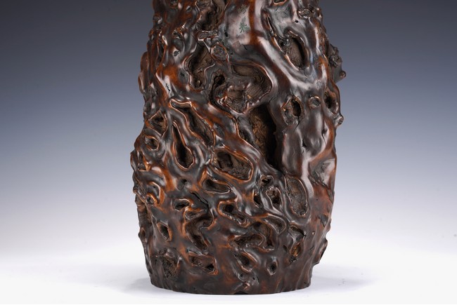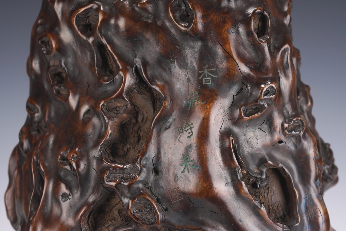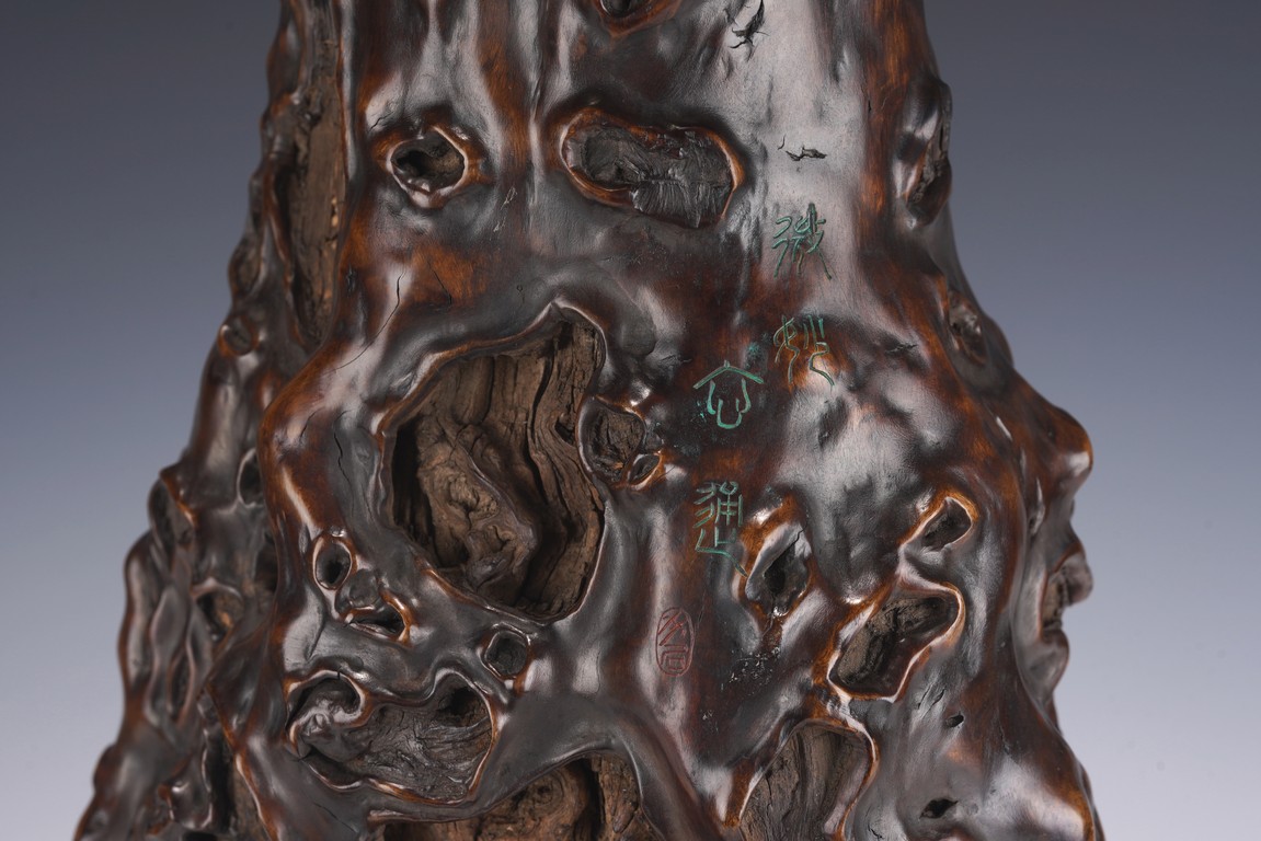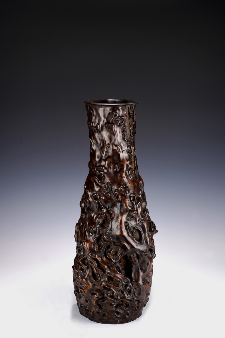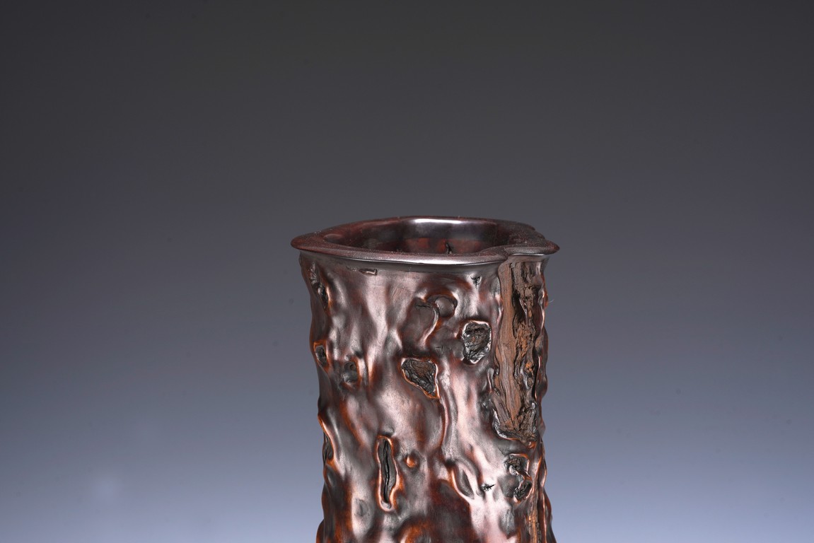 花瓶取天然木隨形雕造,作瓶之形制。撇口,長束頸,溜肩,鼓腹下收,至底漸撇,平底。通體包漿均潤,腹部溝翯嶙峋,蟲眼孔洞密部,或大或小,天然成趣,與頸部的光素無紋對比顯明,相映成趣,文人氣息濃厚。 來源:三藩市私人家族收藏 Provenance: Property from a family collection in San Francisco, California