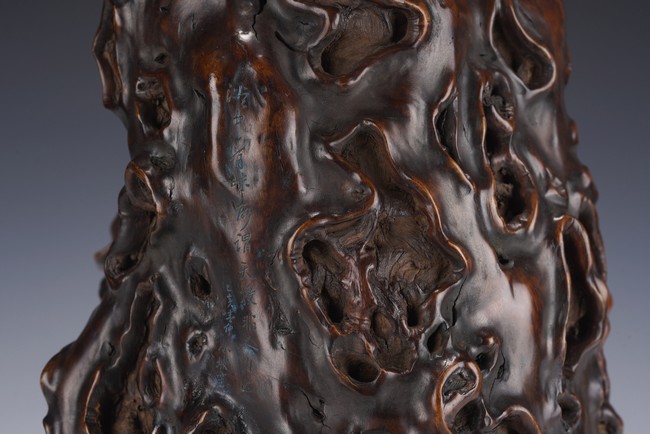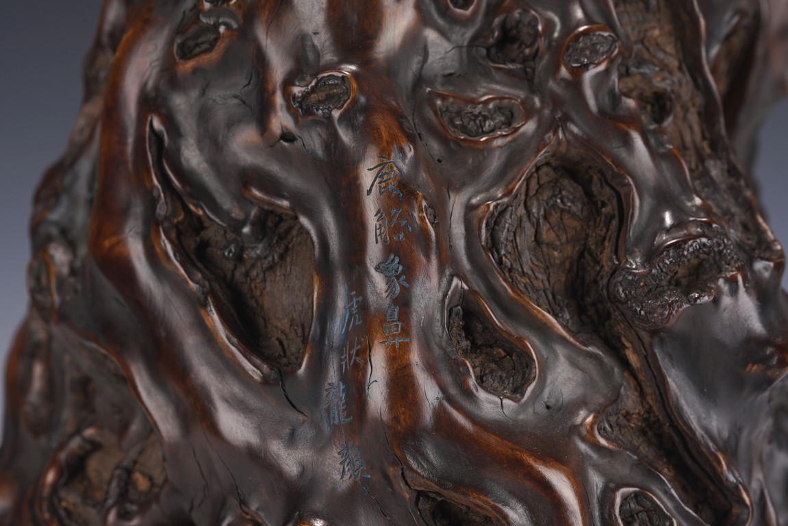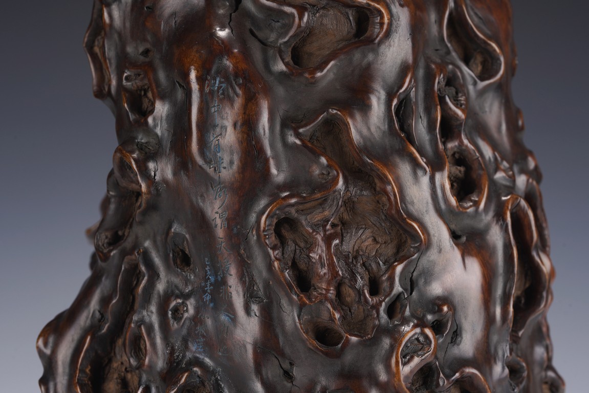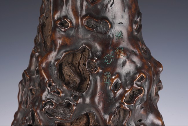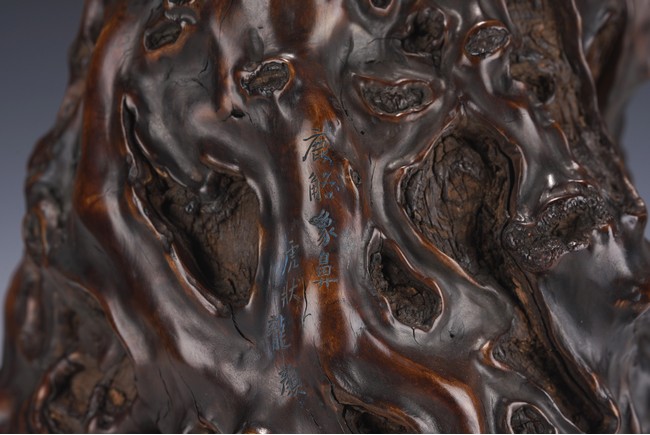 Qing Dynasty period. The the naturally formed body with whorls and knots, carved with four character inscriptions, the interior hollowed.