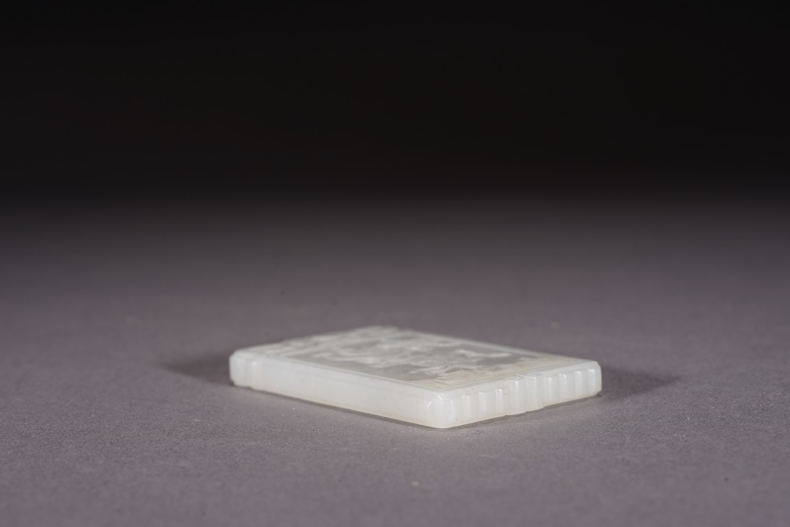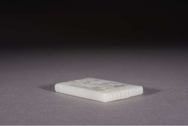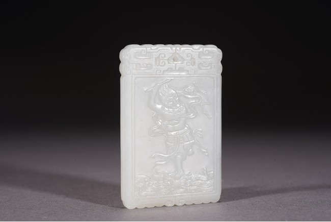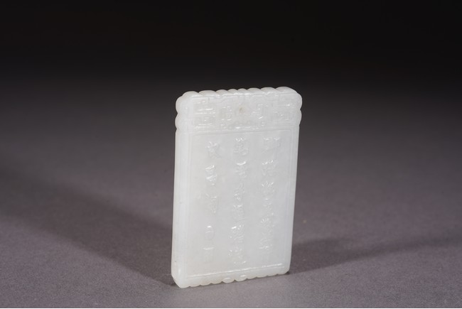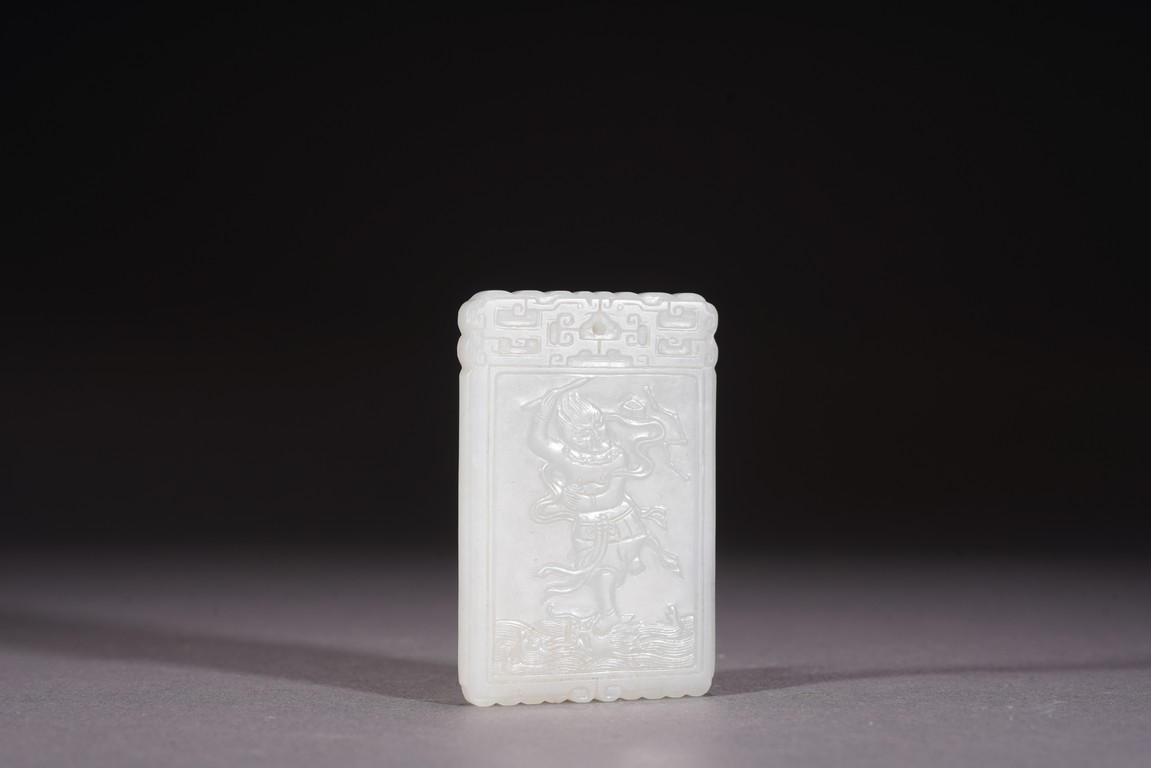 Qing Dynasty period. Of rectangular form, one face decorated with the kui star standing over the sea, the reverse carved with a poetic inscription and ending with two seal marks, all below two archaistic dragons, the stone of an even white color.