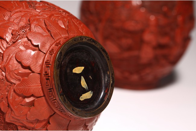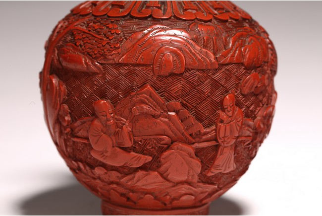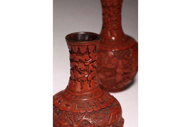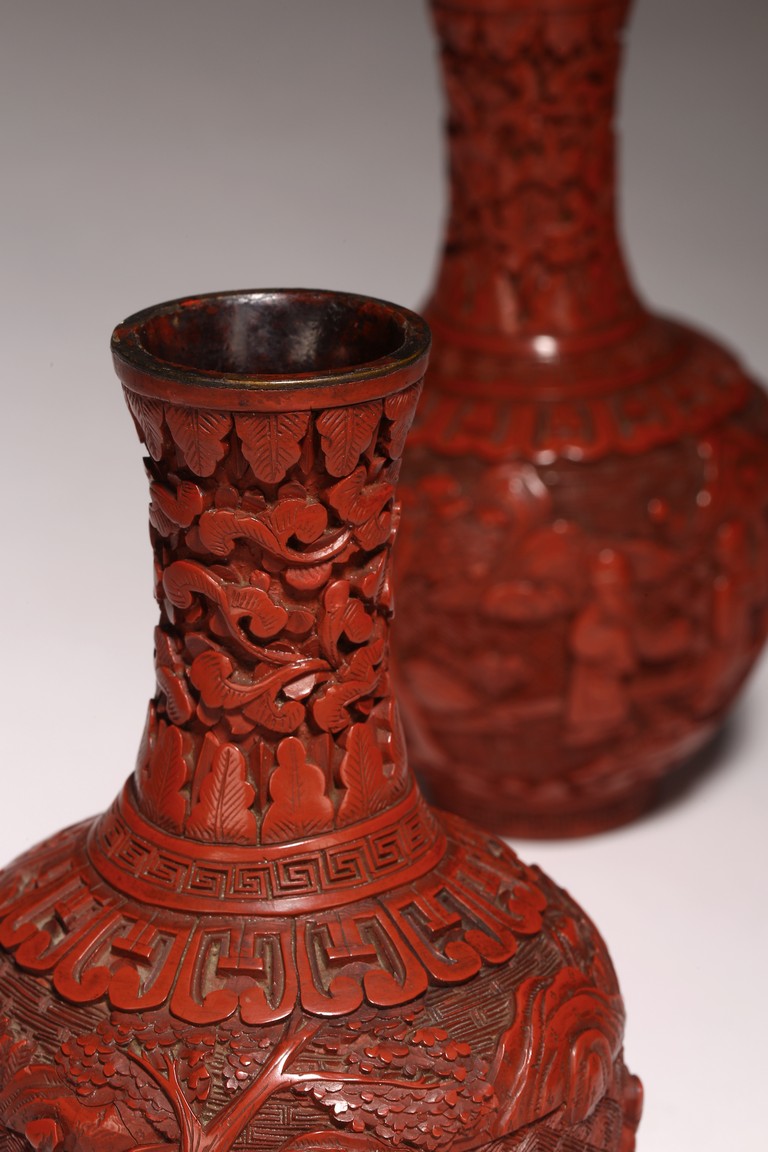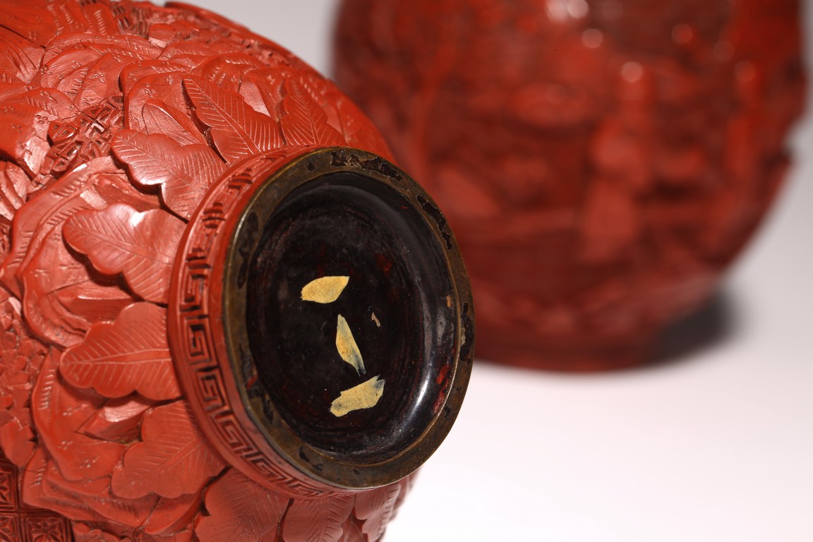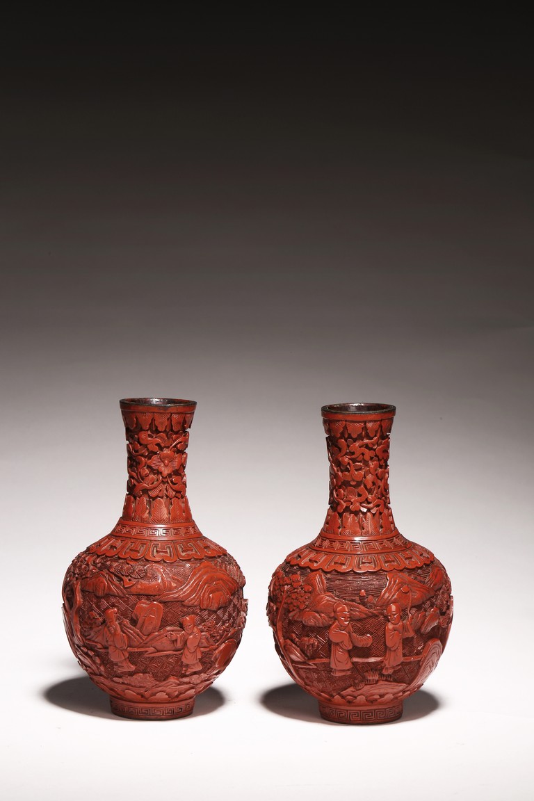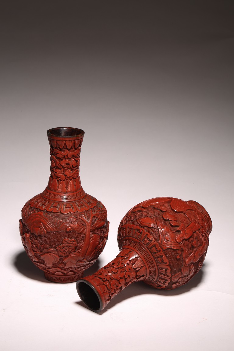 微敞口,束頸,鼓腹下收,圈足,剔漆深厚,漆色鮮艷,包漿亮麗,色澤深紅,頸部刻“蕉 葉紋”“花卉紋”,腹部刻“山水人物”,整體構圖布局豐富,紋飾線條飄逸自然,層次分明, 刀工細膩,運刀如筆,穩重典雅,成對保存完好。