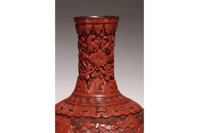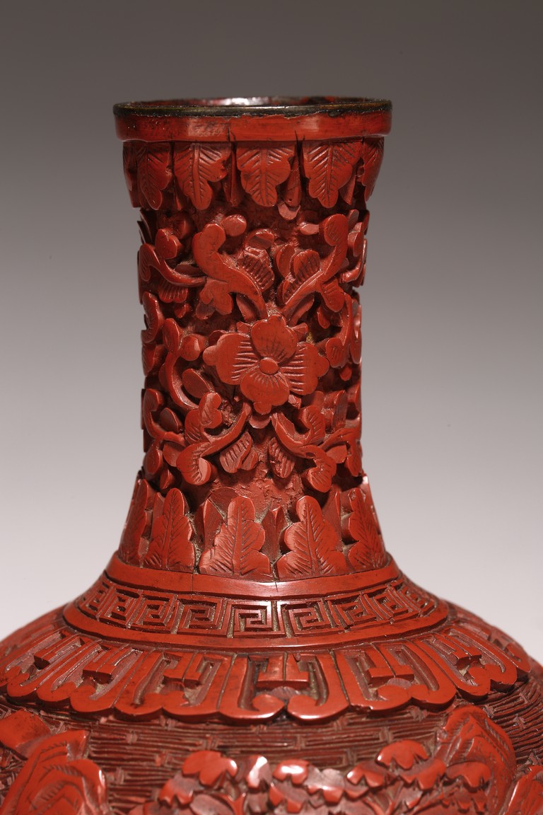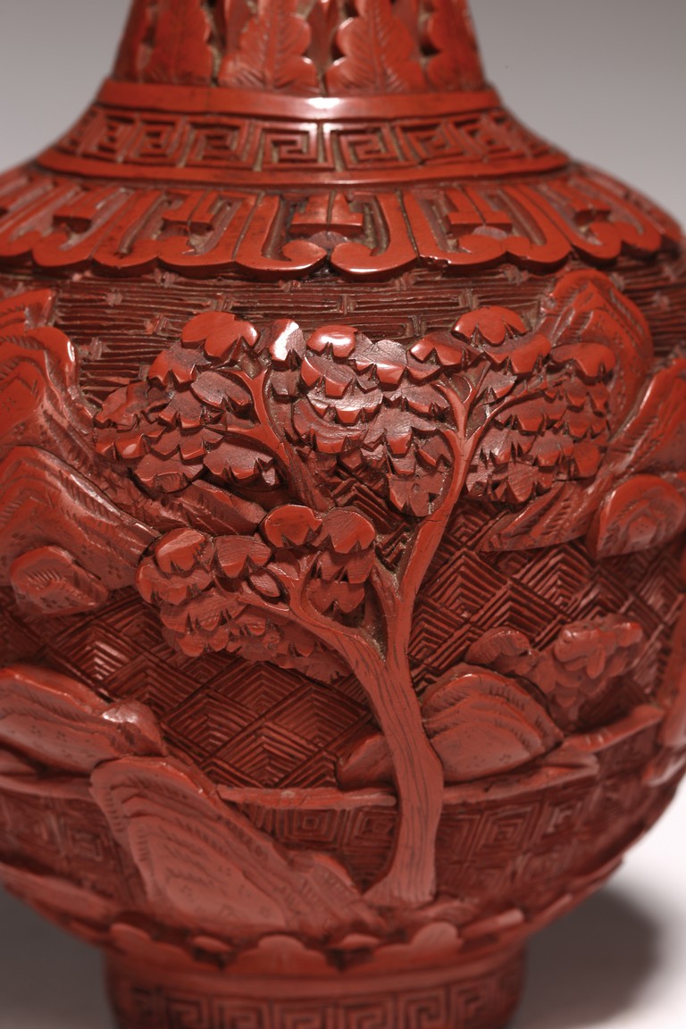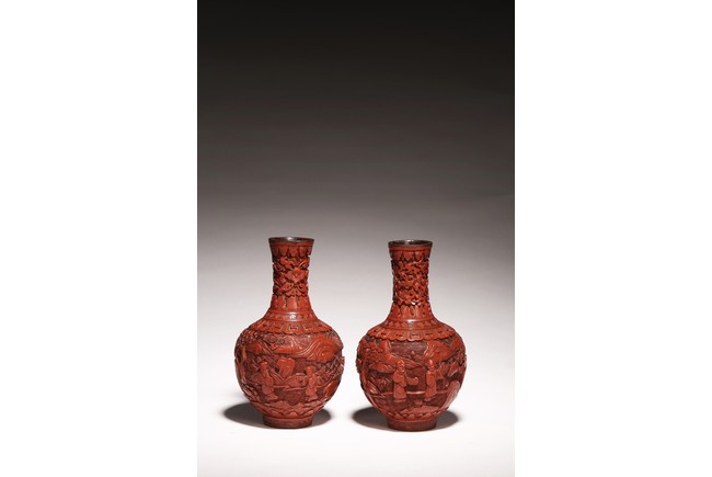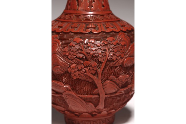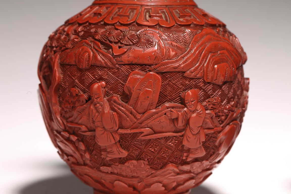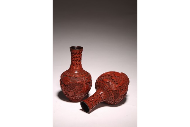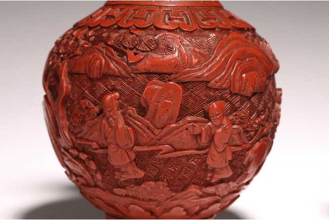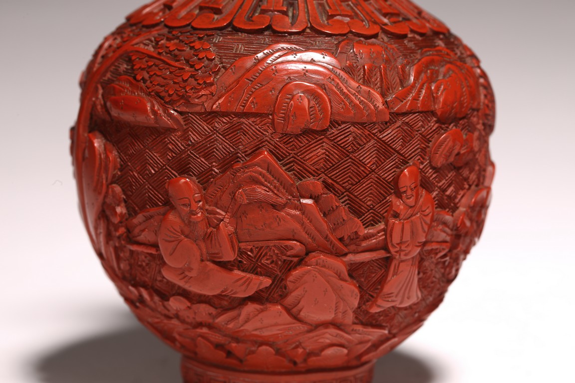 微敞口,束頸,鼓腹下收,圈足,剔漆深厚,漆色鮮艷,包漿亮麗,色澤深紅,頸部刻“蕉 葉紋”“花卉紋”,腹部刻“山水人物”,整體構圖布局豐富,紋飾線條飄逸自然,層次分明, 刀工細膩,運刀如筆,穩重典雅,成對保存完好。